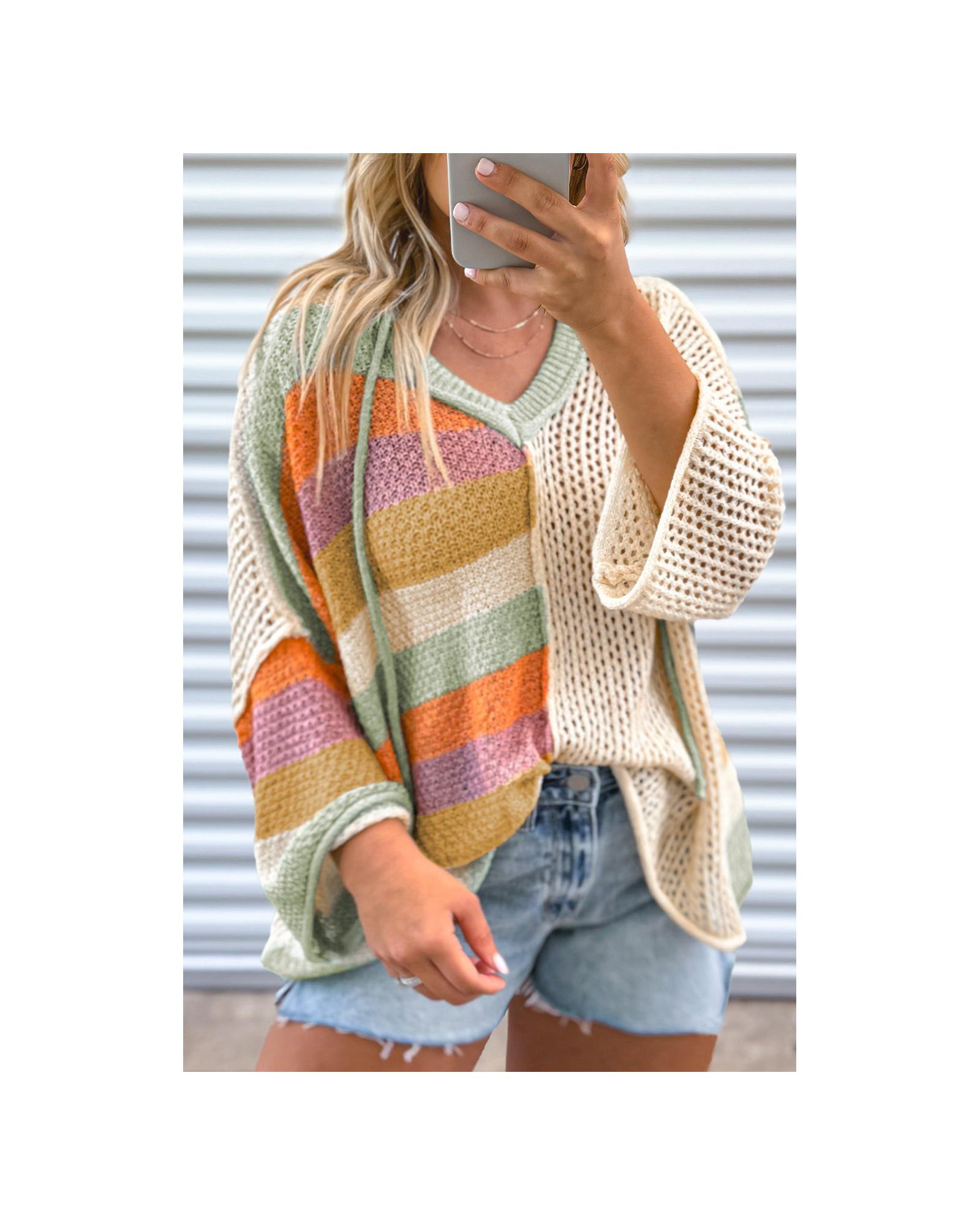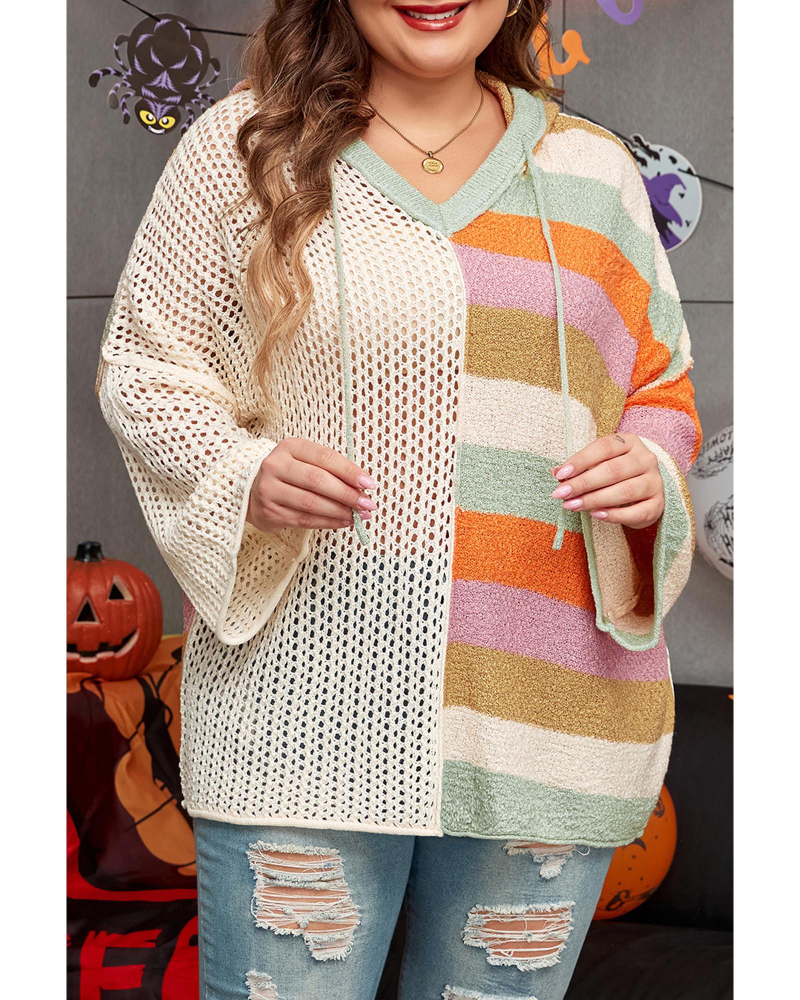 Beige Pointelle Knit Colorblock Patchwork V Neck Hooded Plus Sweater – 2X