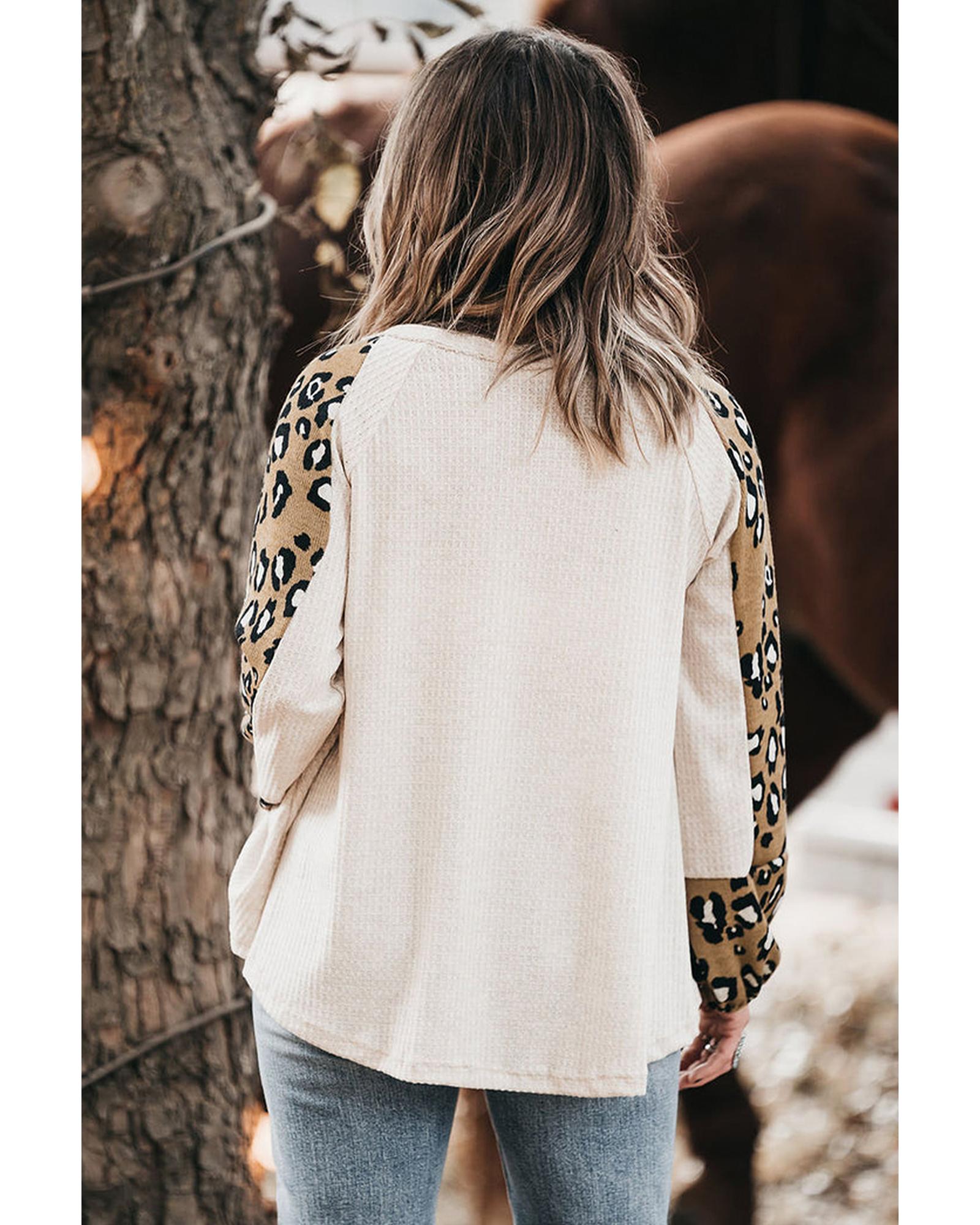 Beige Printed Plus Size Waffle Knit Contrast Leopard Long Sleeve Top – 1X