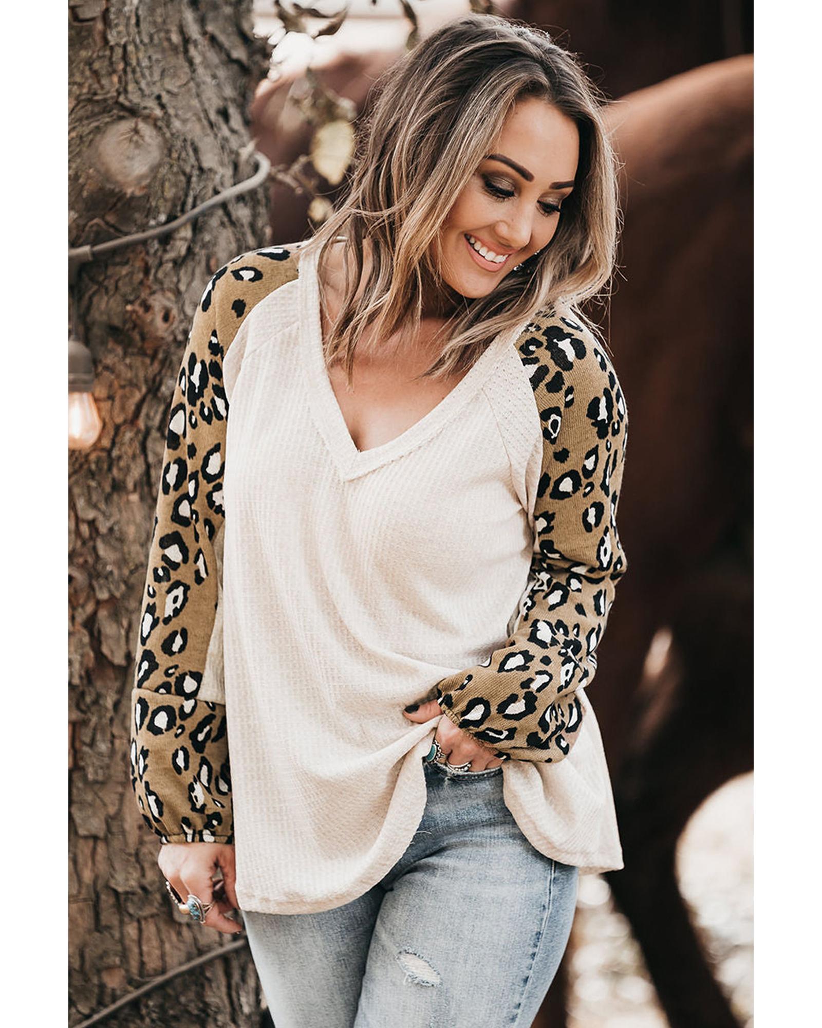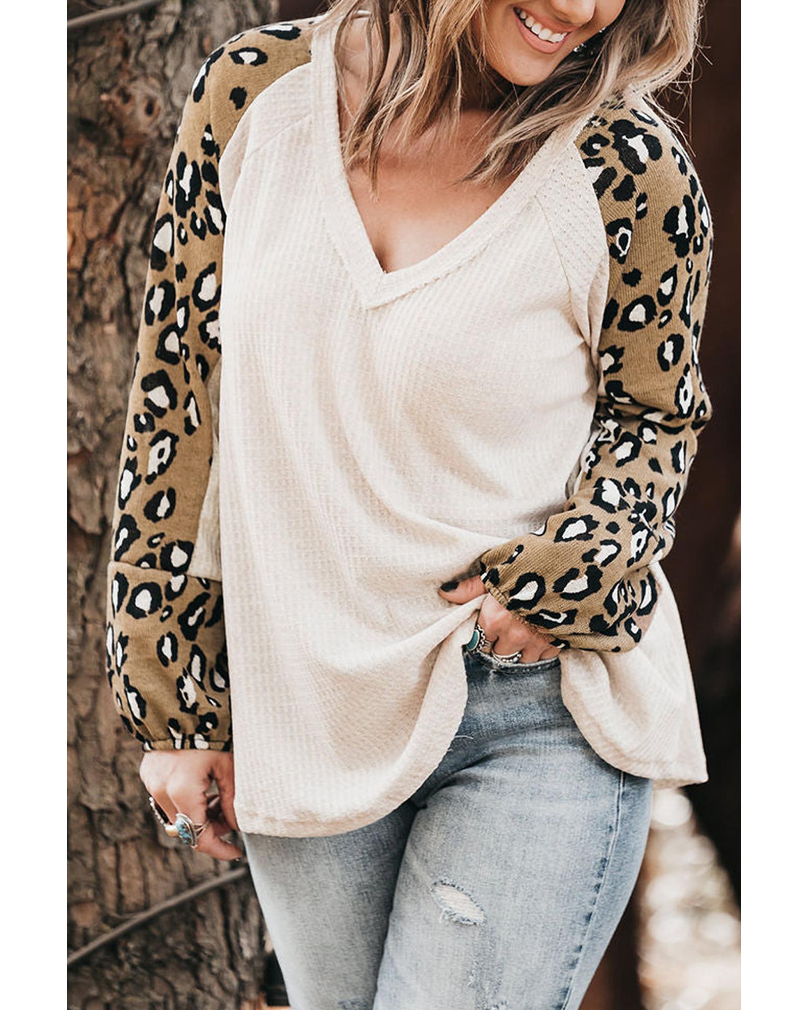 Beige Printed Plus Size Waffle Knit Contrast Leopard Long Sleeve Top – 2X