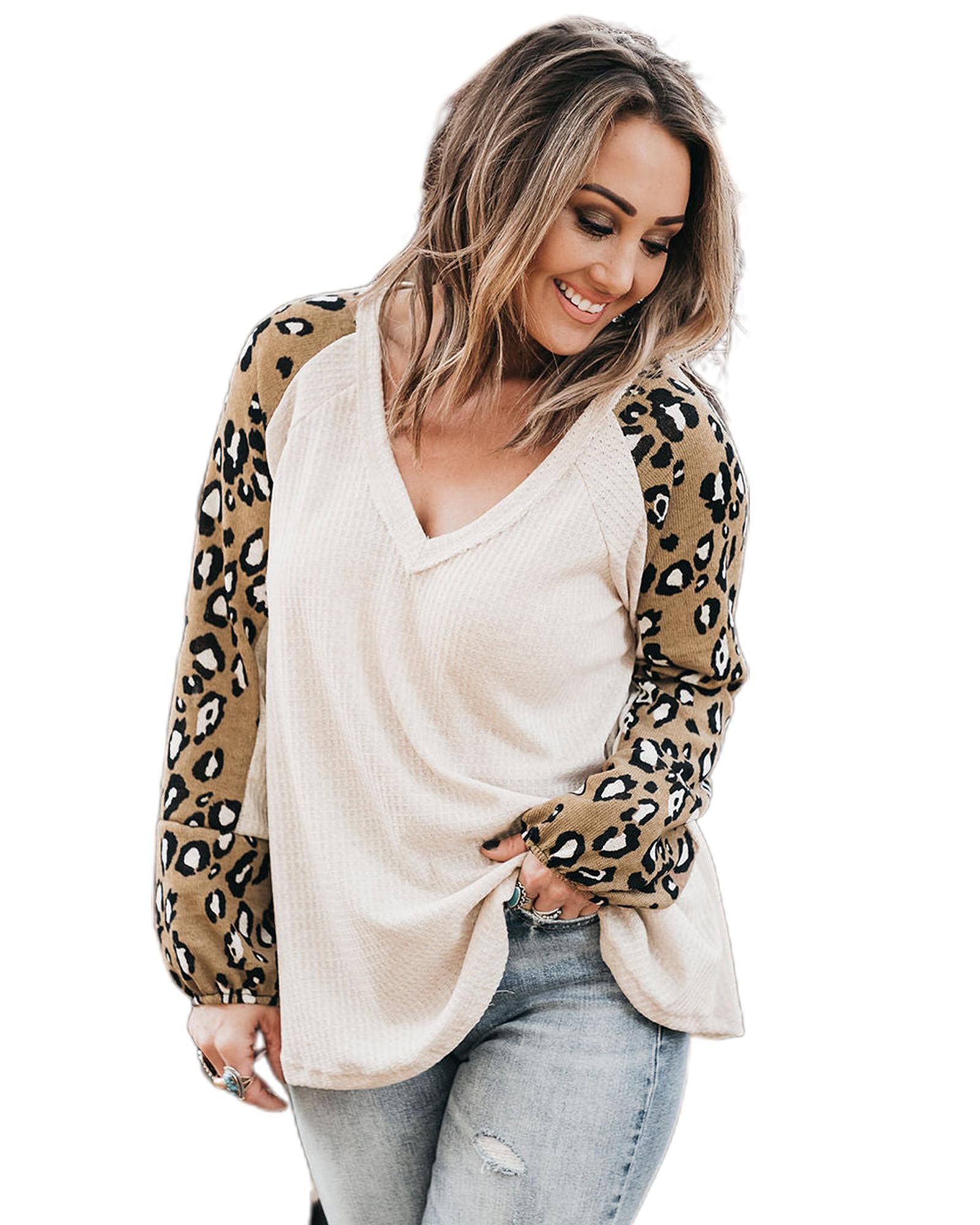 Beige Printed Plus Size Waffle Knit Contrast Leopard Long Sleeve Top – 3X