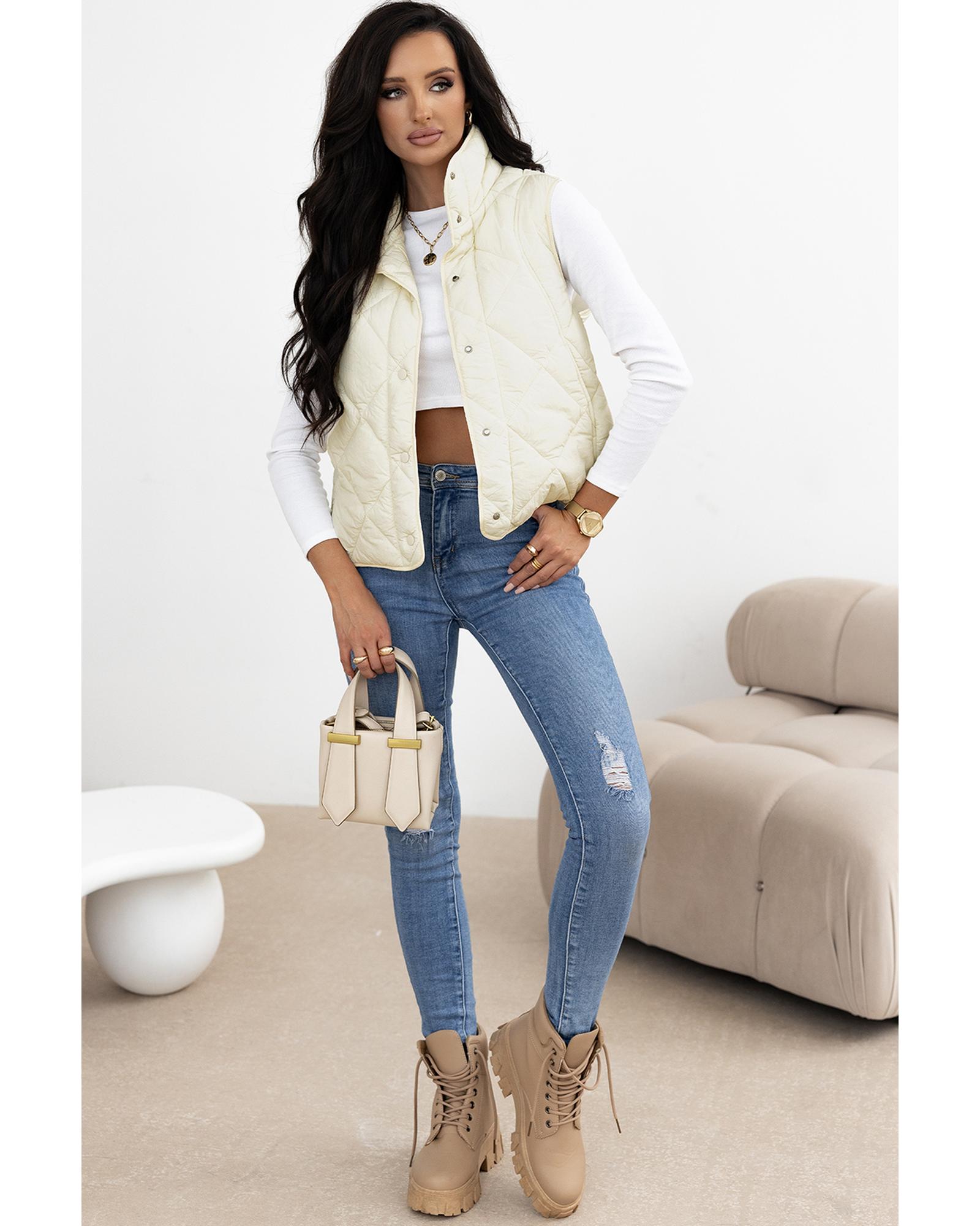 Beige Quilted High Neck Button Up Pocket Vest Coat – S