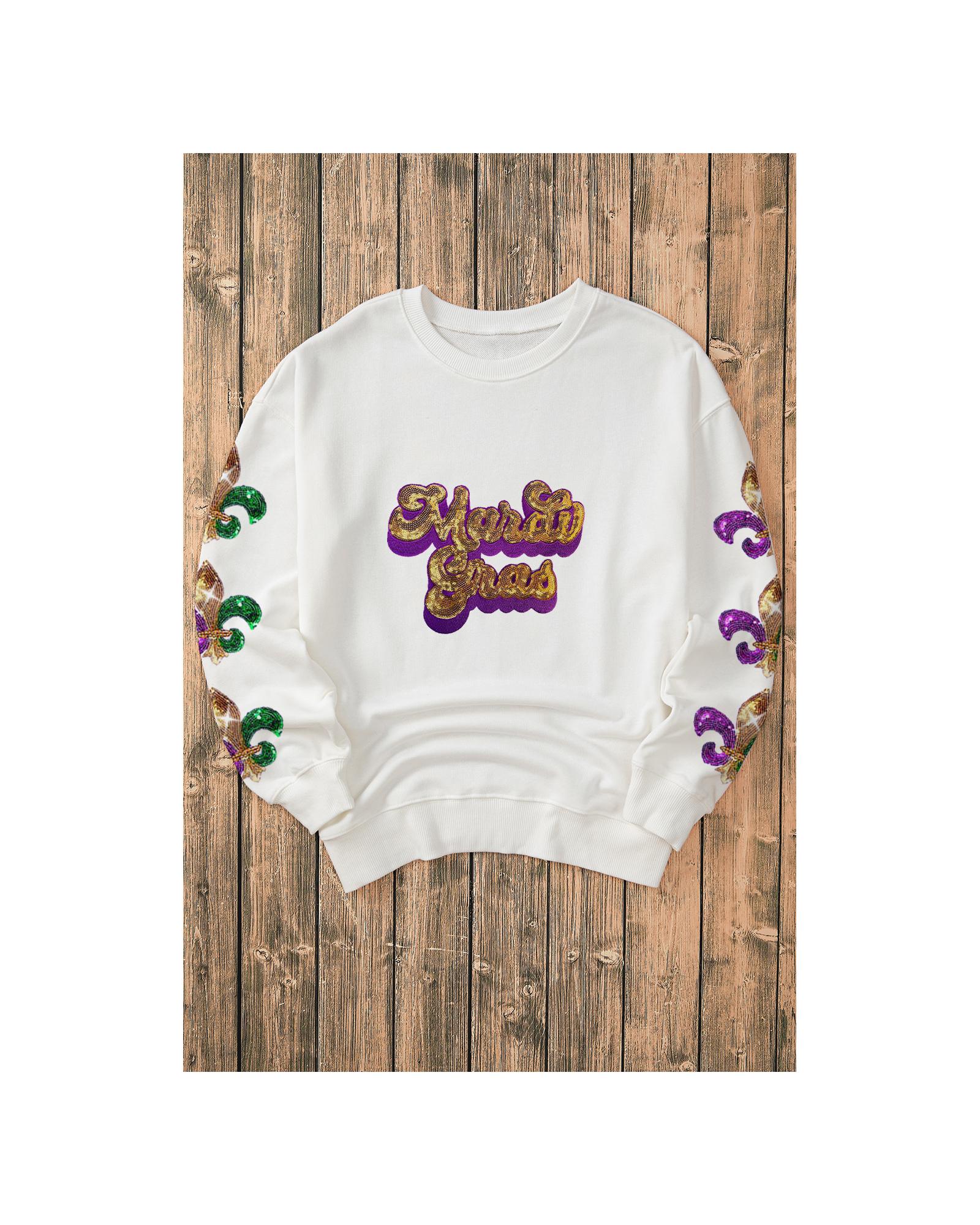 - Beige Sequin Mardi Gras Patched Pattern Fleur de Lis Sleeve Sweatshirt