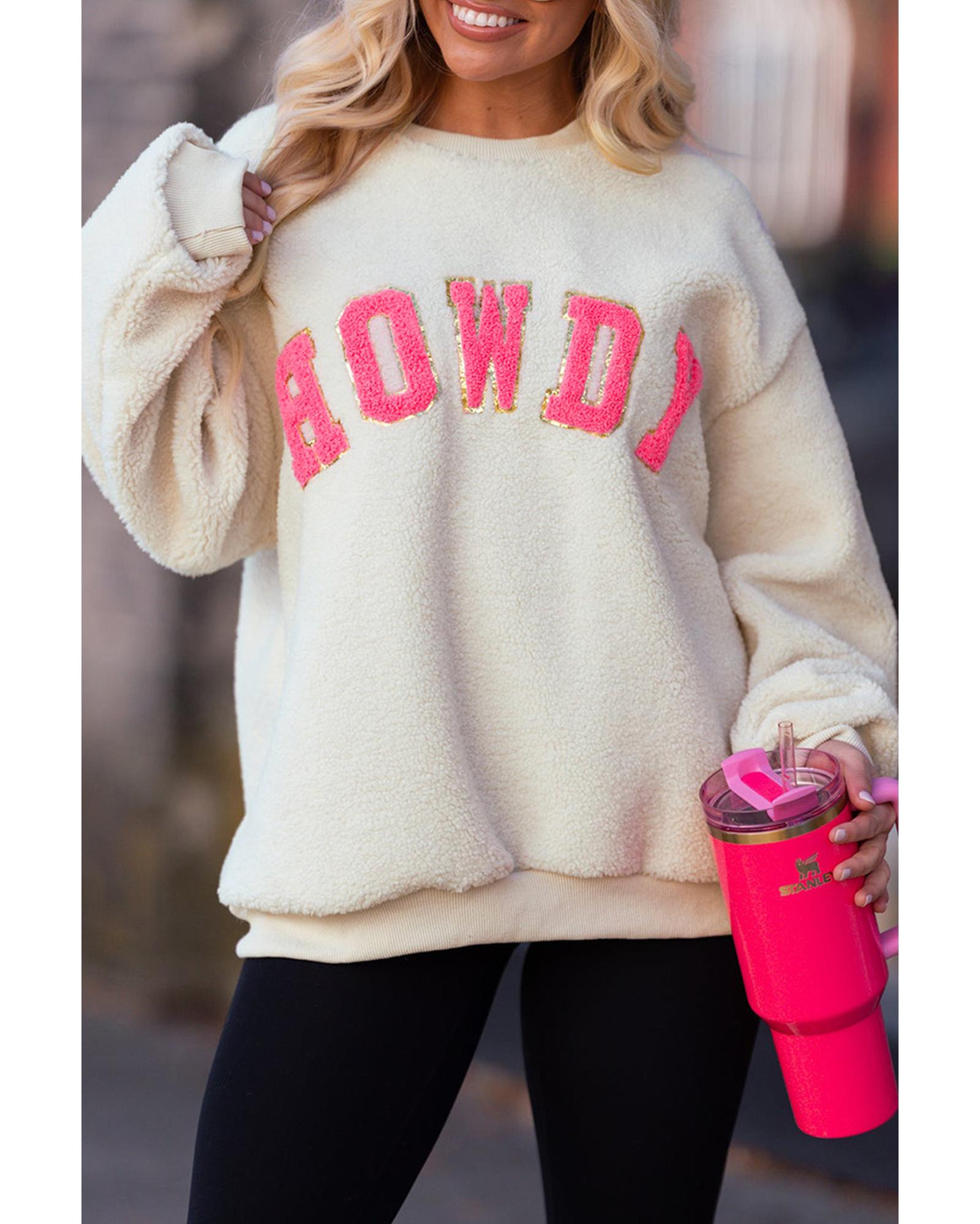 - Beige Sherpa HOWDY Patched Pullover Sweatshirt