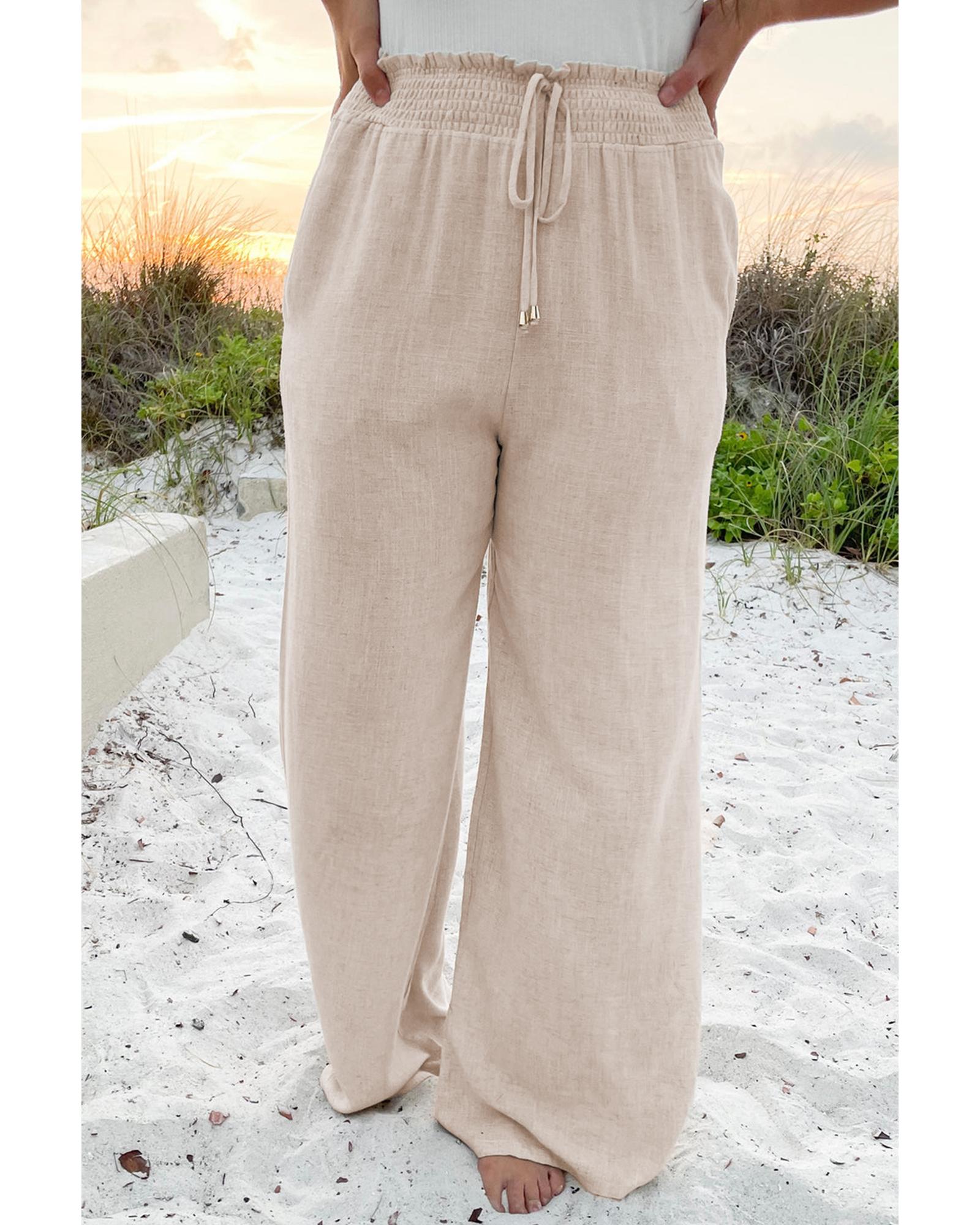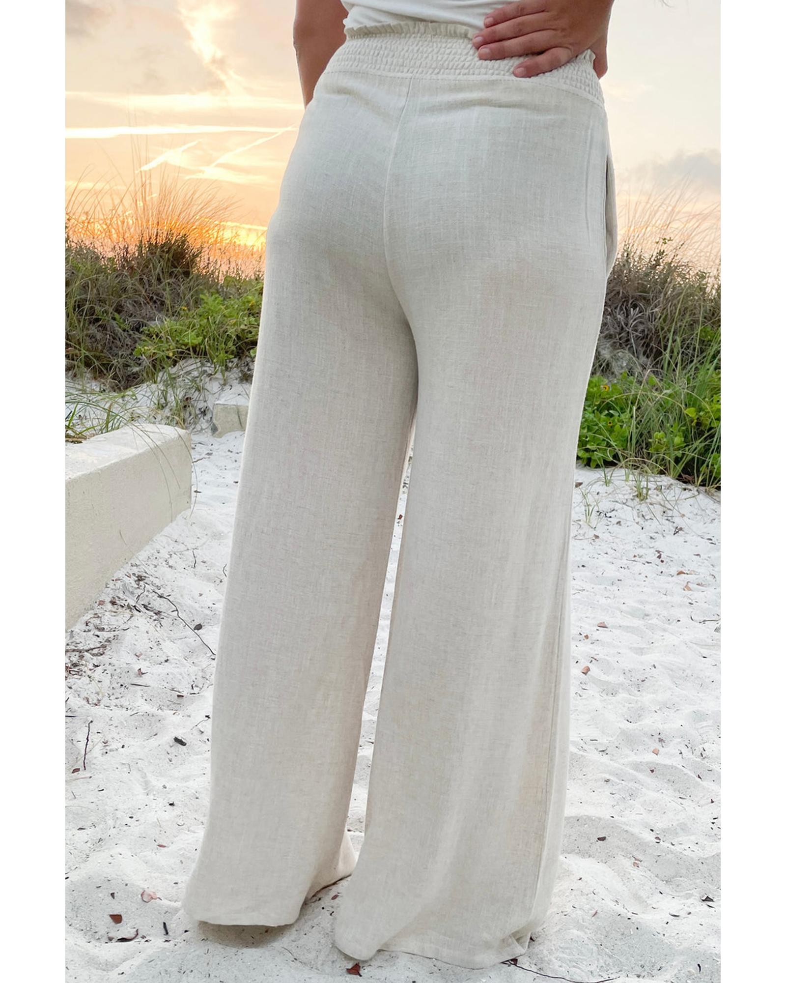 Beige Smocked High Waist Wide Leg Plus Size Pants – 1X