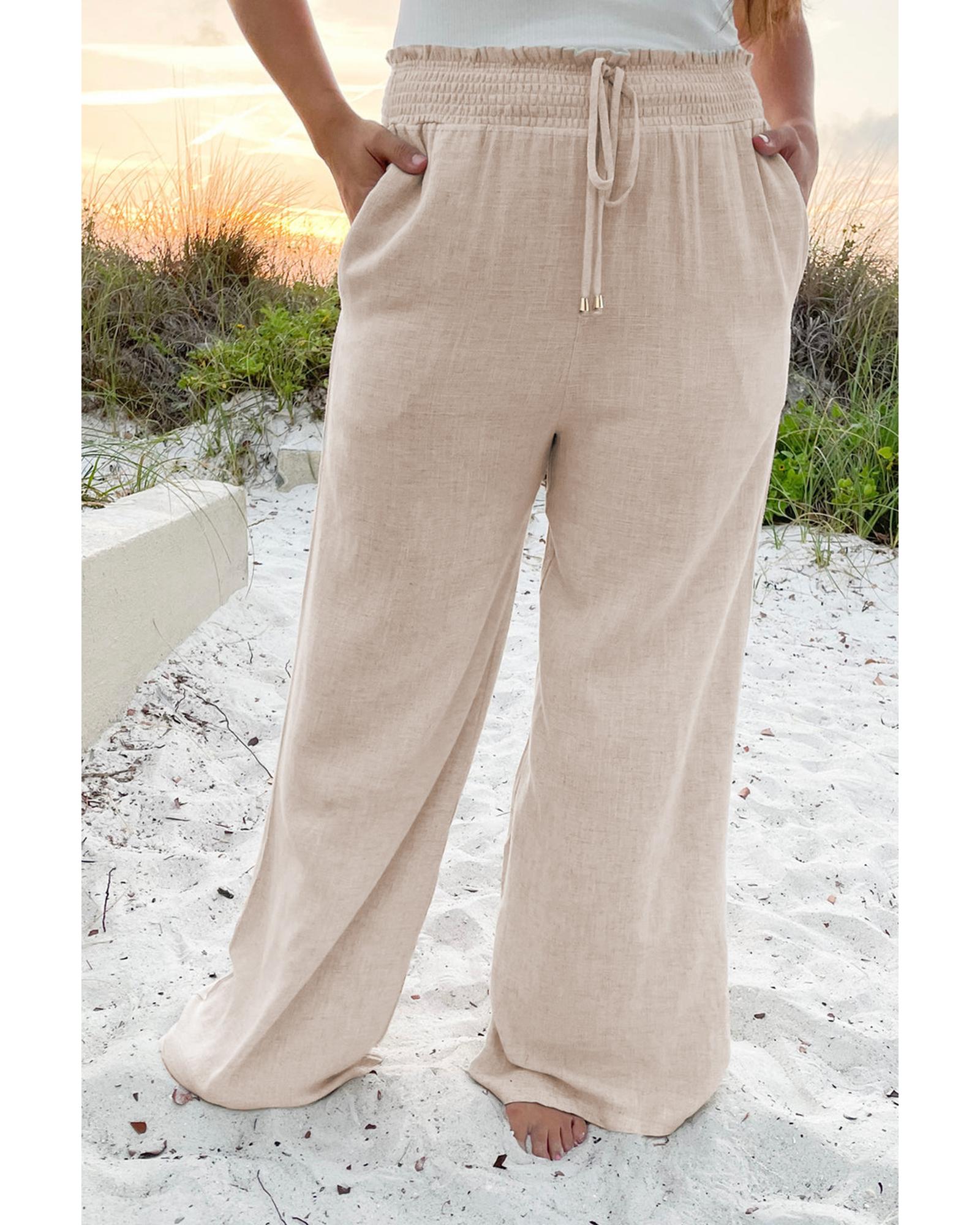 Beige Smocked High Waist Wide Leg Plus Size Pants – 3X