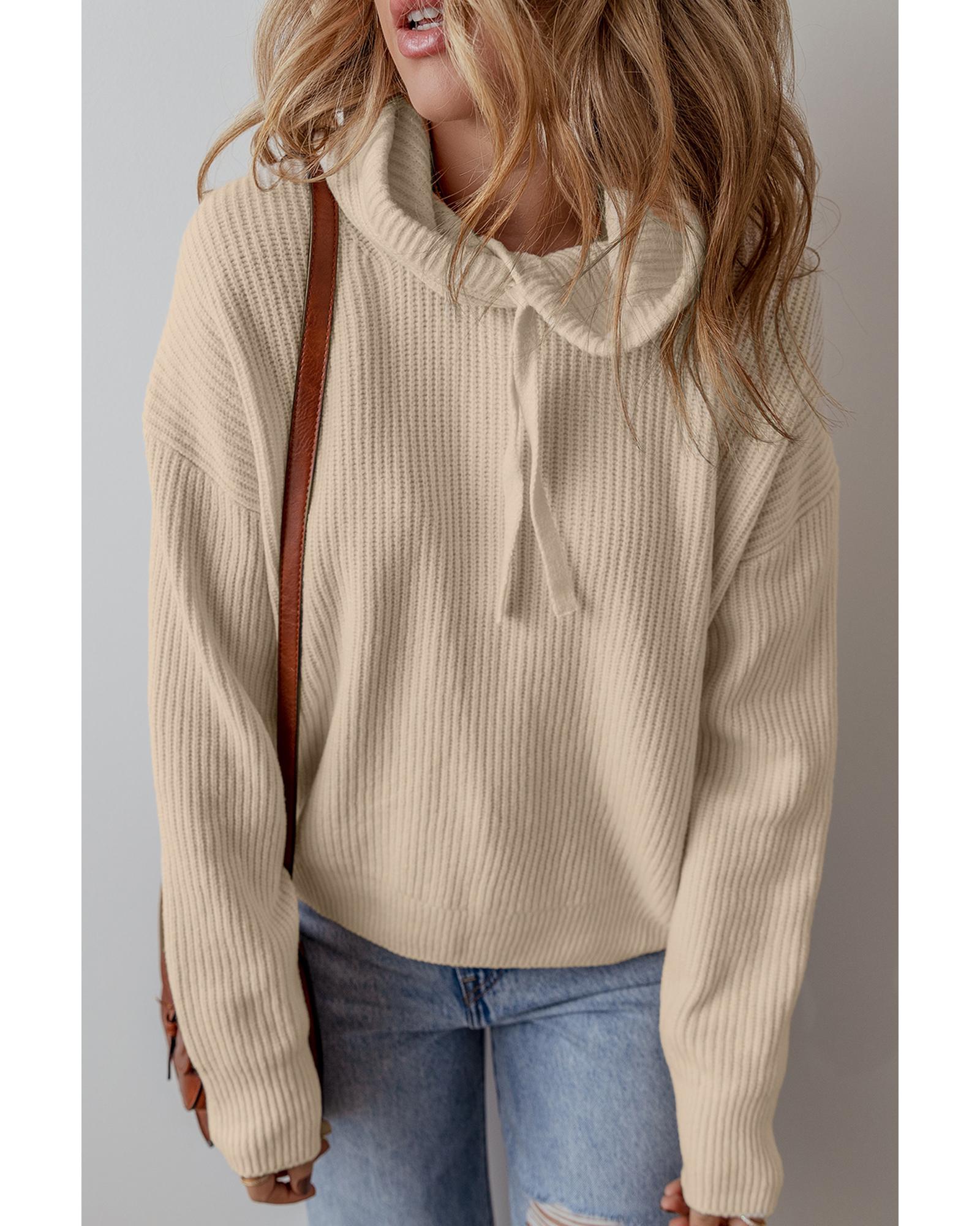 Beige Solid Color Drawstring Hooded Drop Shoulder Pullover Sweater – M