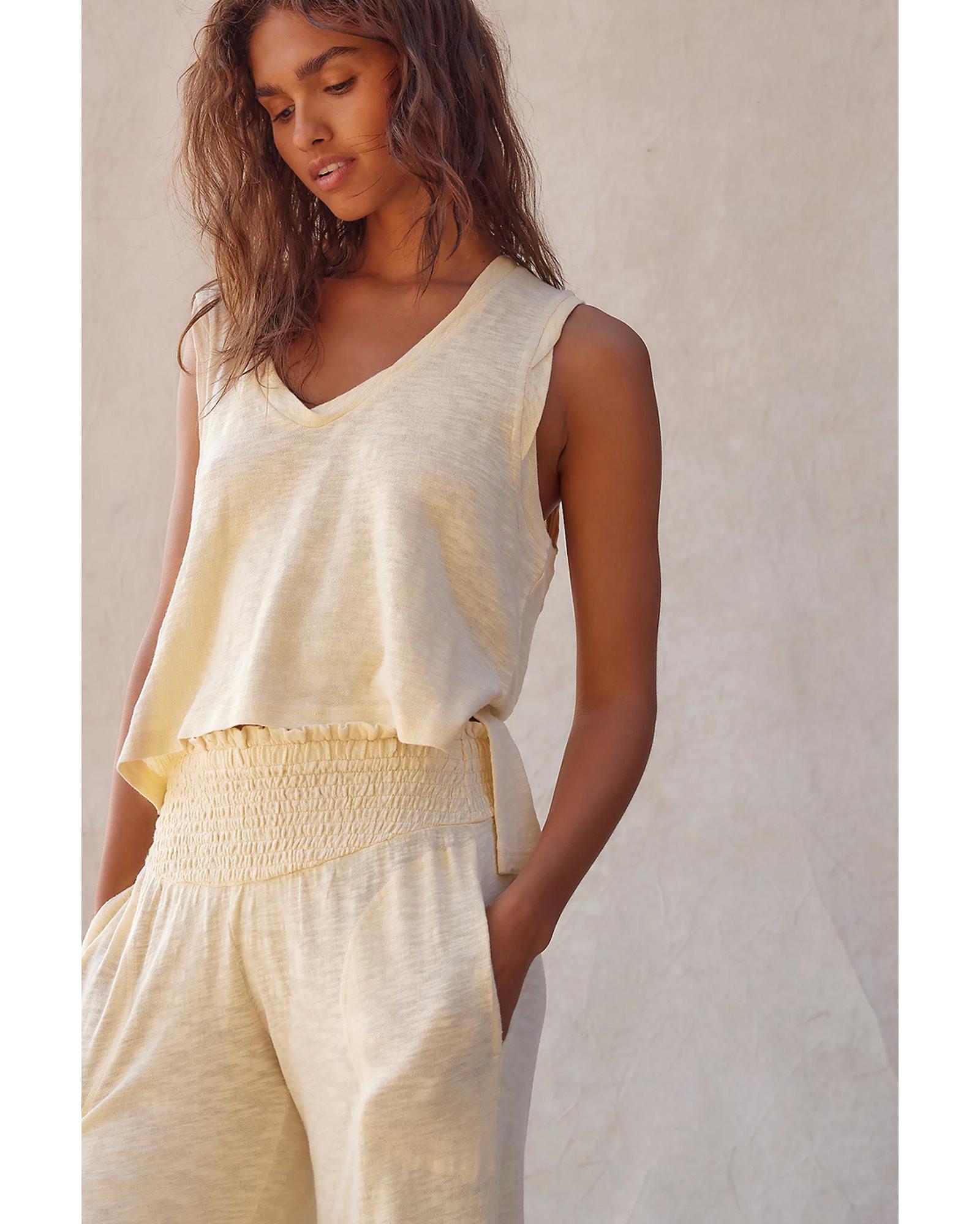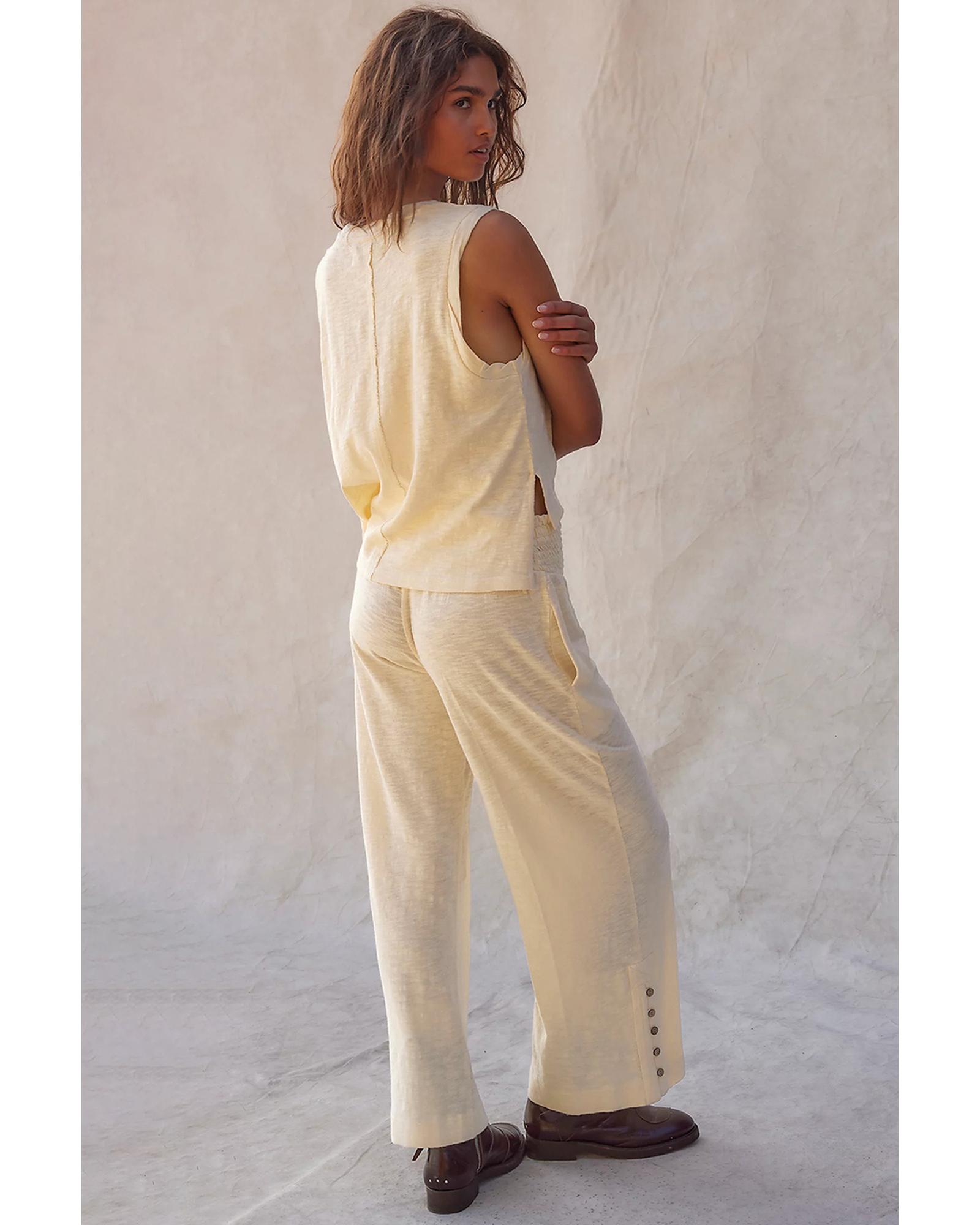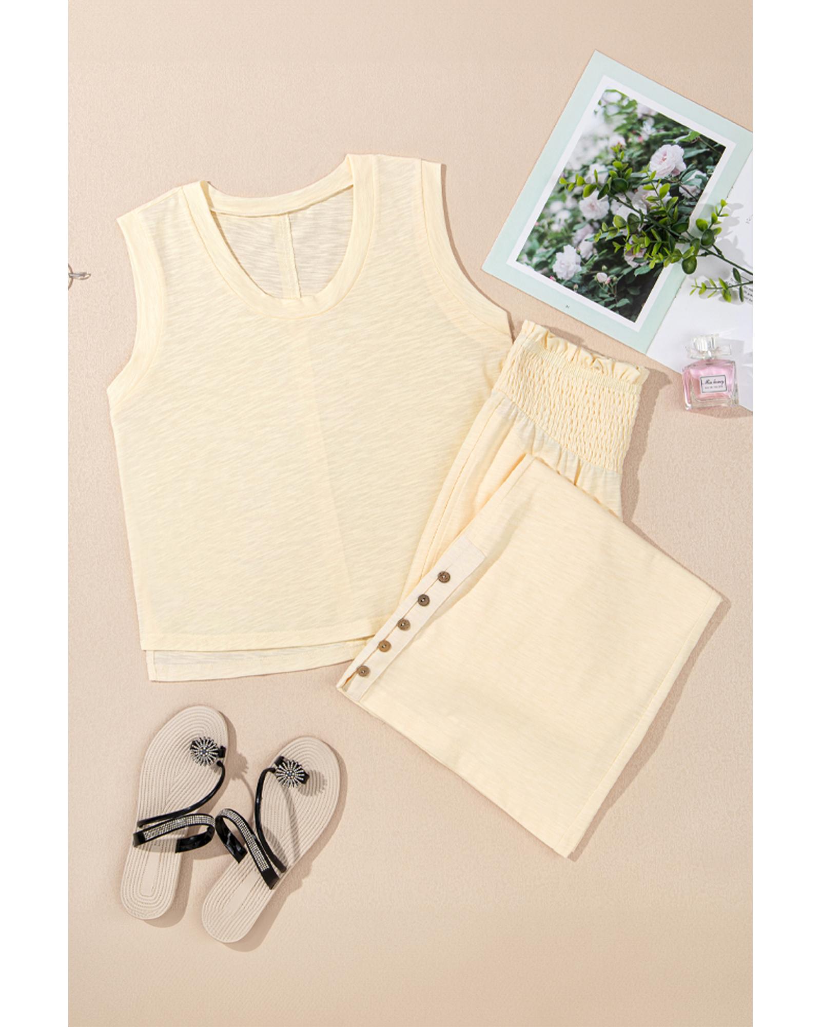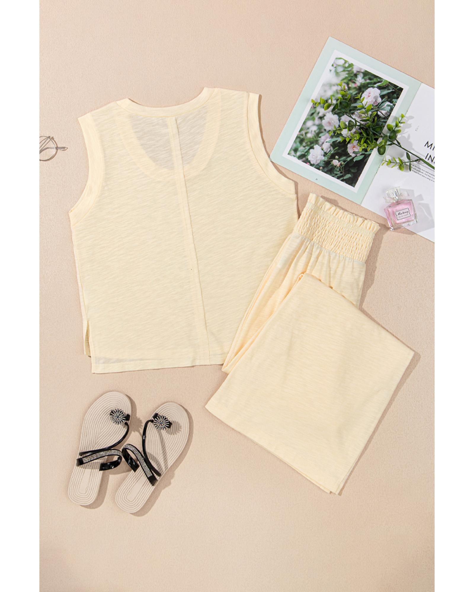 - Beige solid color tank top and smocked waist pants set