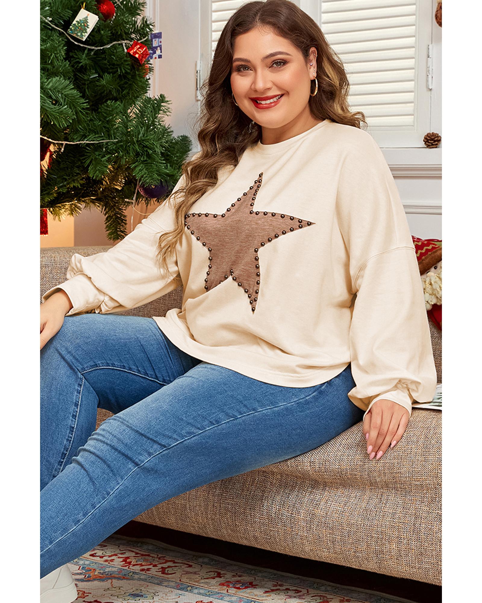 Beige Star Shape Studded Crew Neck Plus Size T Shirt – 1X