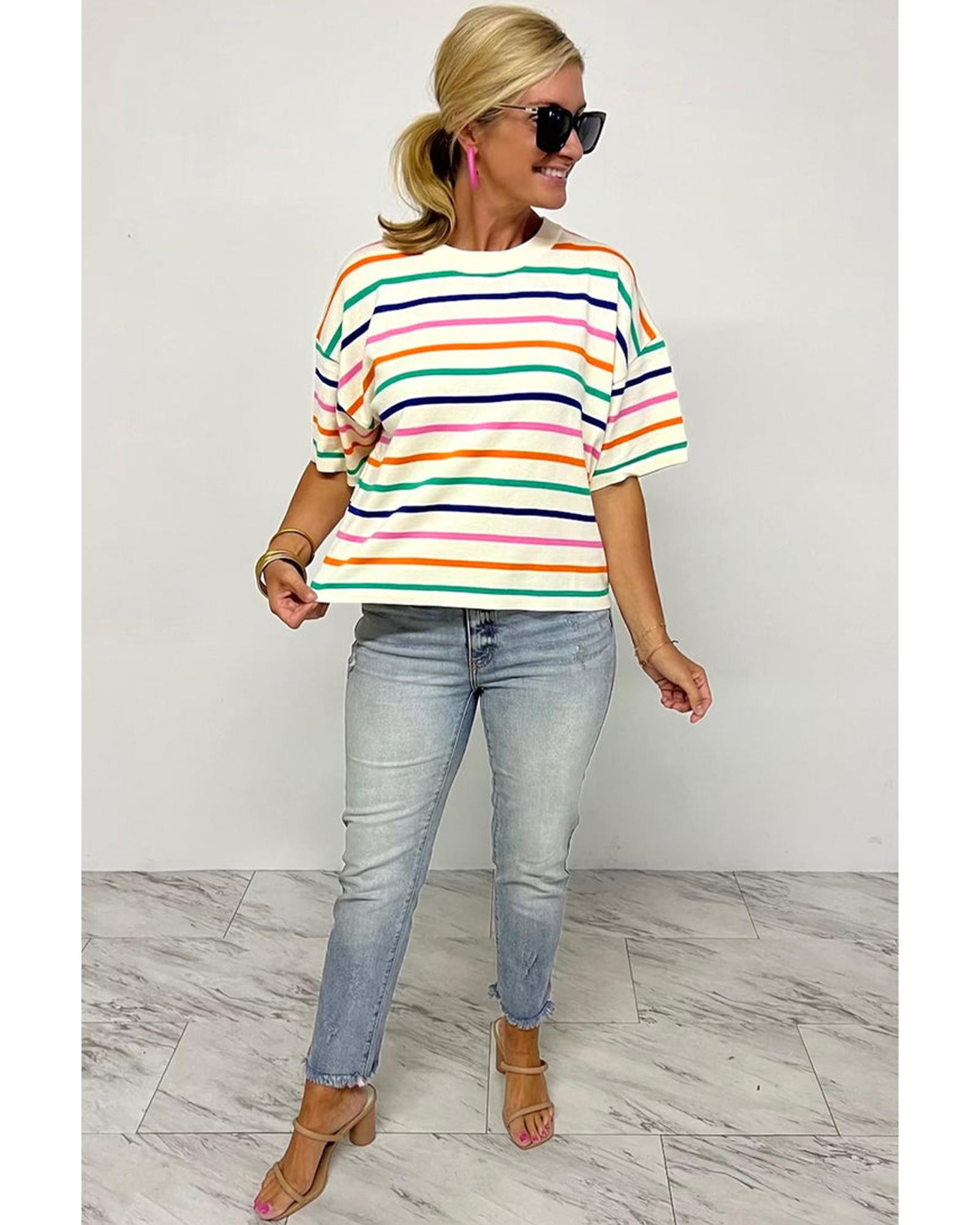 Beige Stripe Dropped Short Sleeve Boxy Fit Knitted Top – L