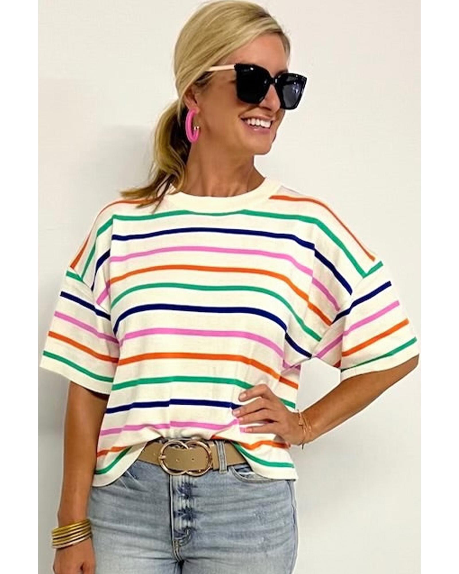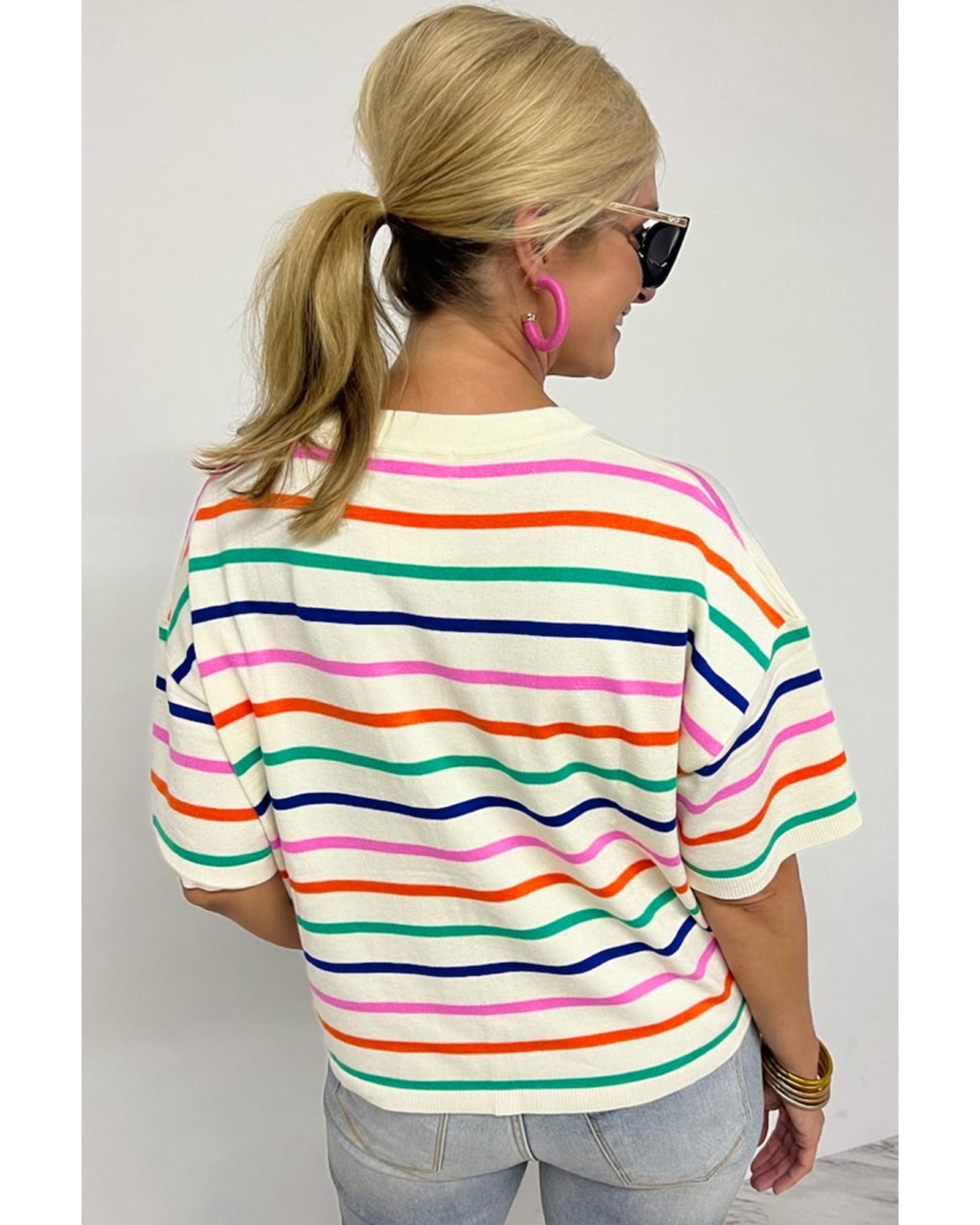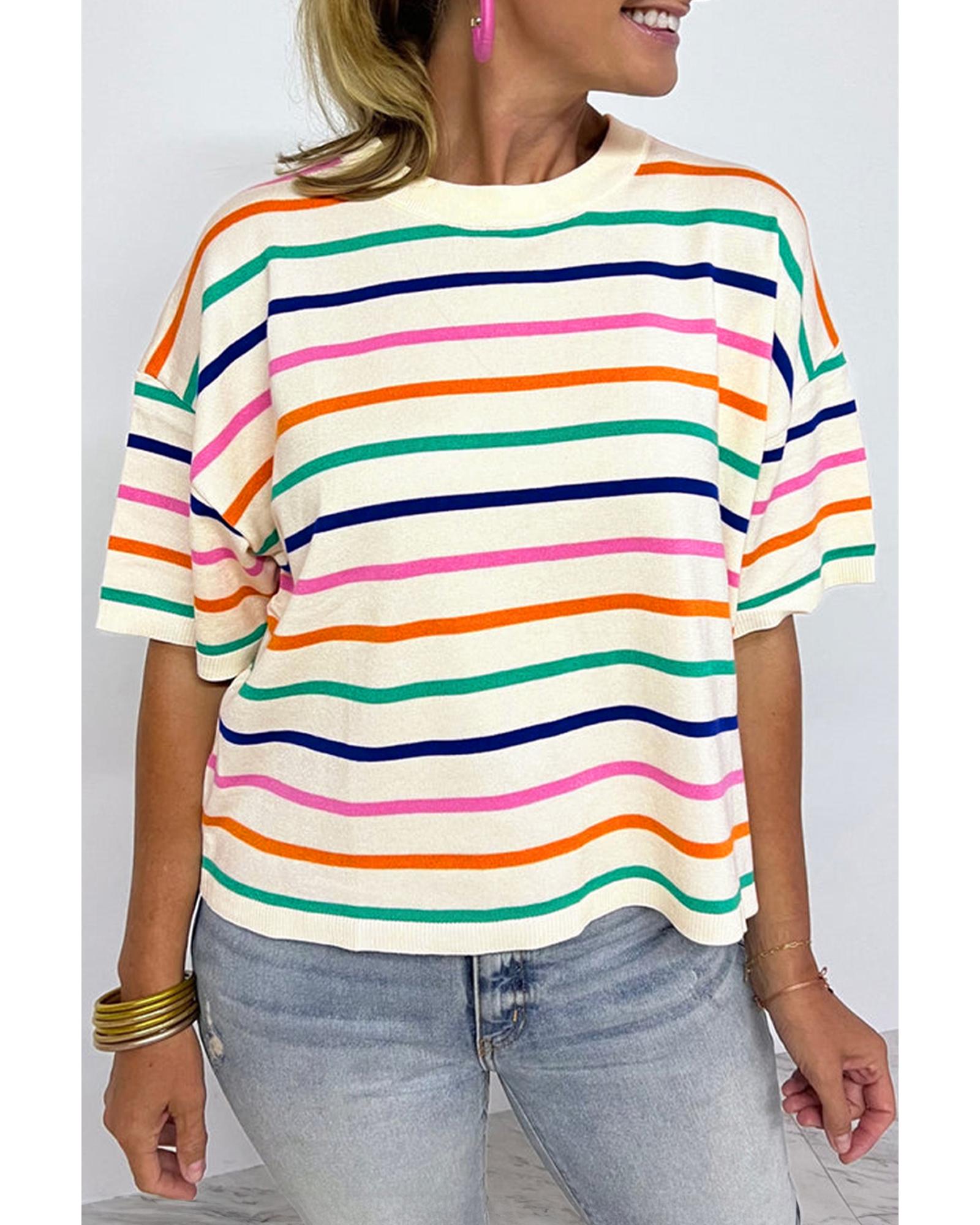 Beige Stripe Dropped Short Sleeve Boxy Fit Knitted Top – S