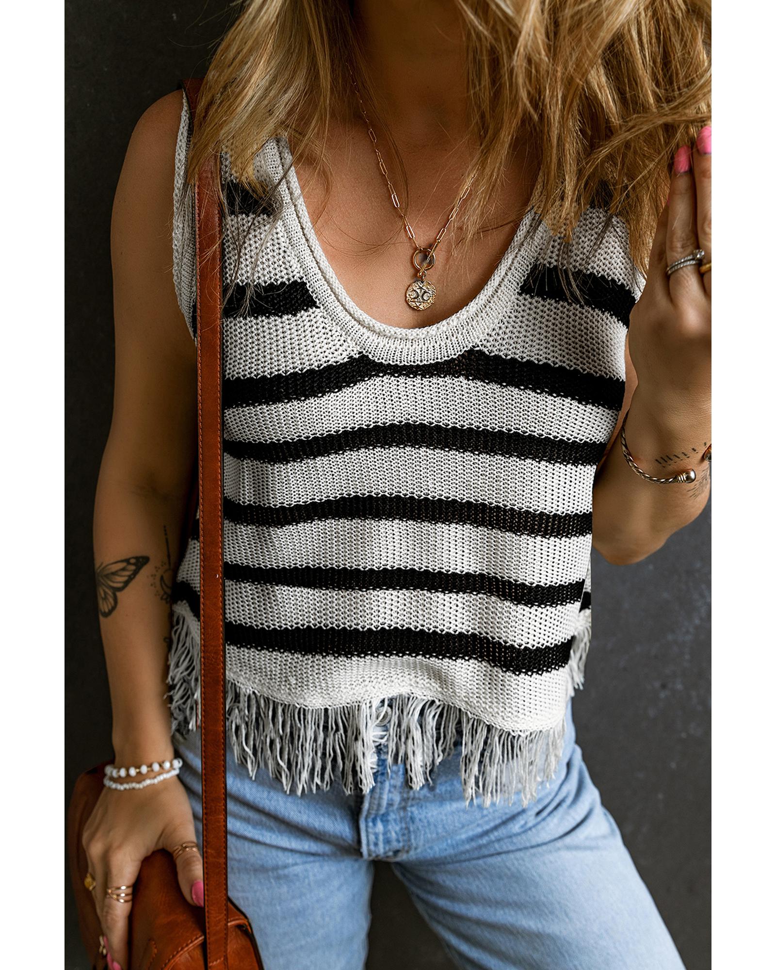 Beige Stripe Loose Knit Fringe Tank Top – 2XL