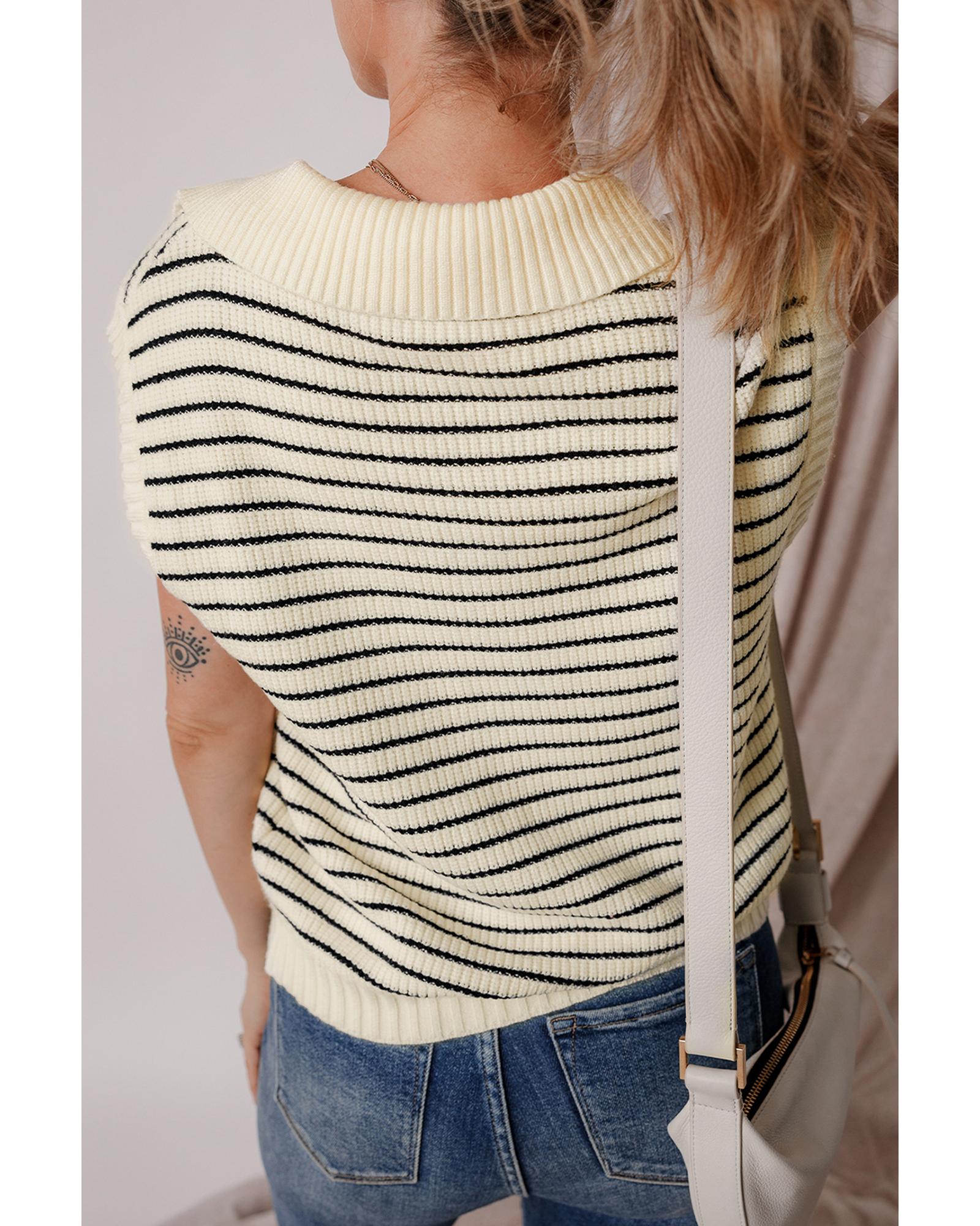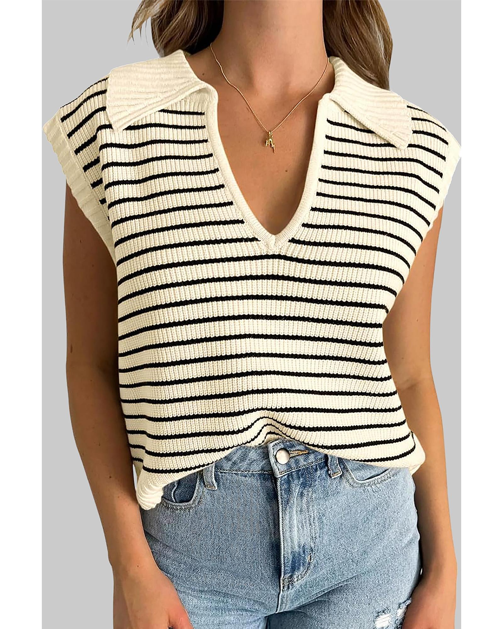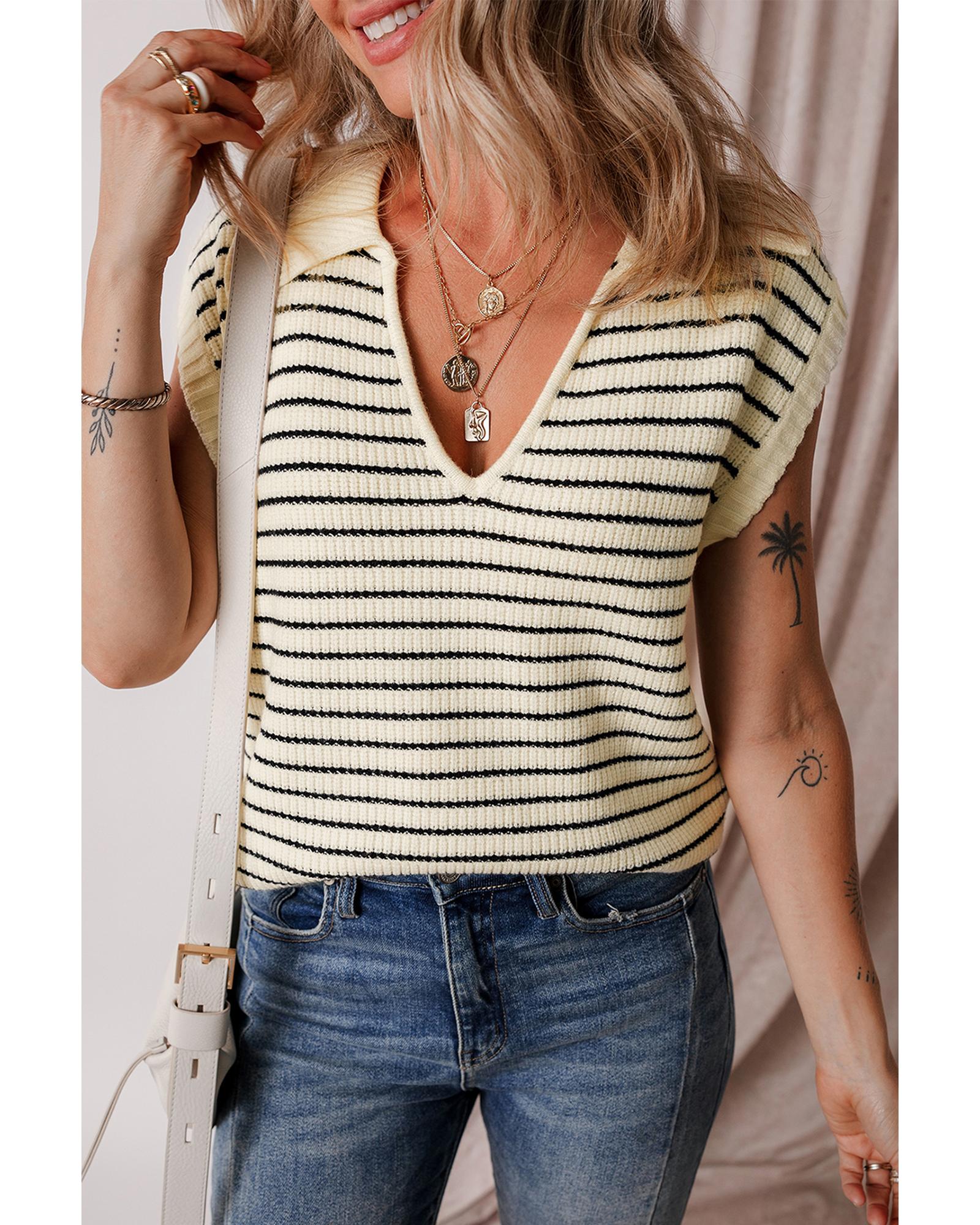 Beige Stripe Turn-down V Neck Sweater Tank Top – L
