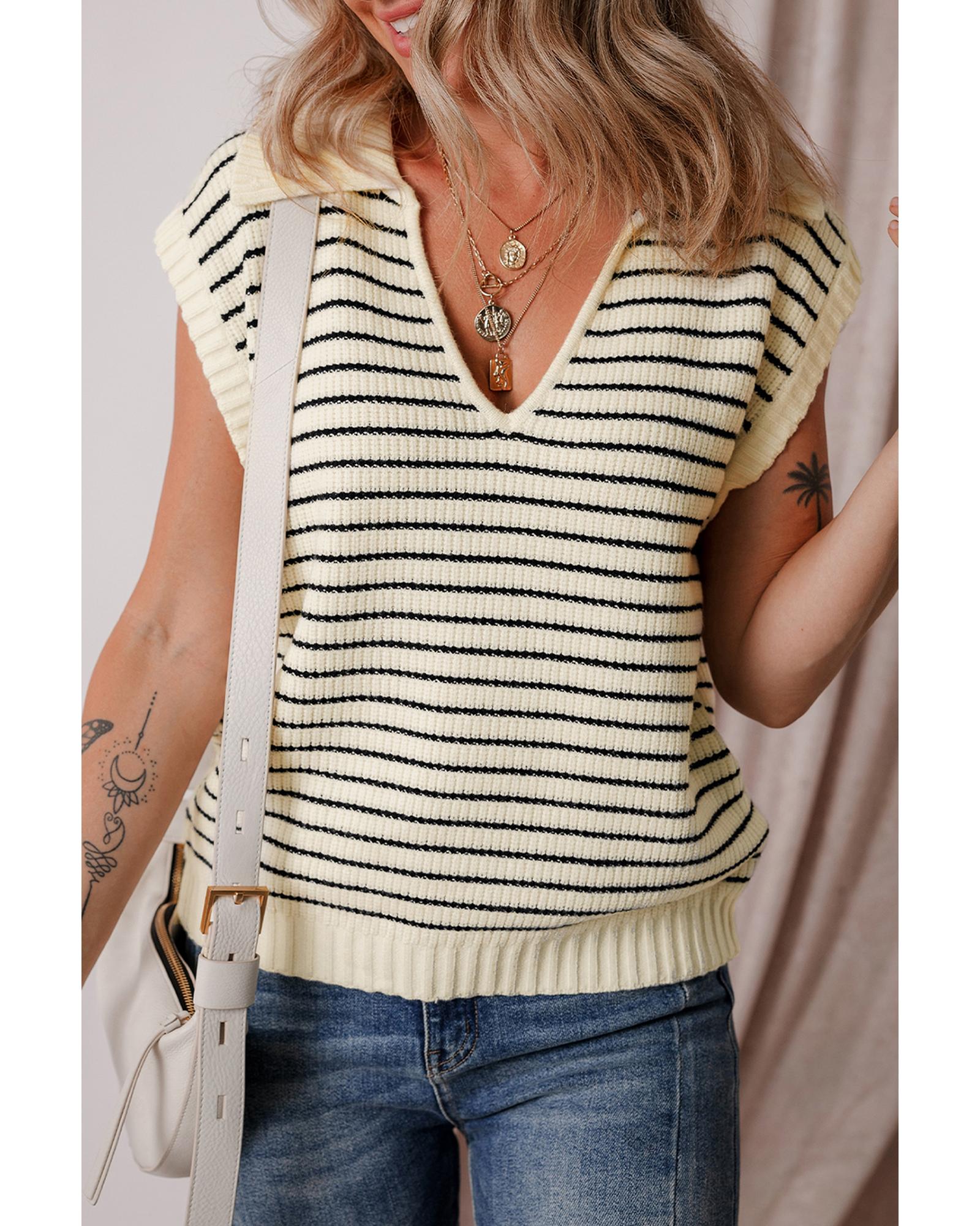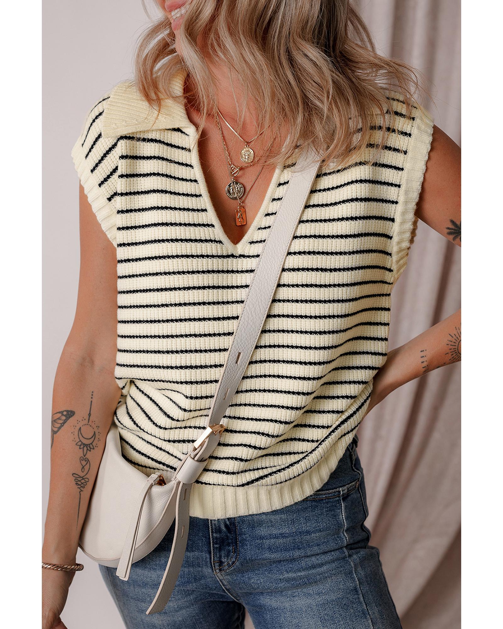 Beige Stripe Turn-down V Neck Sweater Tank Top – M