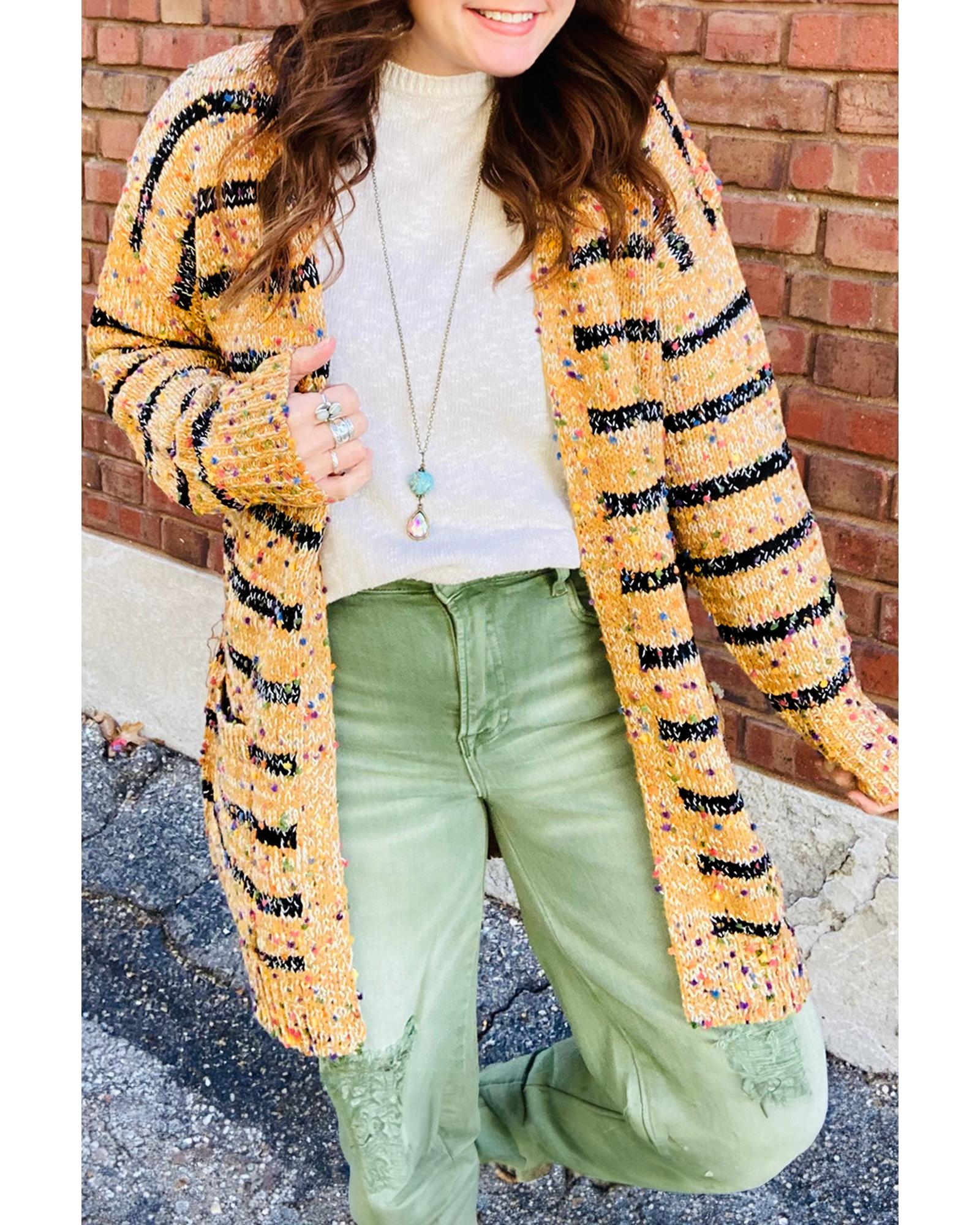 Beige Striped Pom Pom Knit Open Front Long Cardigan – XL