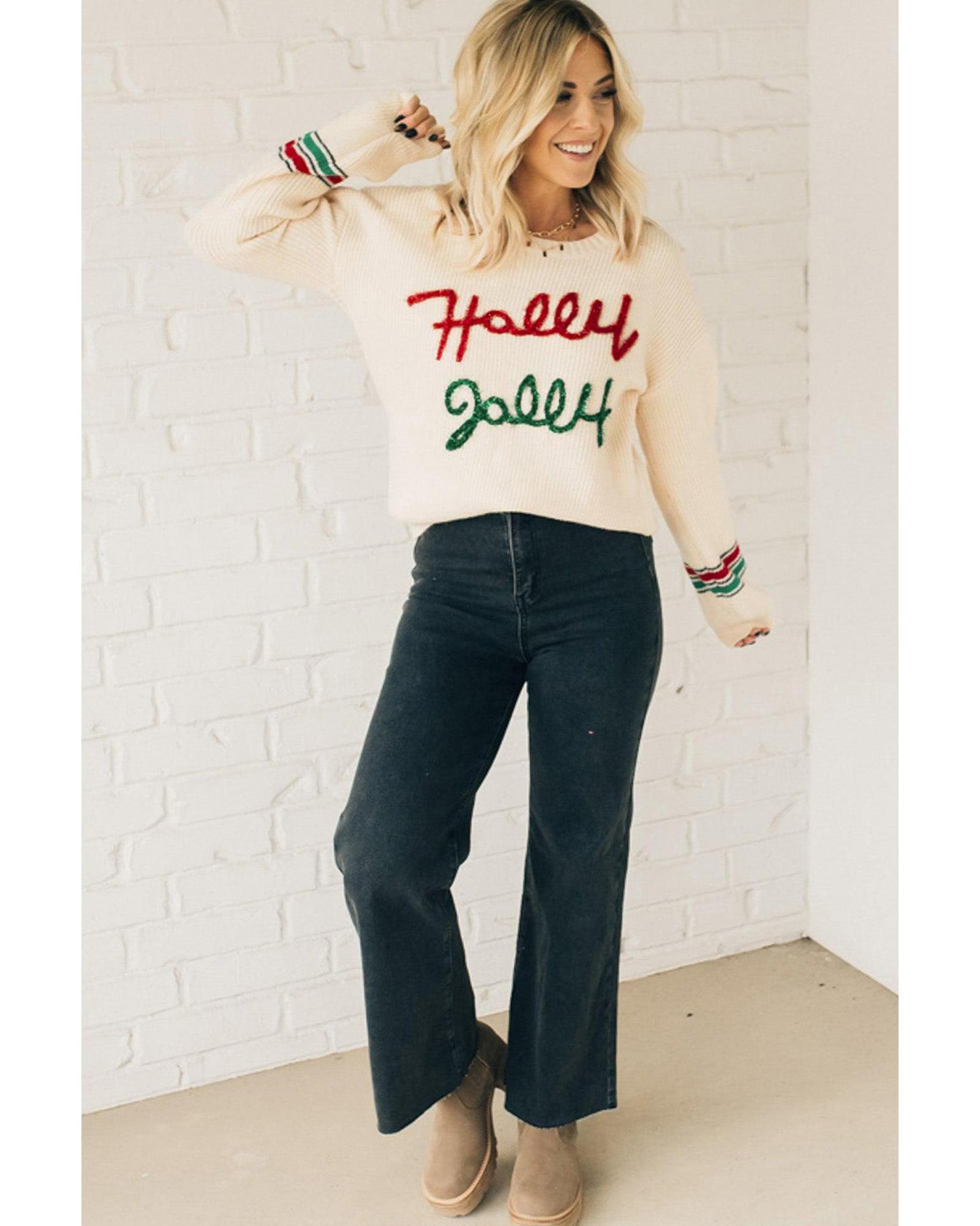 Beige Tinsel Holly Jolly Graphic Classic Sweater – L