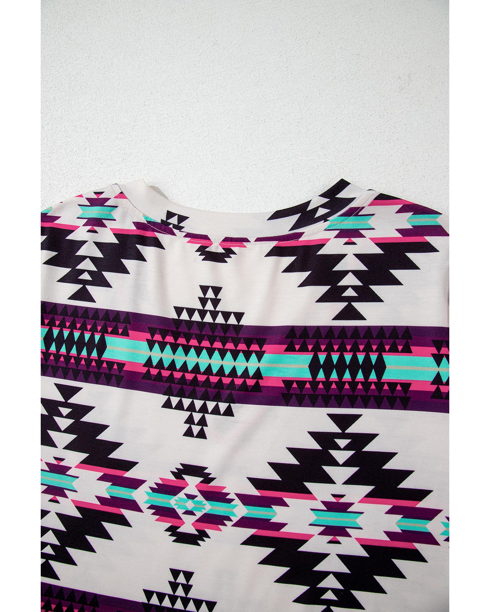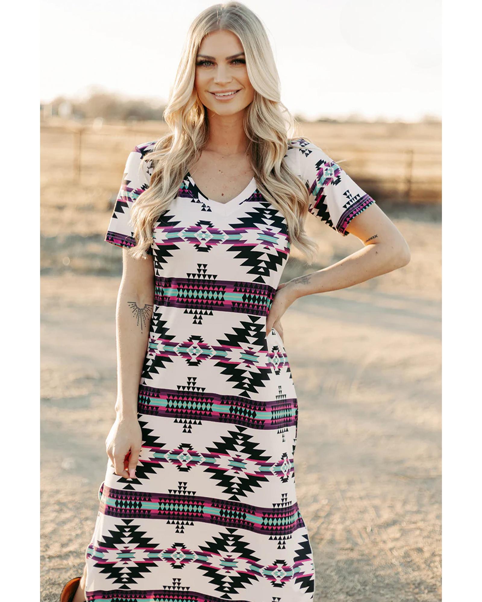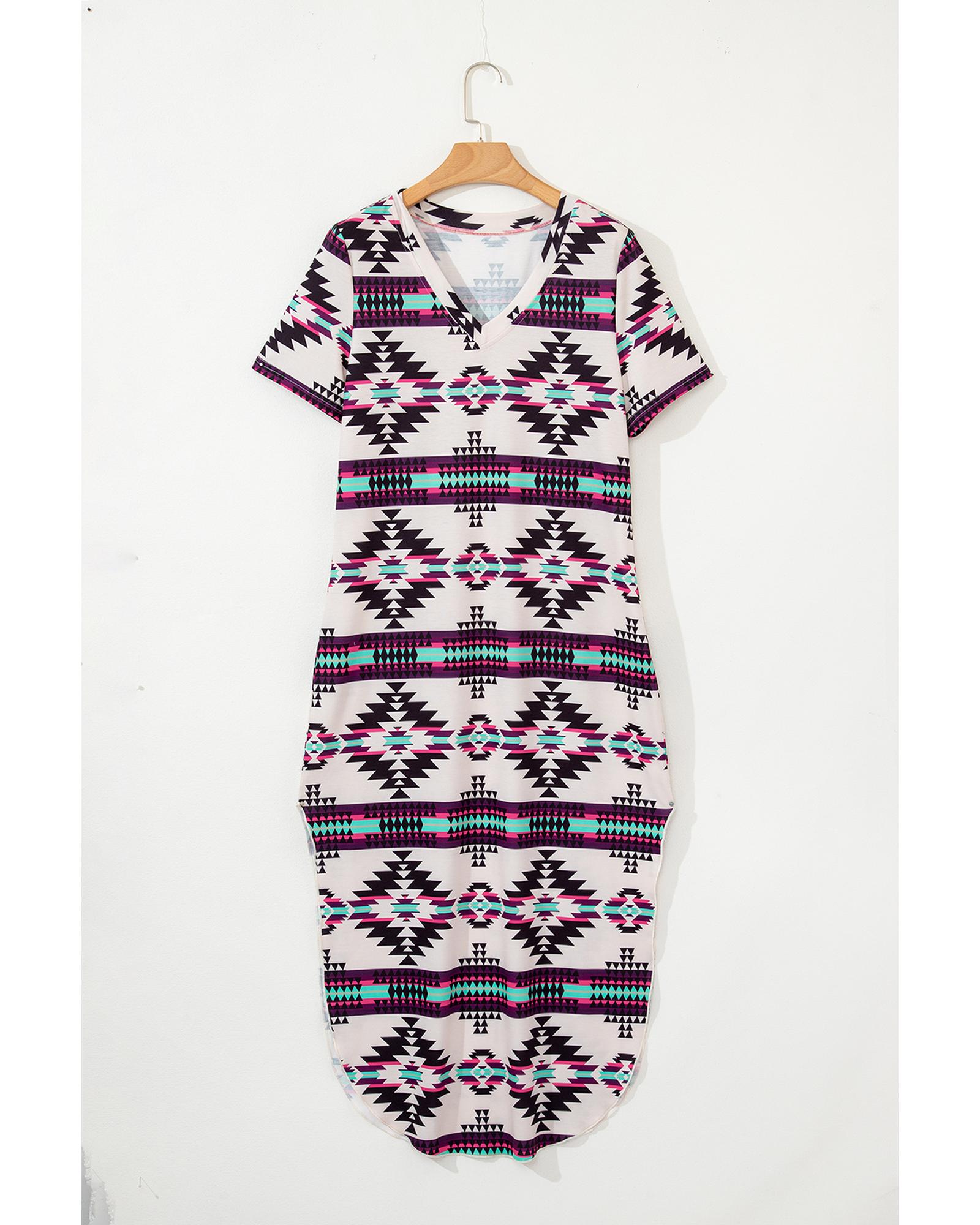 Beige Western Aztec Printed Long T-shirt Dress – L