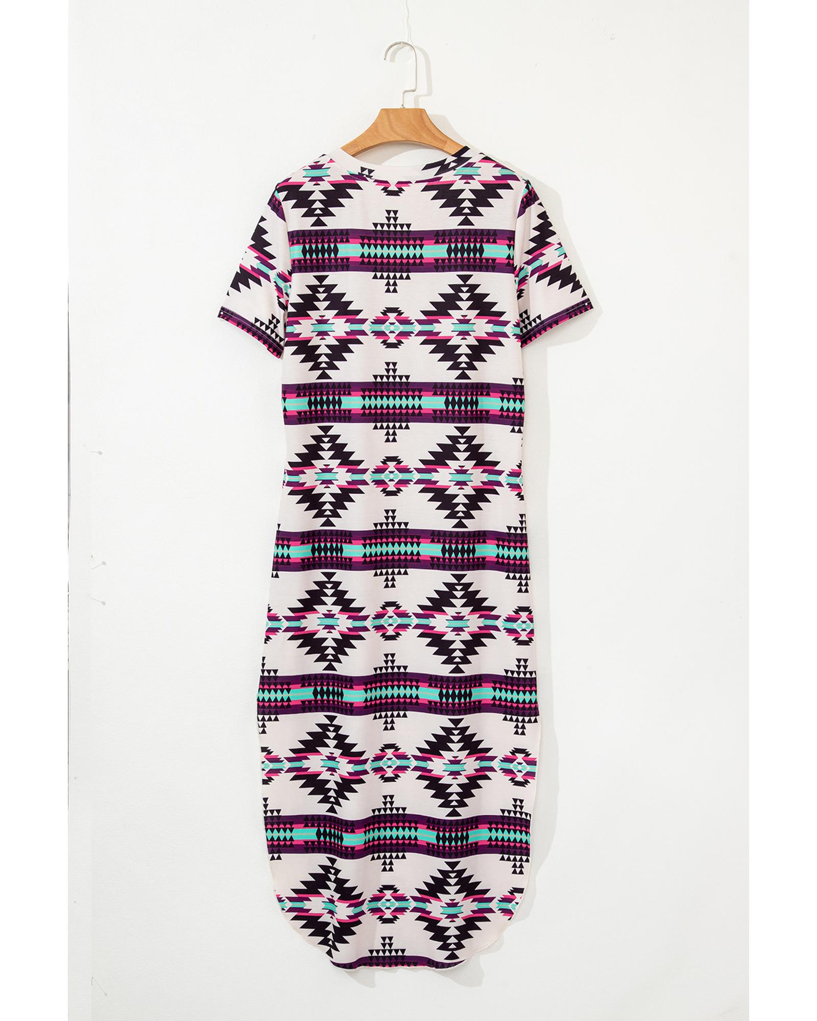 Beige Western Aztec Printed Long T-shirt Dress – M