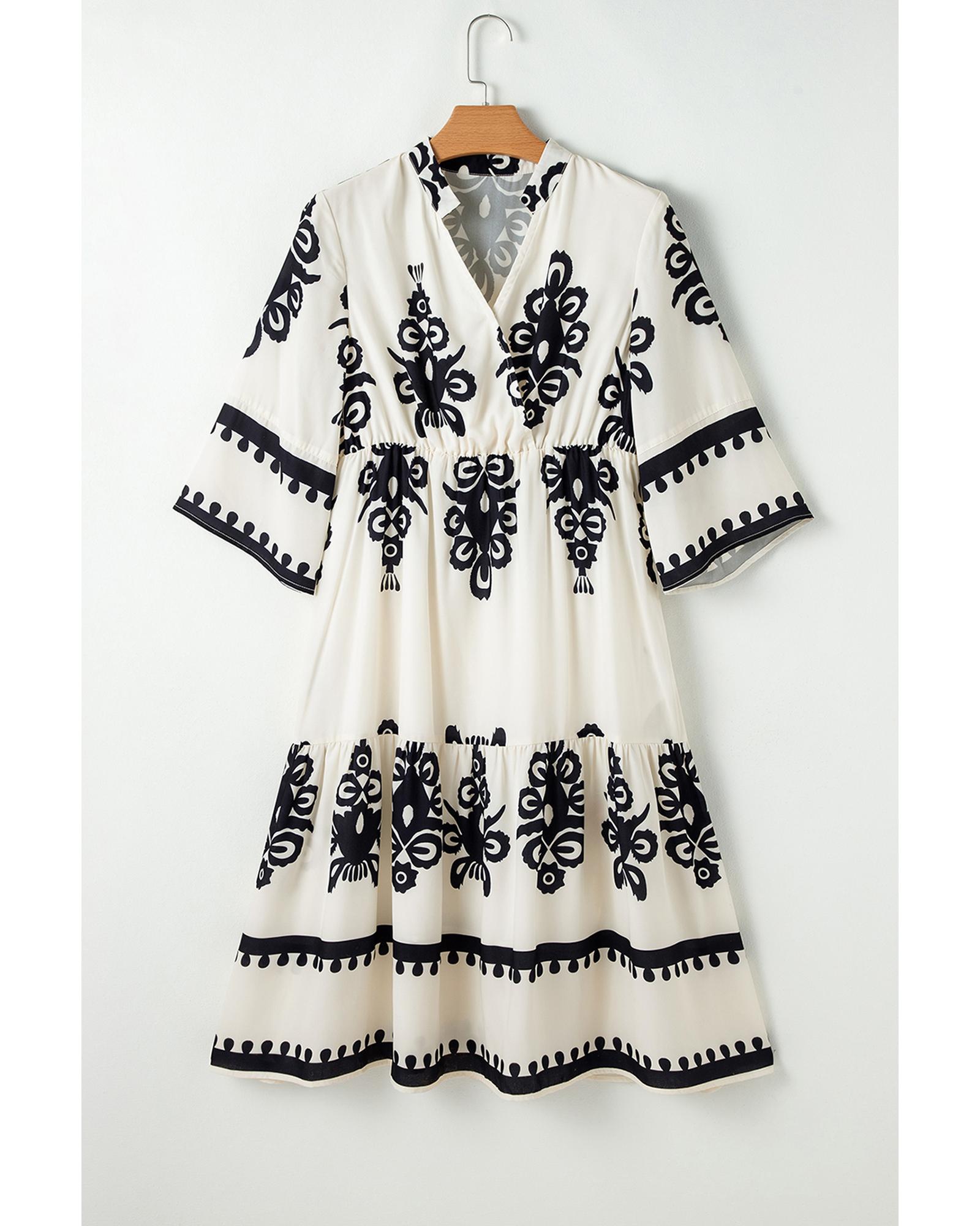 Beige Western Geometric Print 3/4 Sleeve Loose Midi Dress – L
