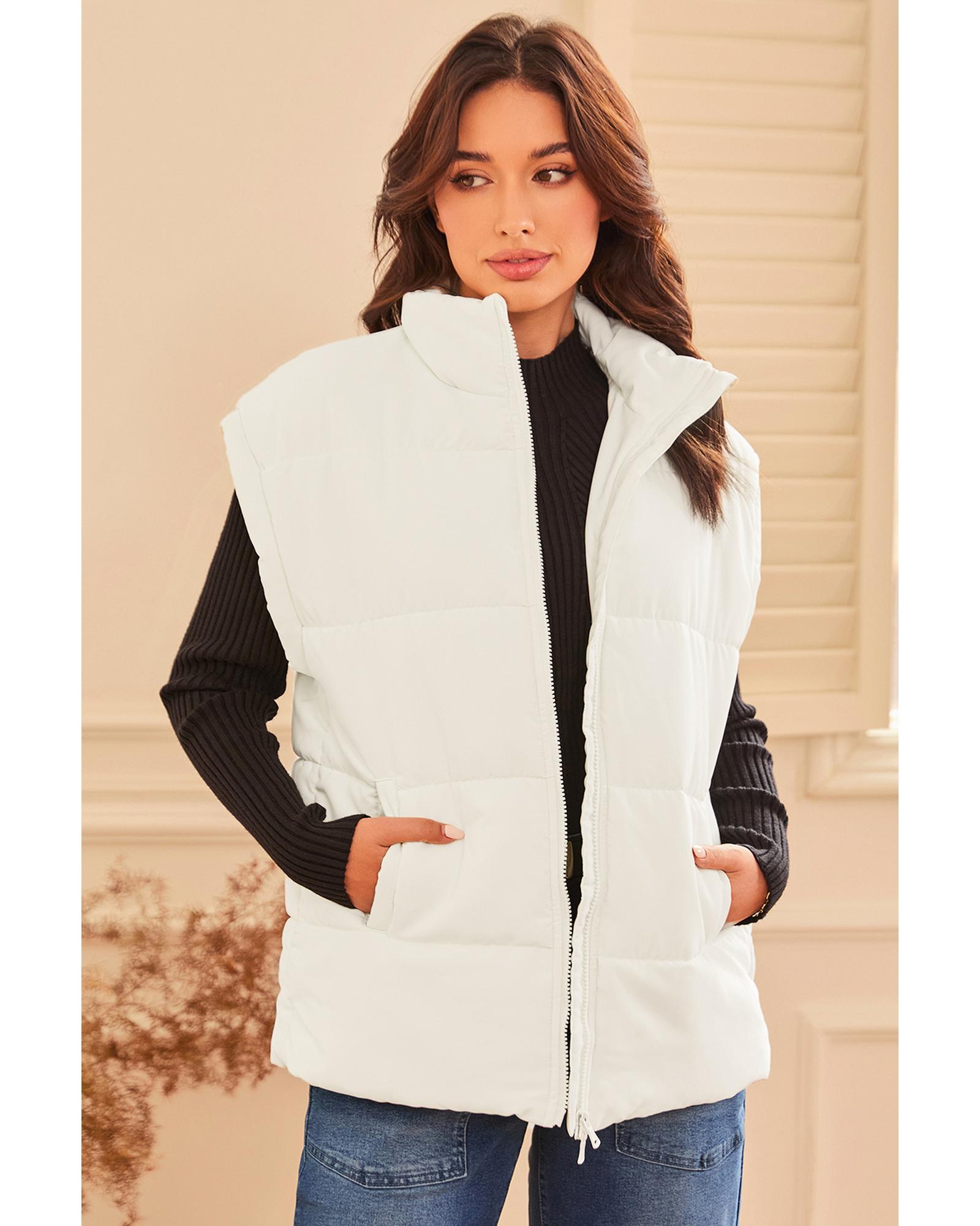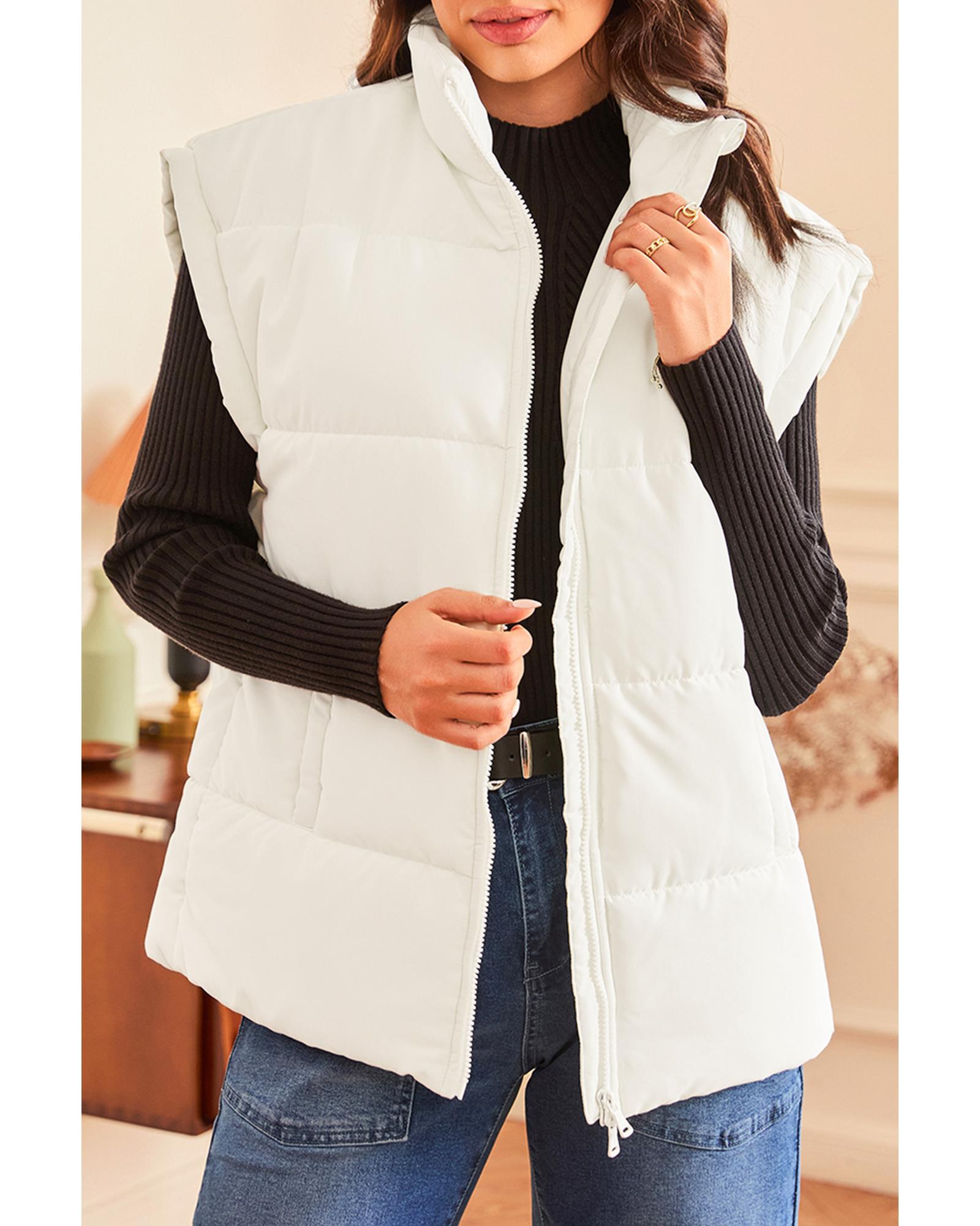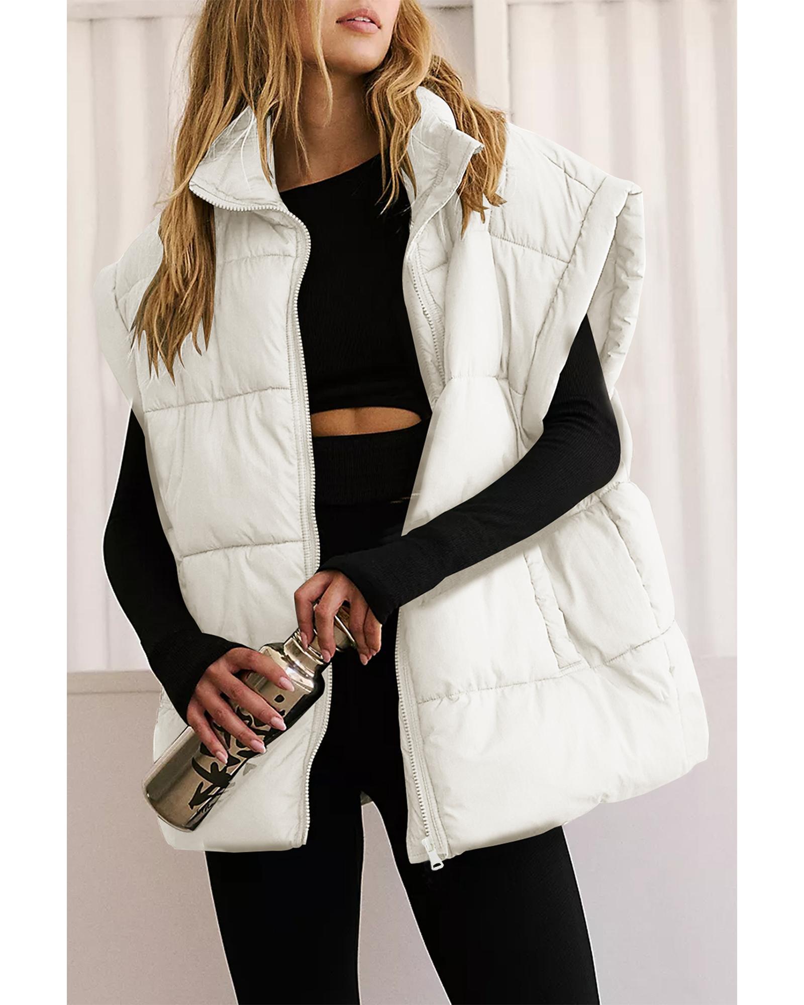 Beige Zipper Stand Neck Oversized Puffer Vest – L