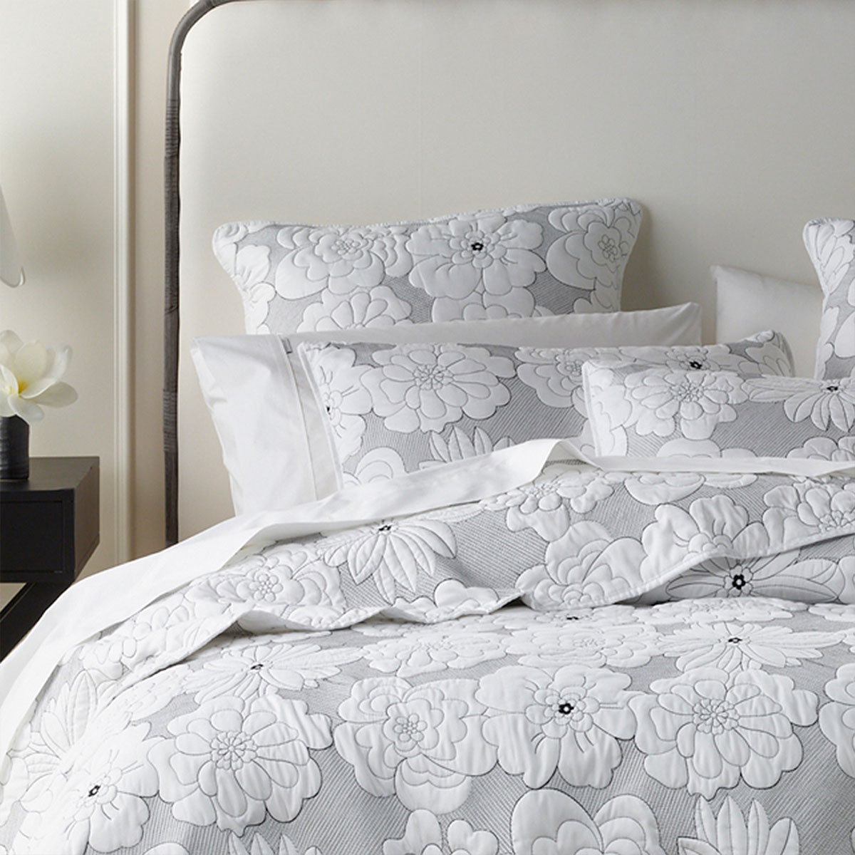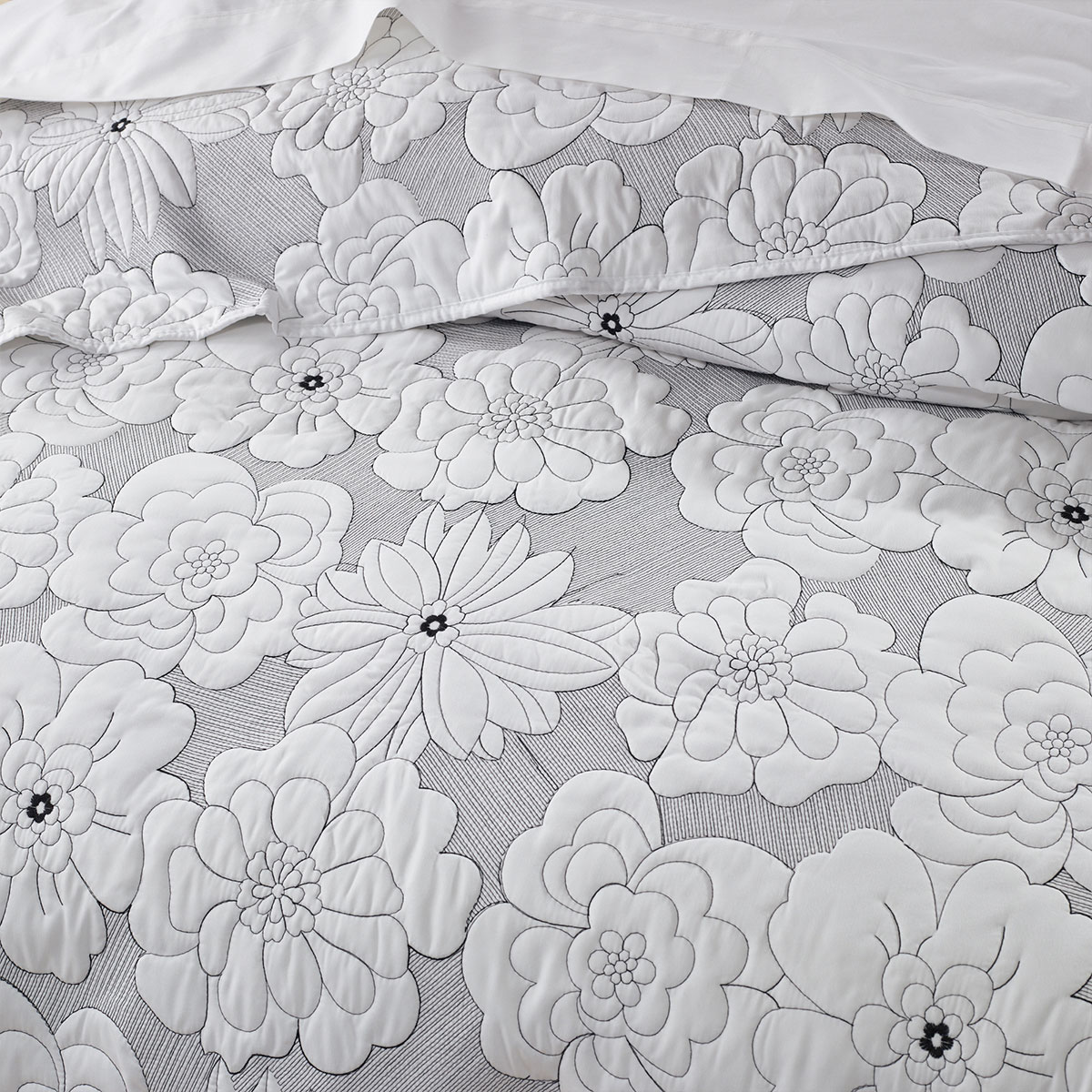 Make a statement in your bedroom with this striking design. Leona features a floral pattern with black and white contrast stitching. This 4-piece set includes one bedspread, two standard pillowcases and one cushion cover 43x43cm.