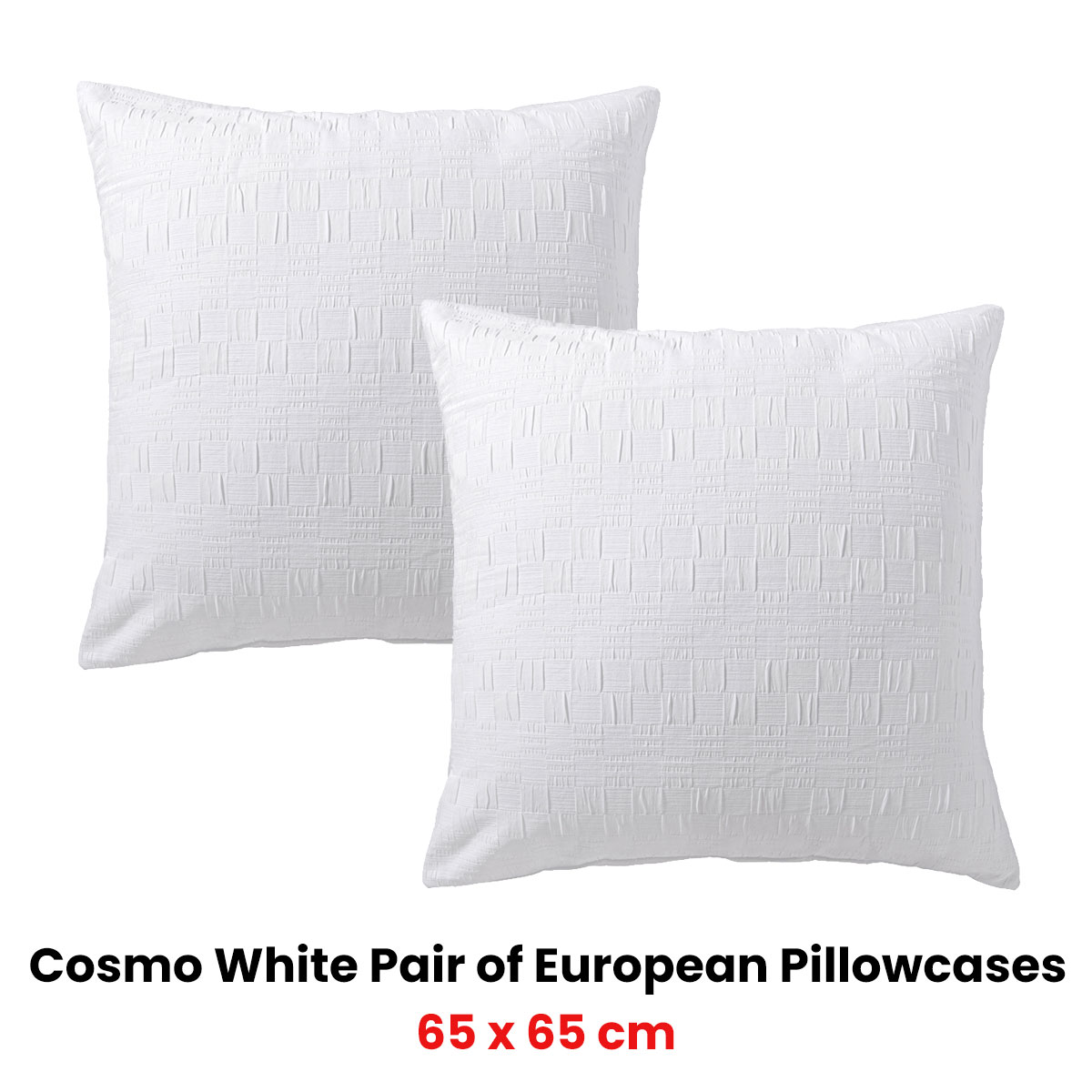 This gorgeous Pair of Cosmo White European Pillowcases by Bianca features a stunning, geometric design. The small squares are woven in super soft chenille fabric. This clean and crisp design is one that will complement all bedrooms.