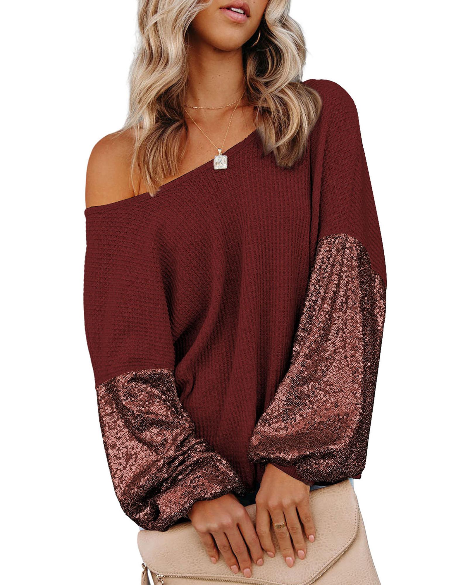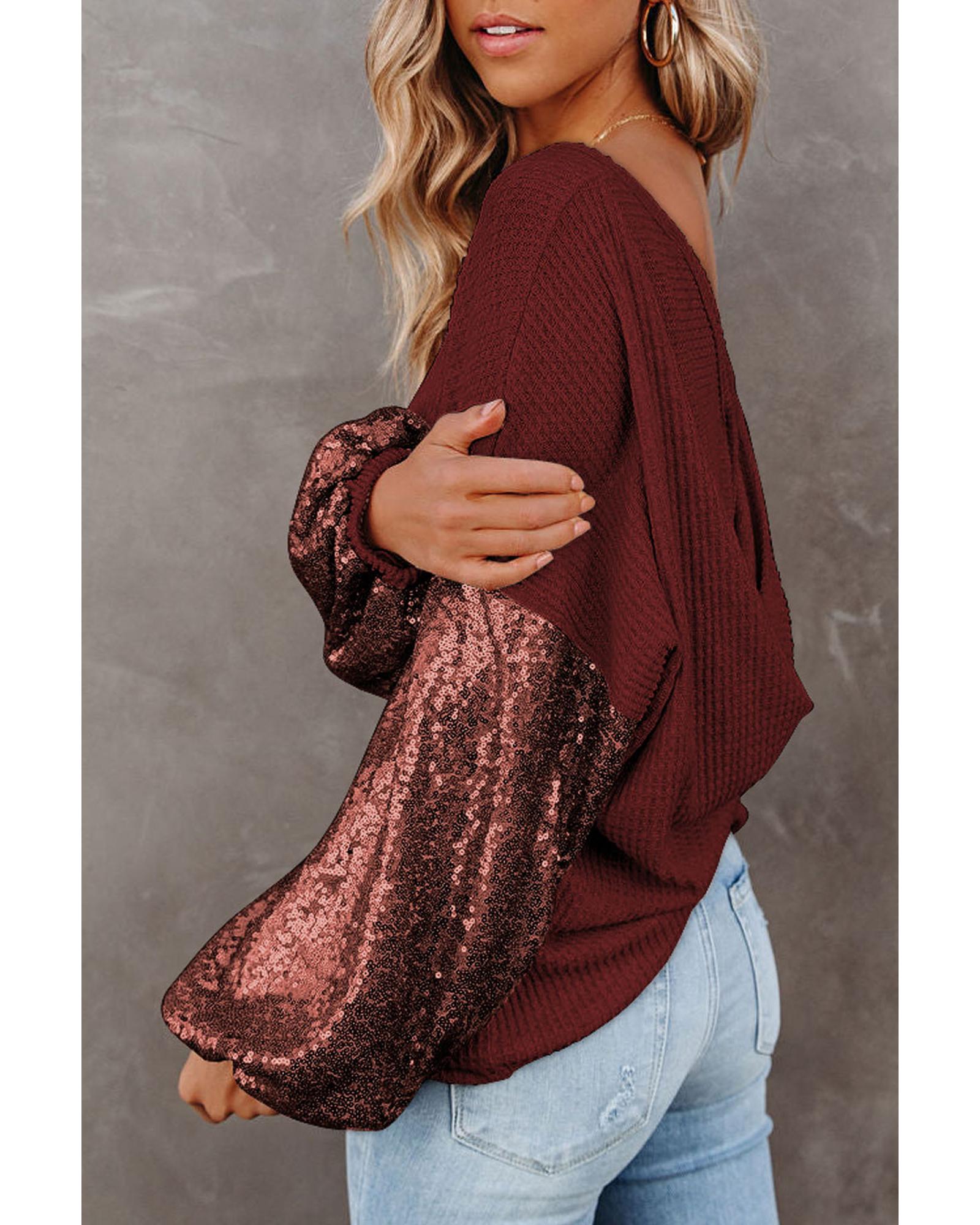 - Biking Red Sequin Patchwork Sleeve Open Back Waffle Knit Top