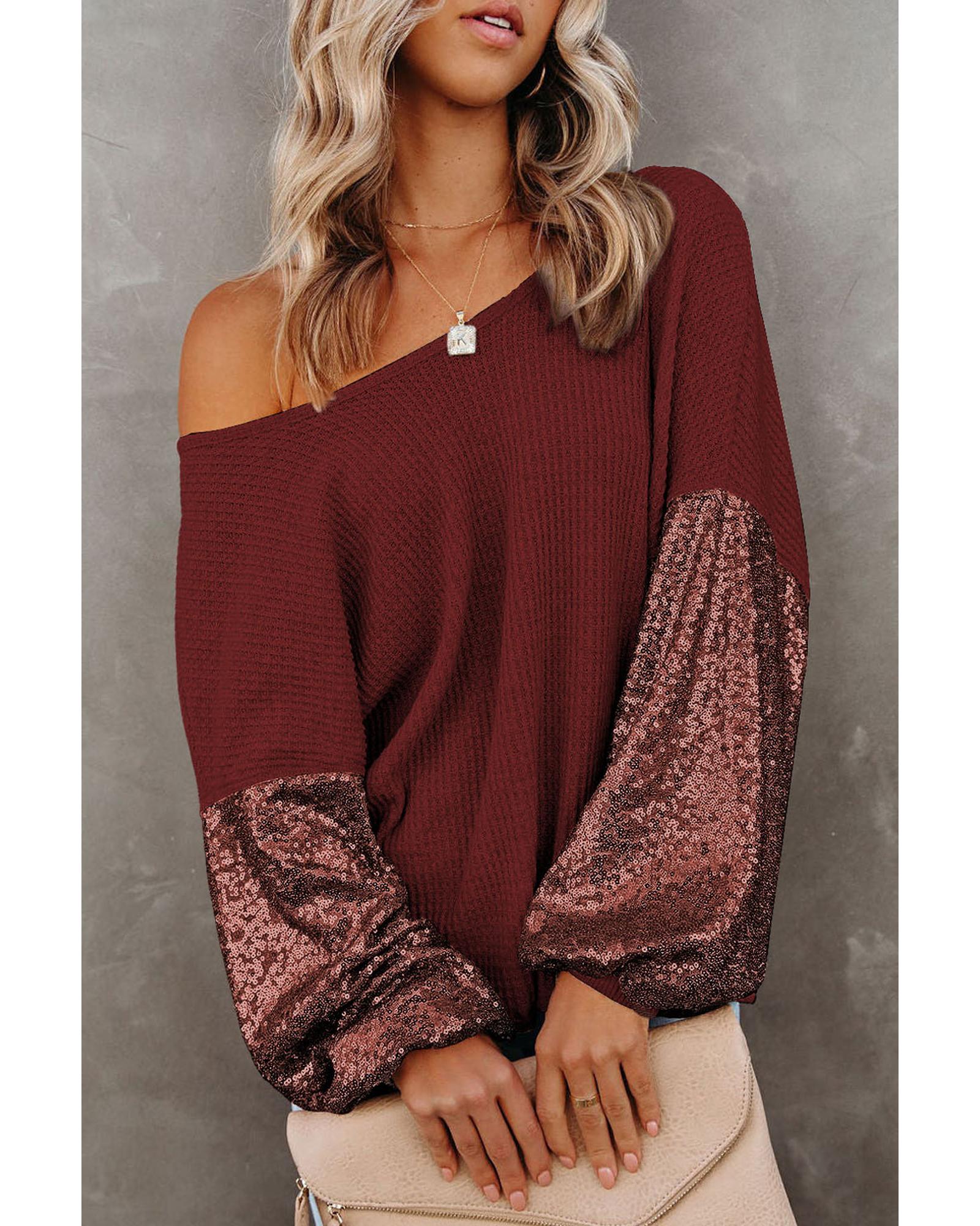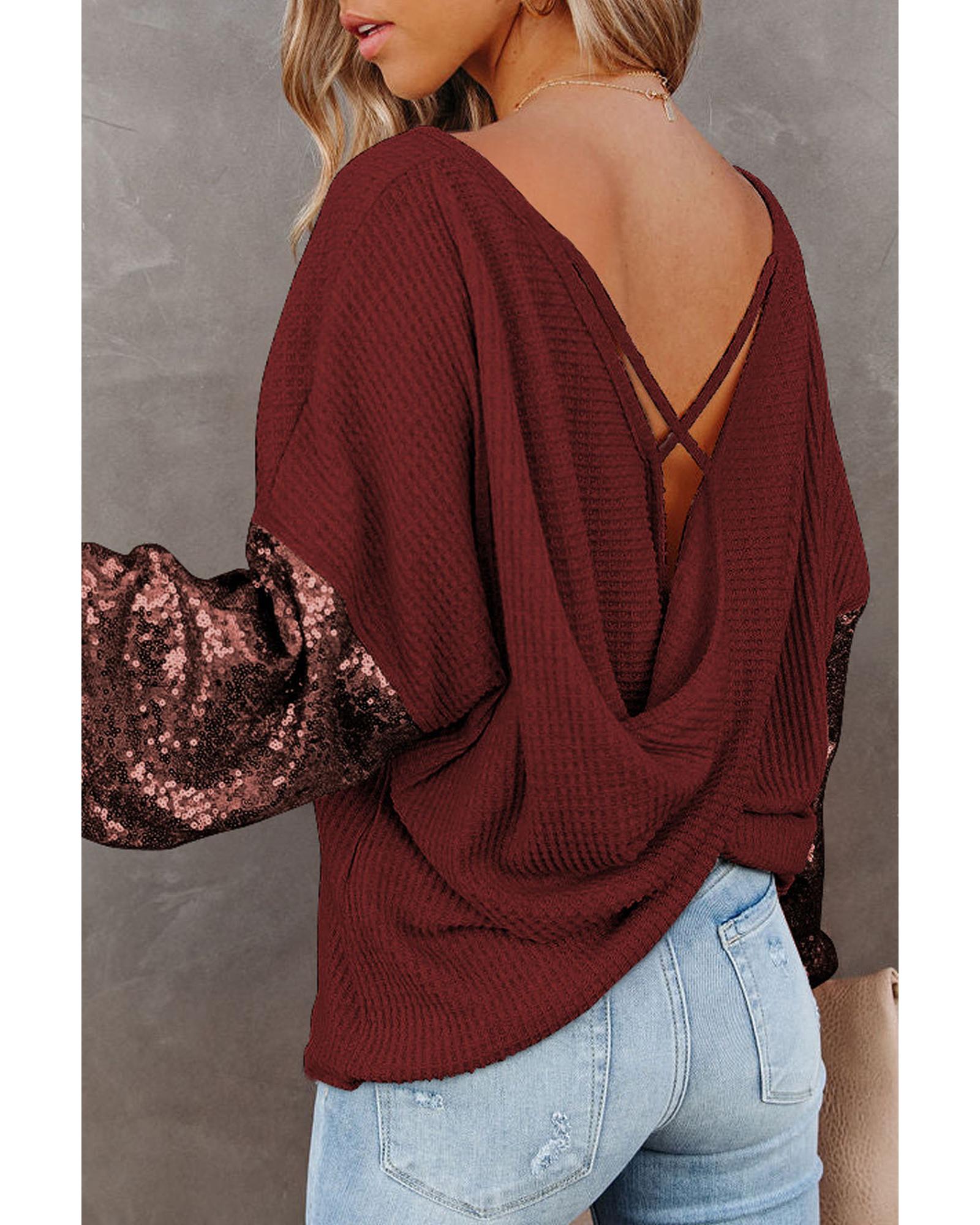 - Biking Red Sequin Patchwork Sleeve Open Back Waffle Knit Top