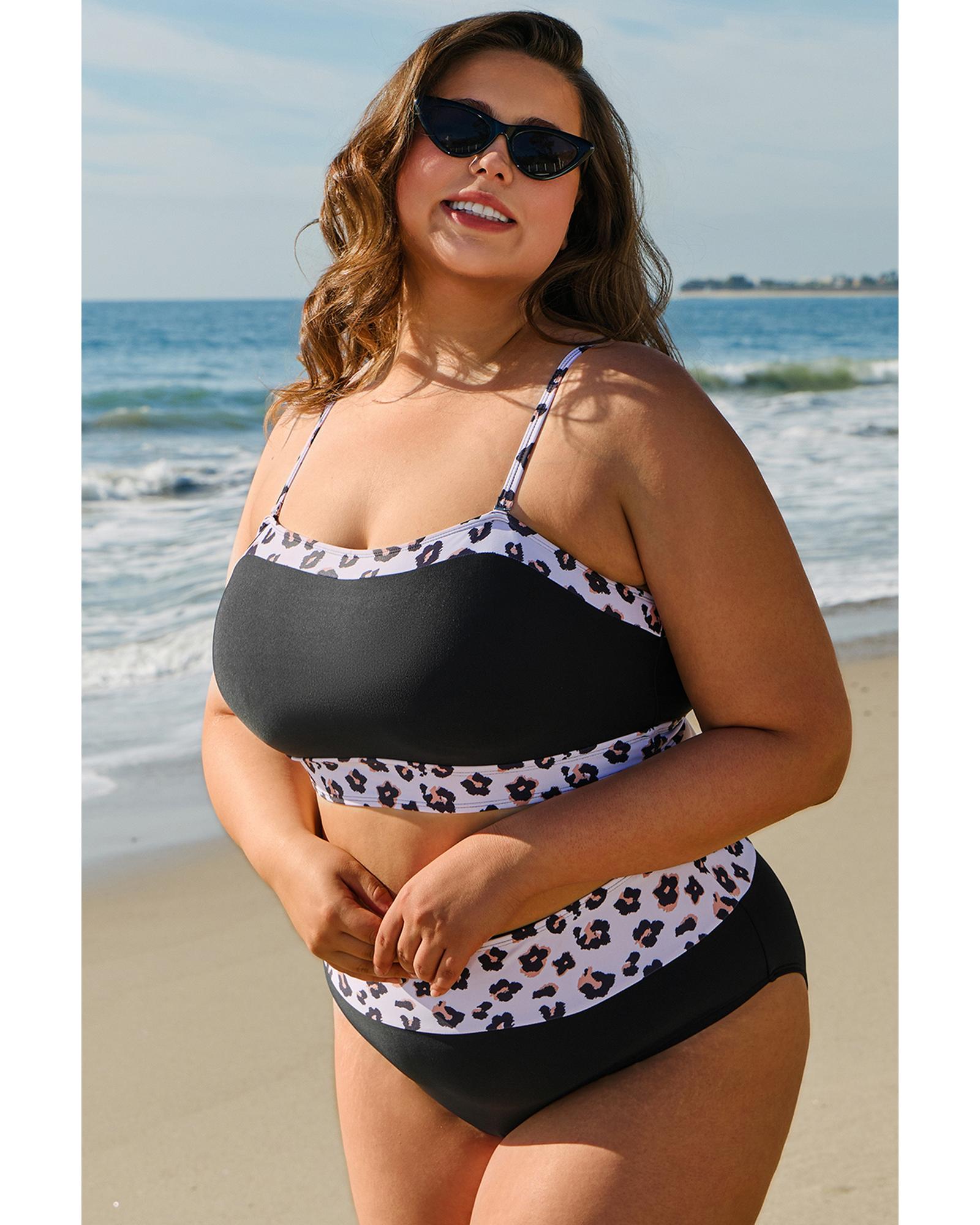 Black 2pcs Leopard Patchwork Plus Size High Waisted Swimsuit – 1X
