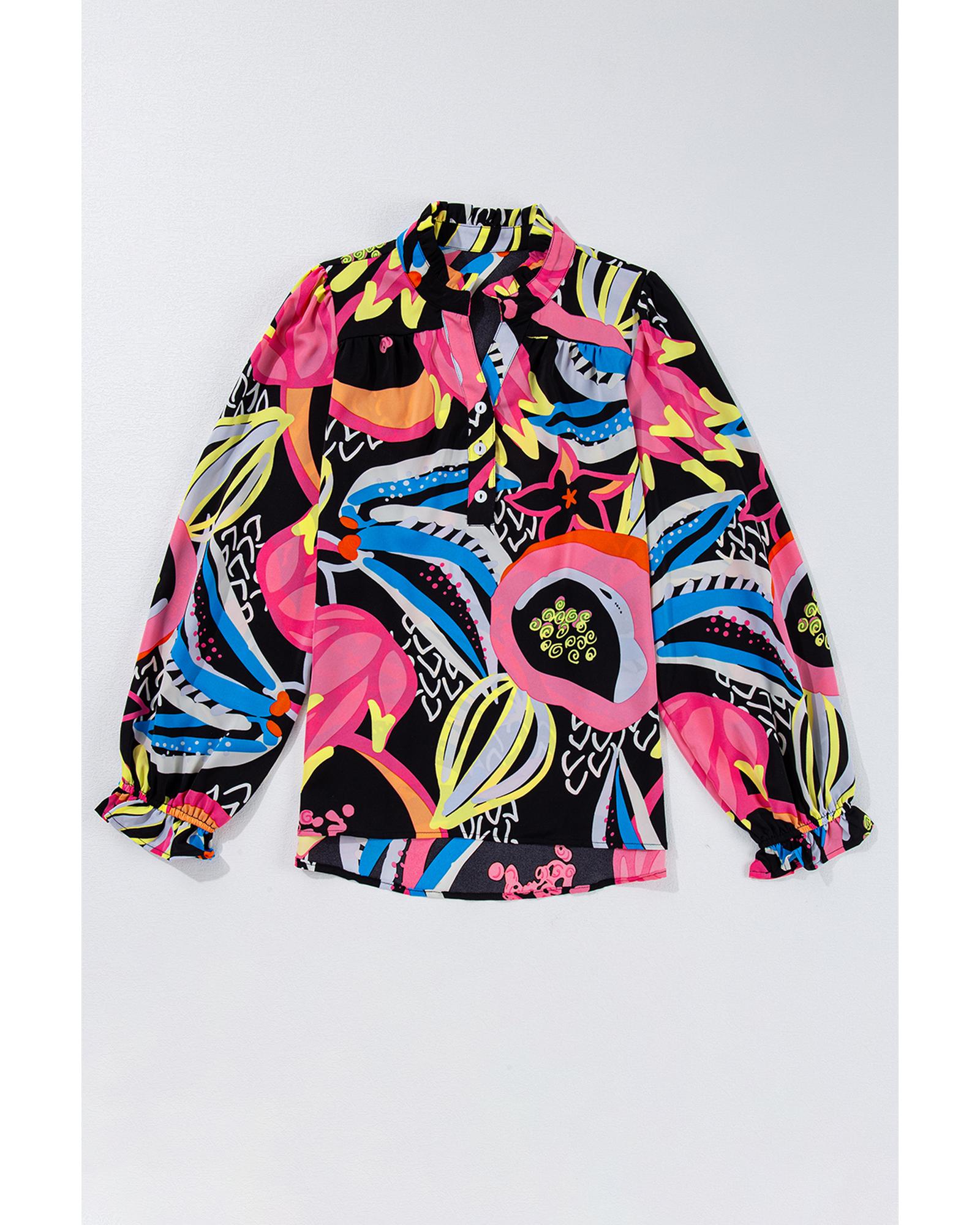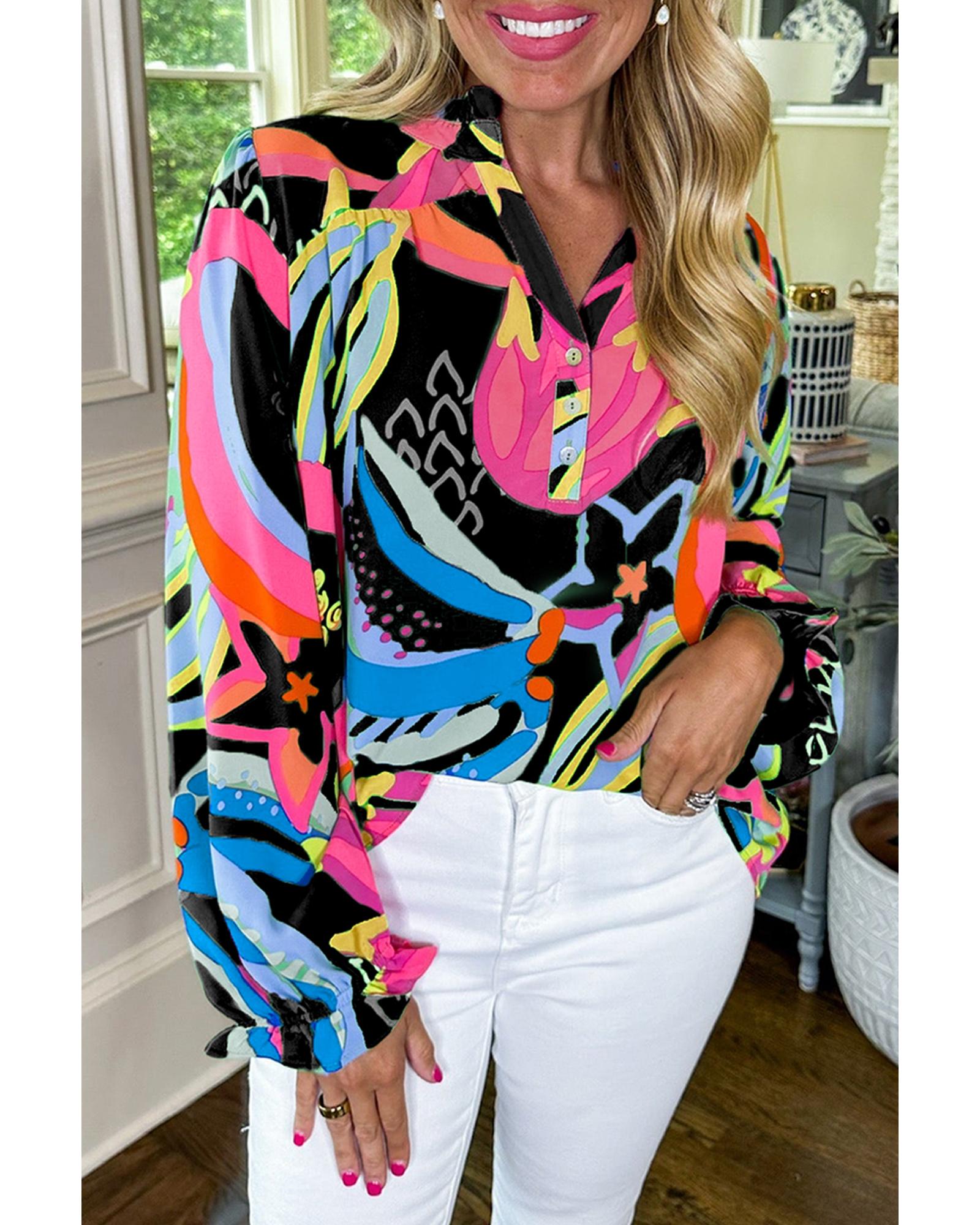 Black Abstract Print Ruffled Sleeve Buttoned V Neck Blouse – XL