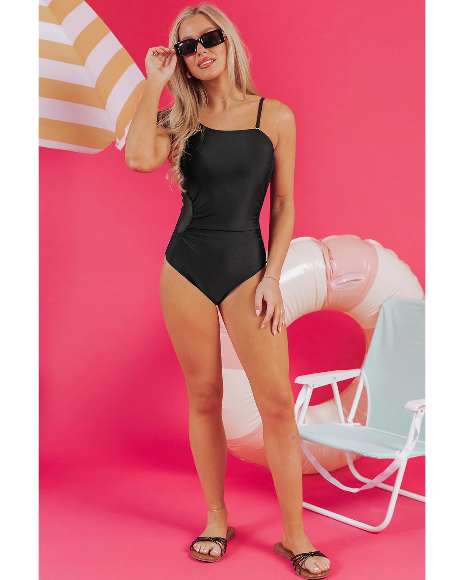 Black Asymmetric Ruffle Shoulder Pleated One Piece Swimsuit - L