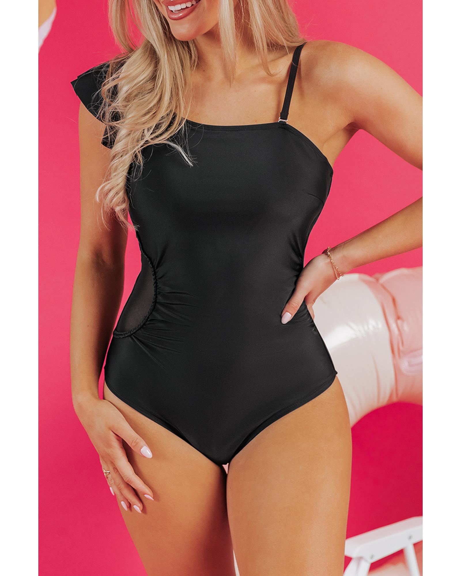 Black Asymmetric Ruffle Shoulder Pleated One Piece Swimsuit – L