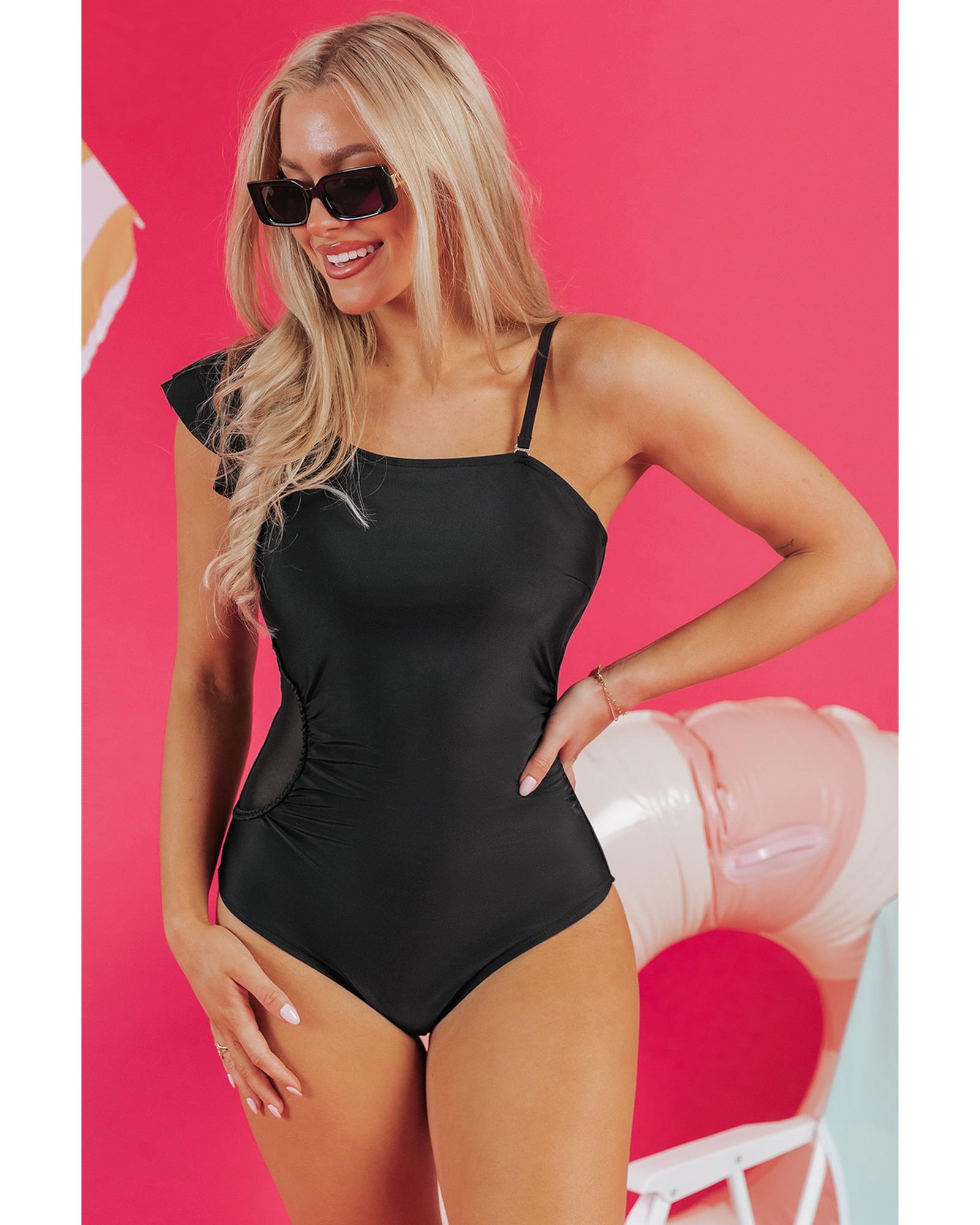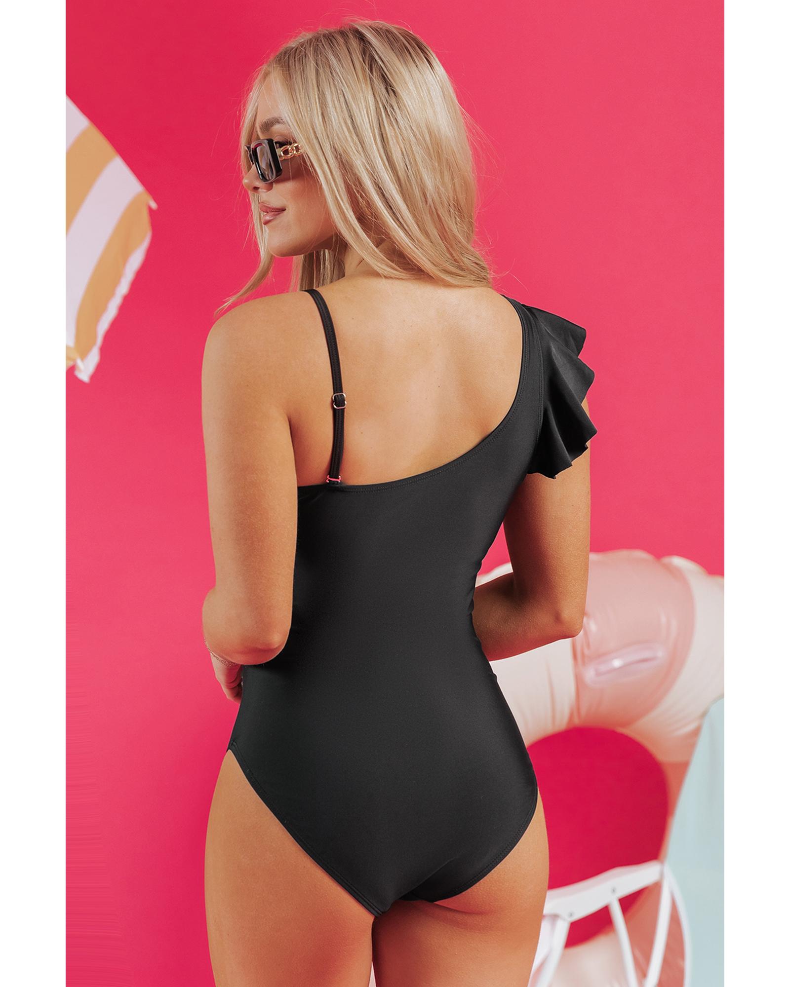 Black Asymmetric Ruffle Shoulder Pleated One Piece Swimsuit – S