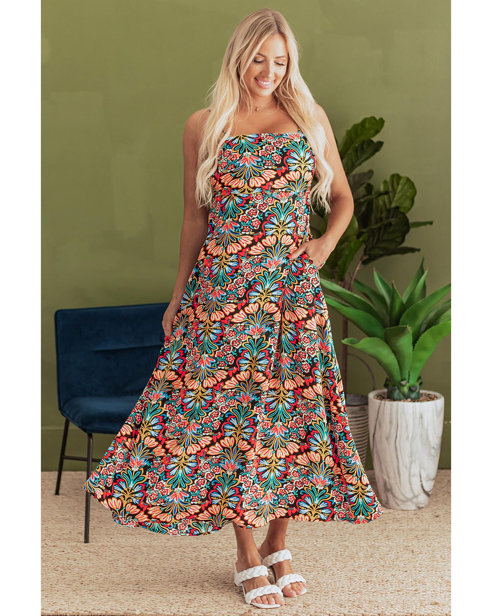 Black Boho Floral Print Thin Straps Sleeveless High Waist Maxi Dress – L