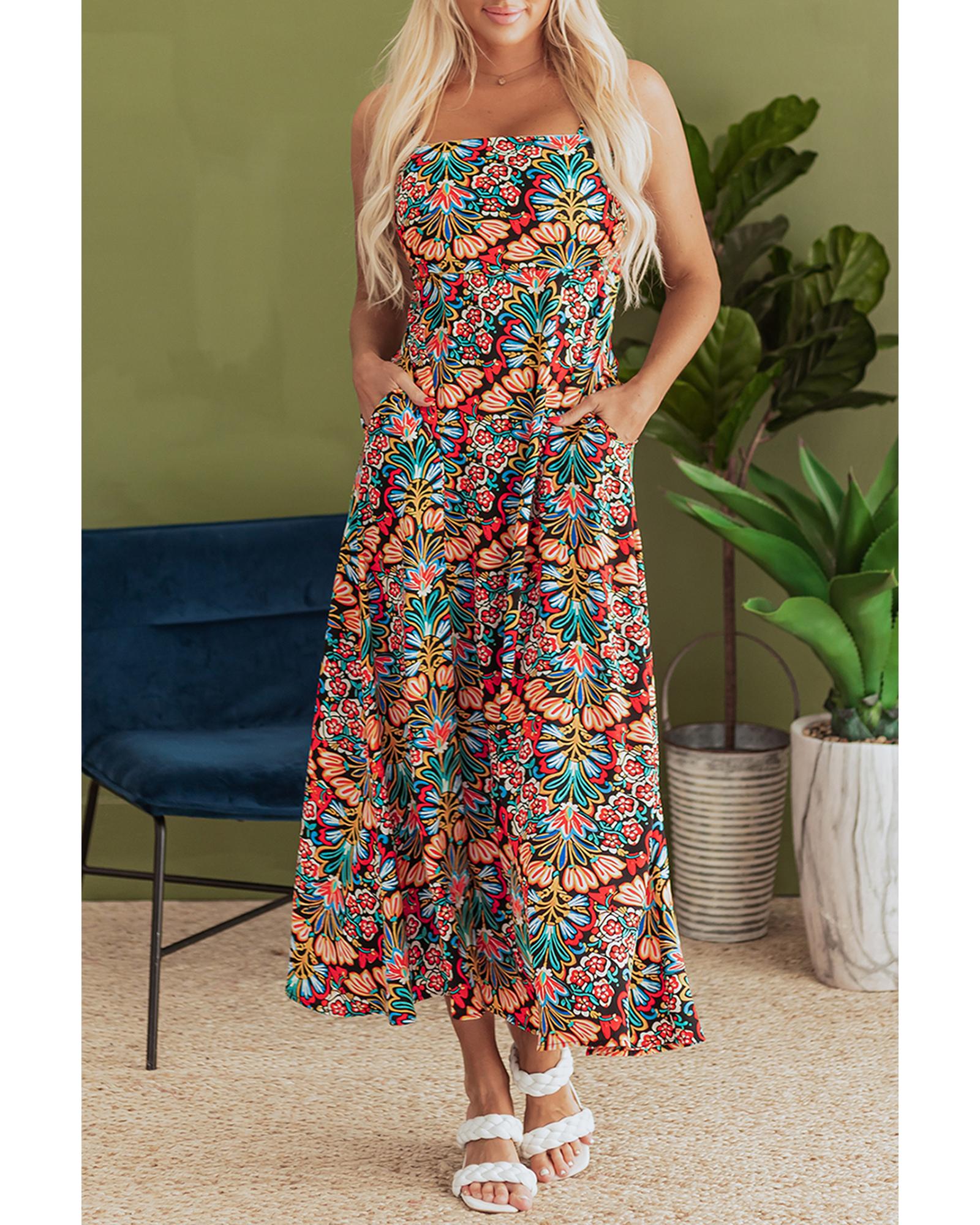 Black Boho Floral Print Thin Straps Sleeveless High Waist Maxi Dress – S
