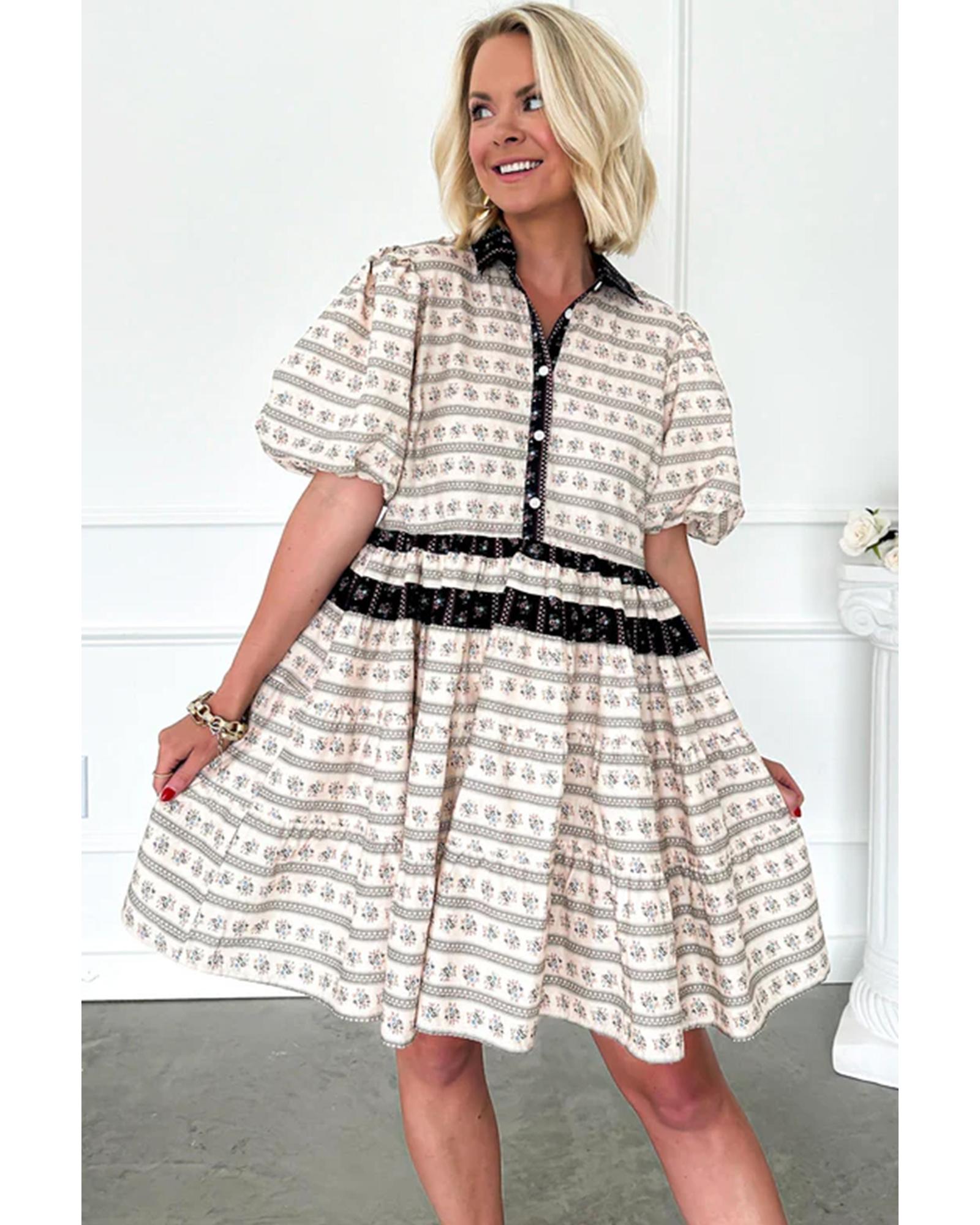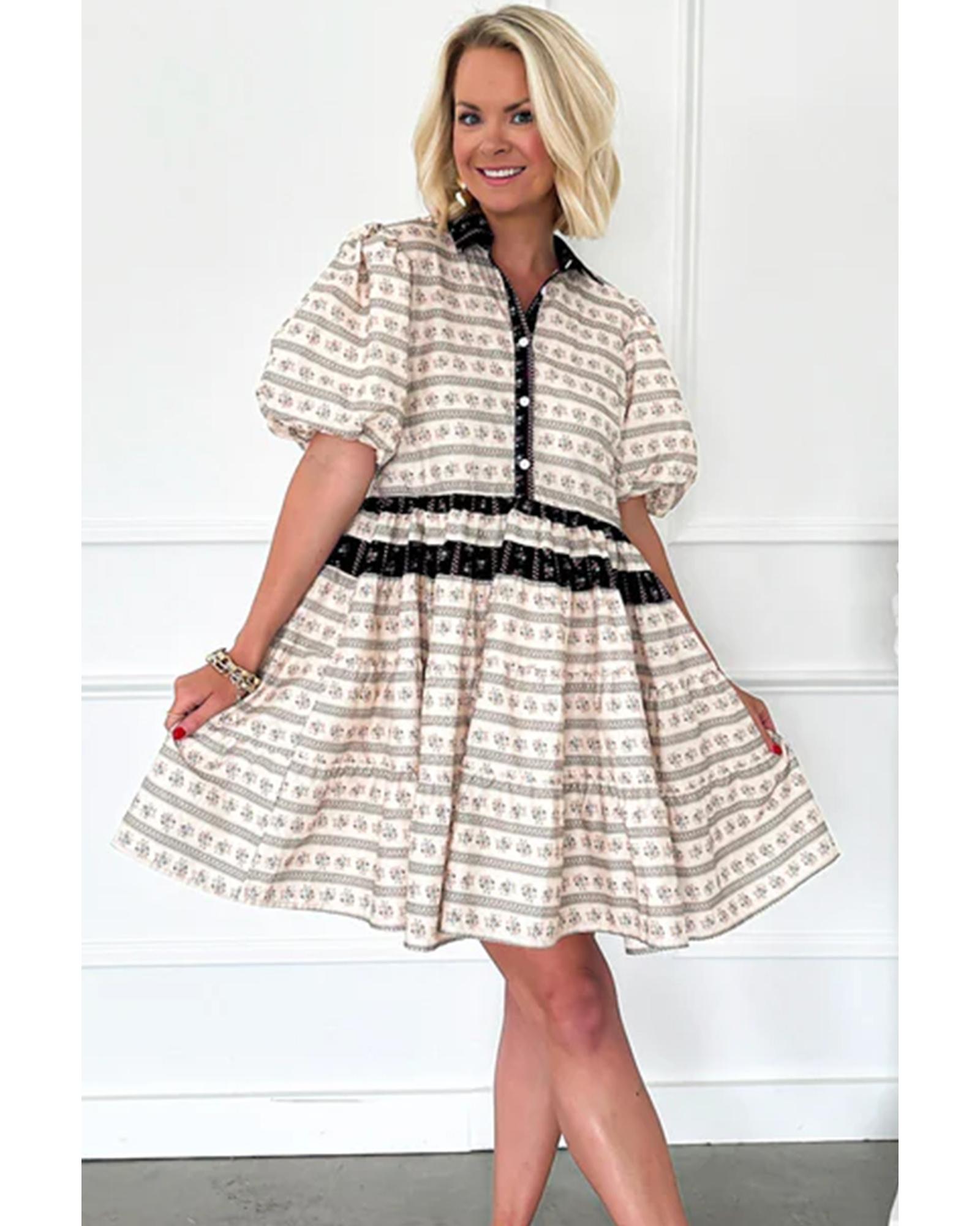 Black Boho Floral Striped Contrast Trim Bubble Sleeve Flared Dress – XL
