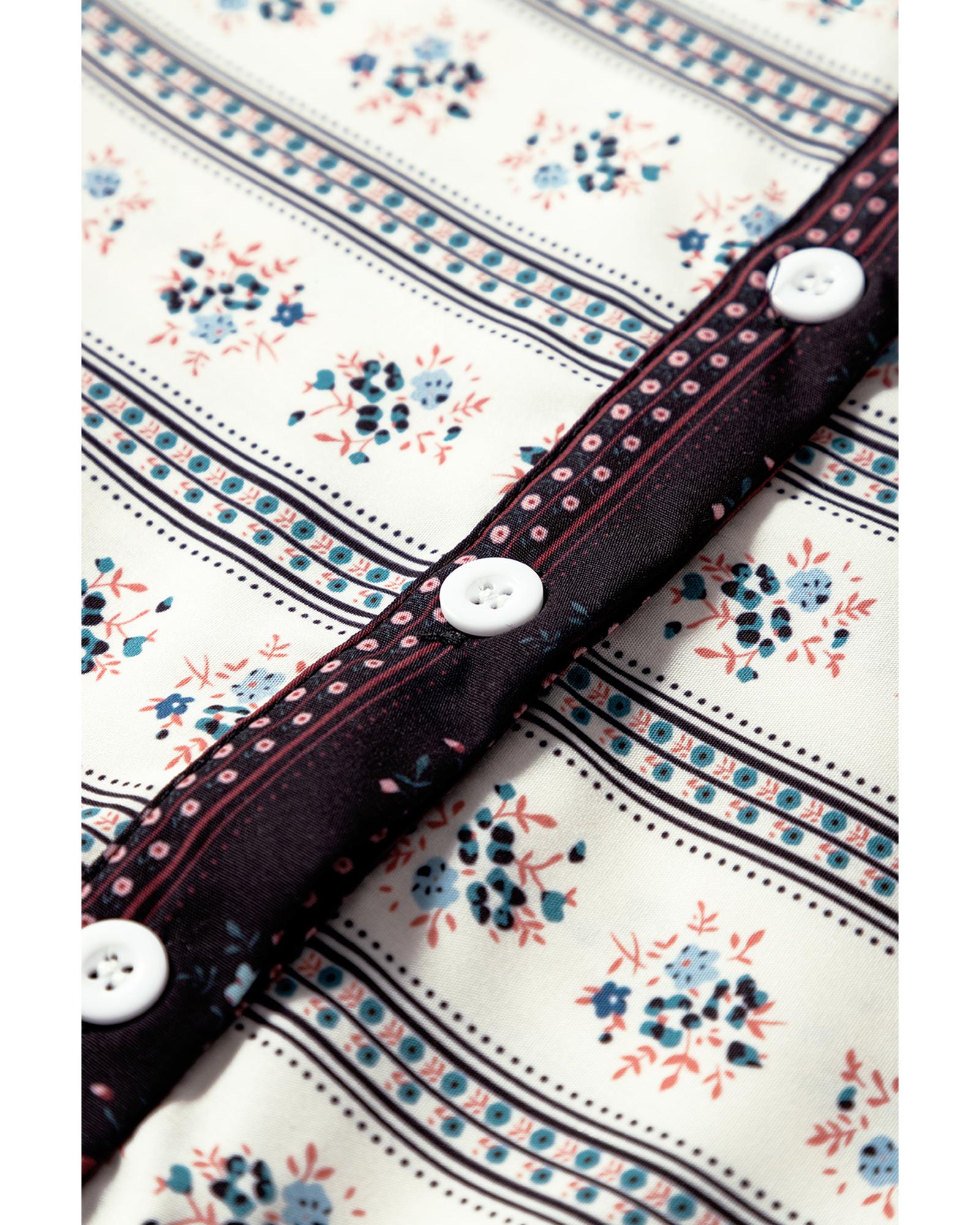 Black Boho Floral Striped Contrast Trim Bubble Sleeve Flared Dress - S