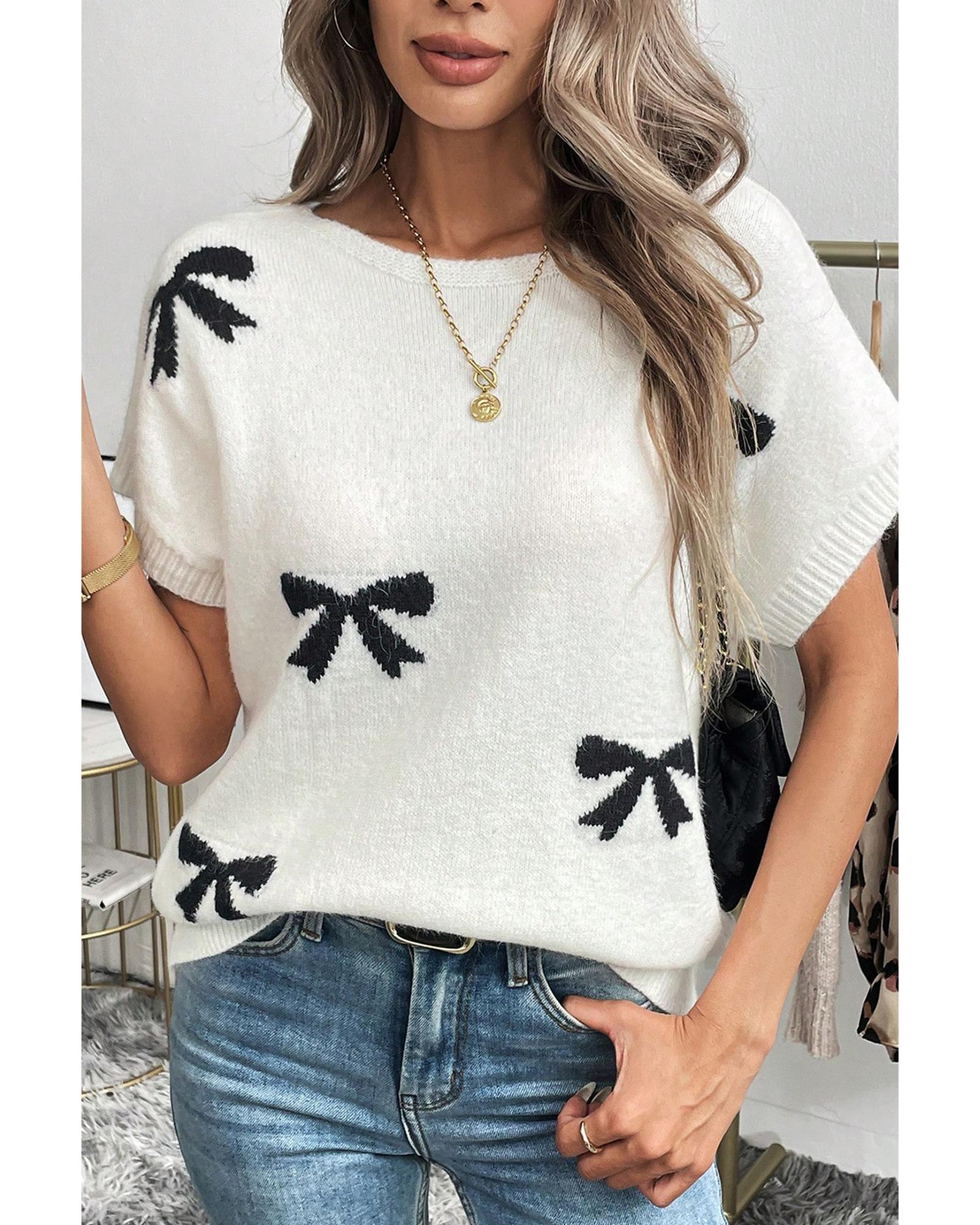 - Black Bow Pattern Knit Short Sleeve Sweater