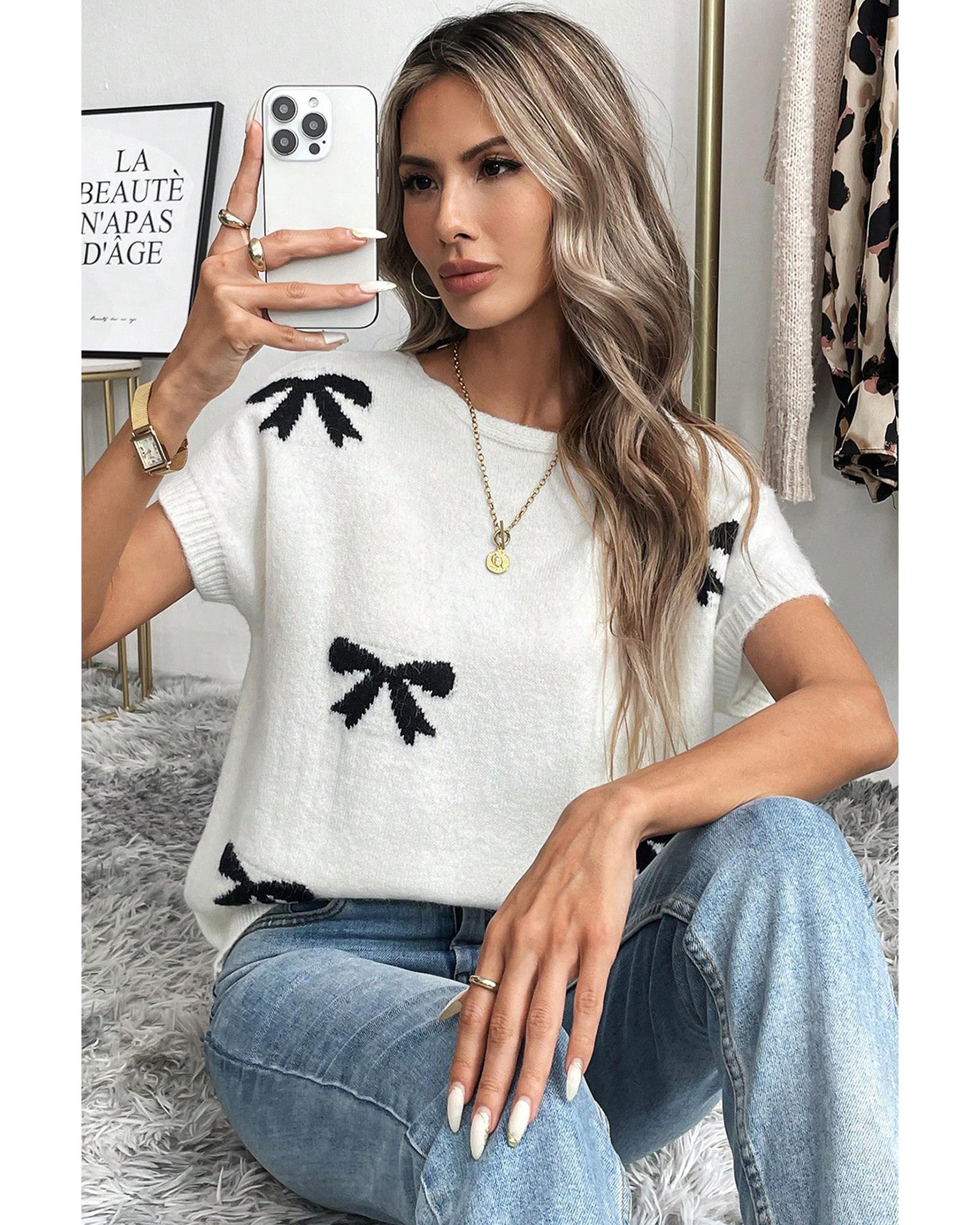 - Black Bow Pattern Knit Short Sleeve Sweater
