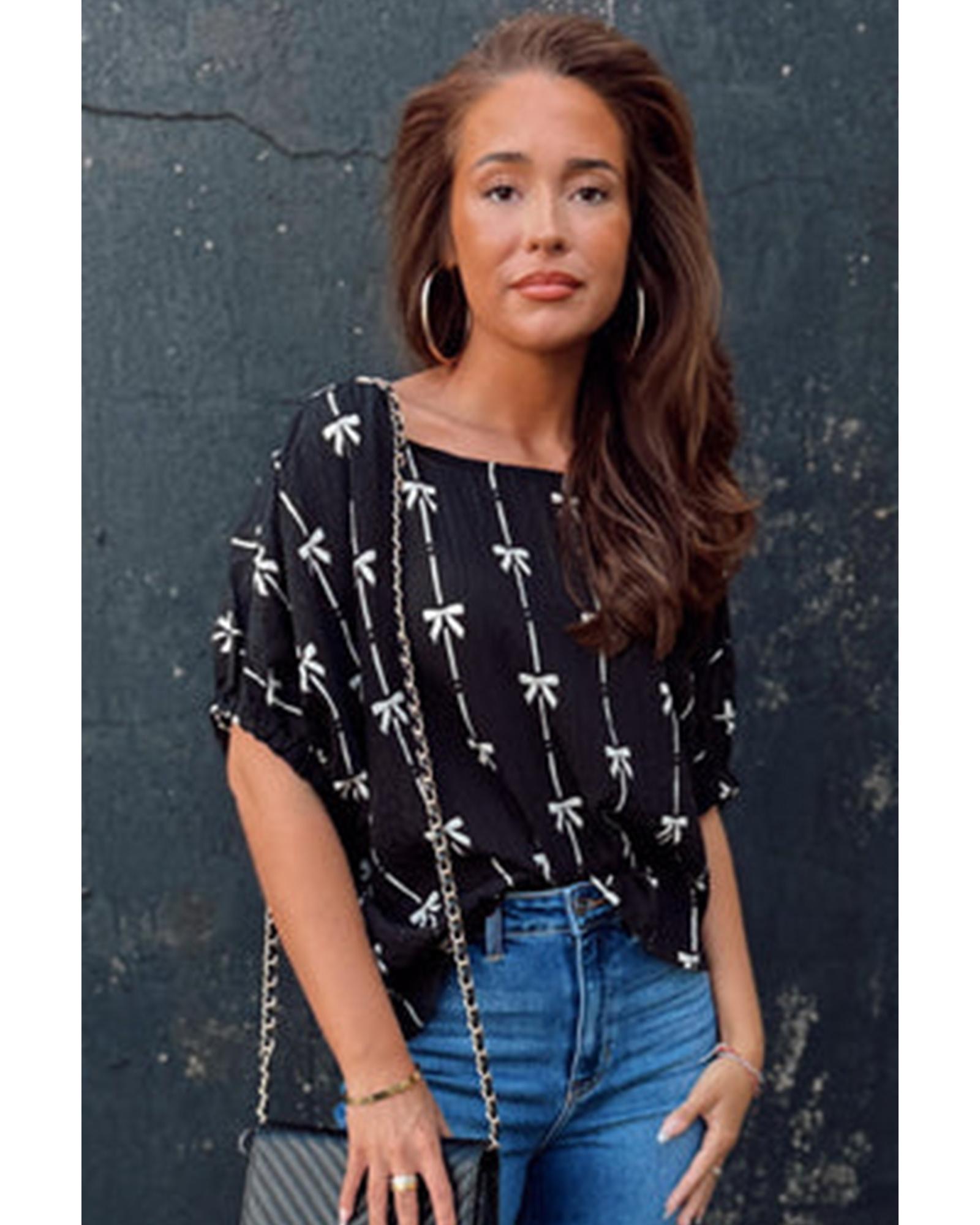 Black Bow Print Puff Short Sleeve Top – L