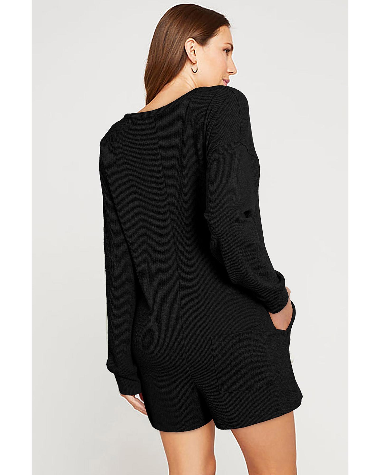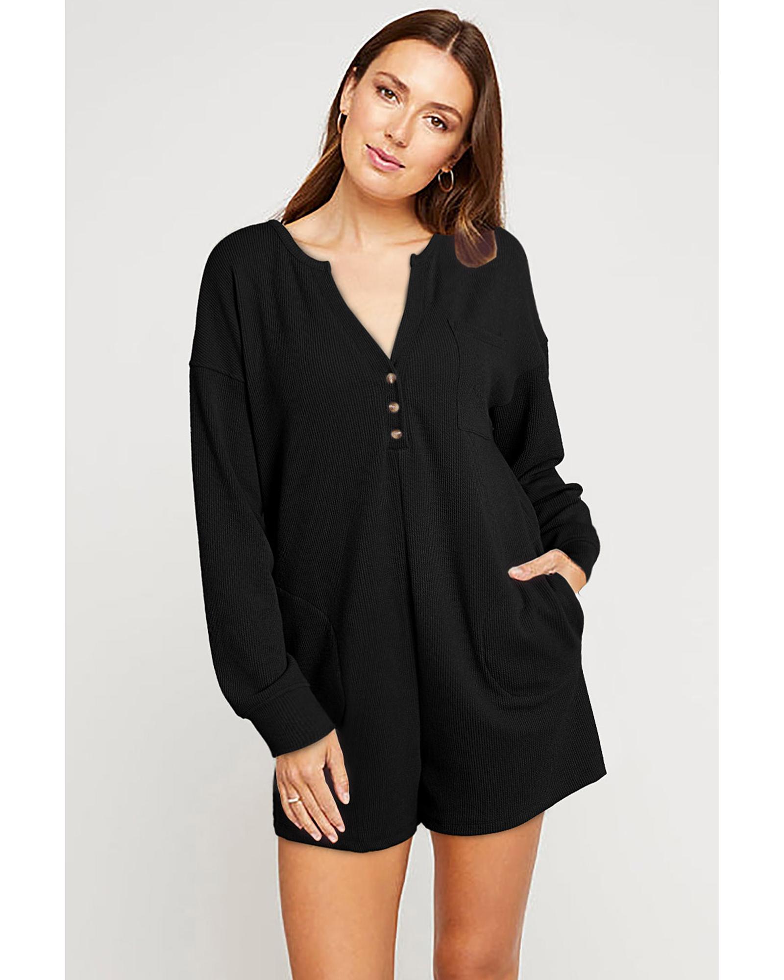 Black Brushed Ribbed Button Split V Neck Long Sleeve Romper – S