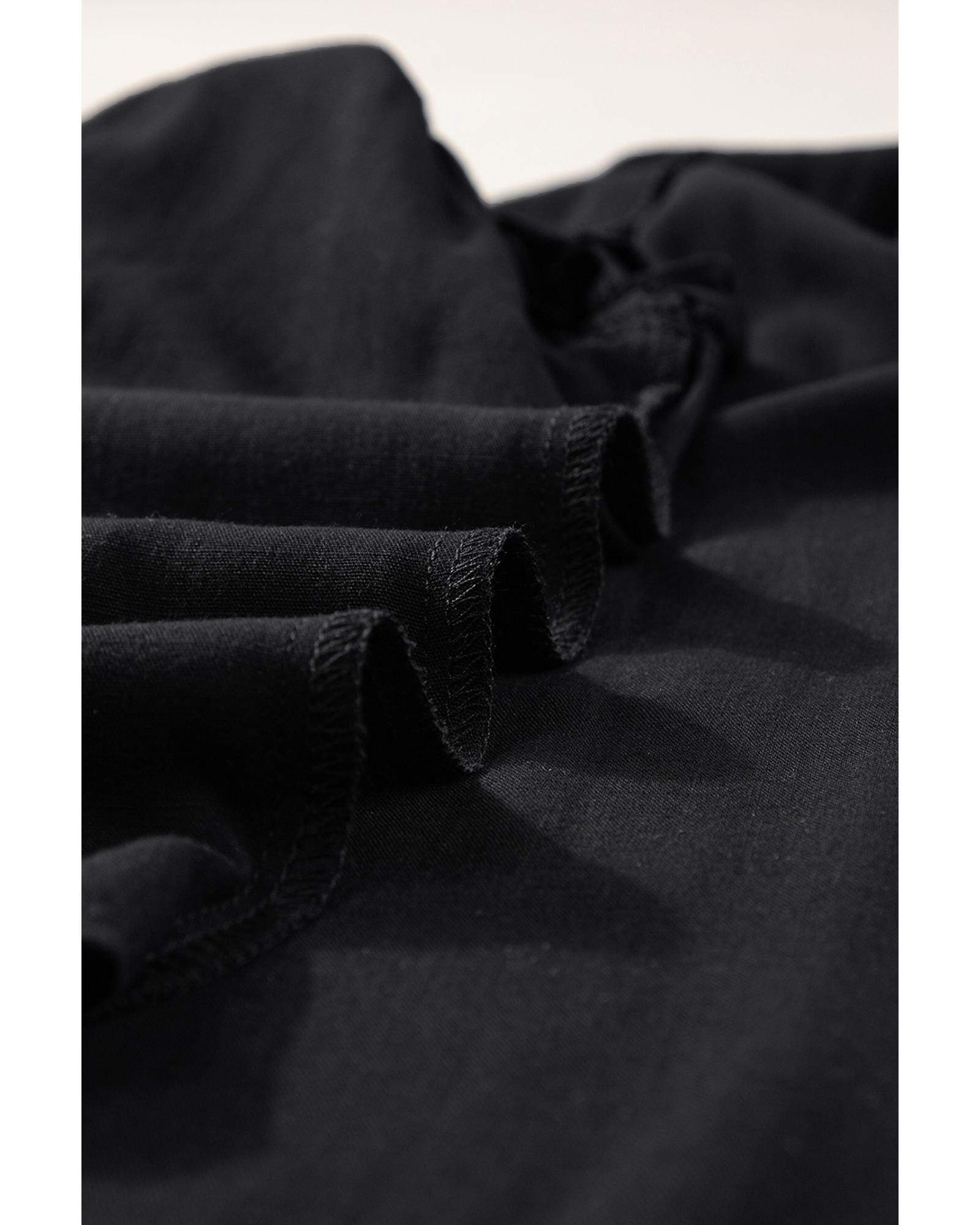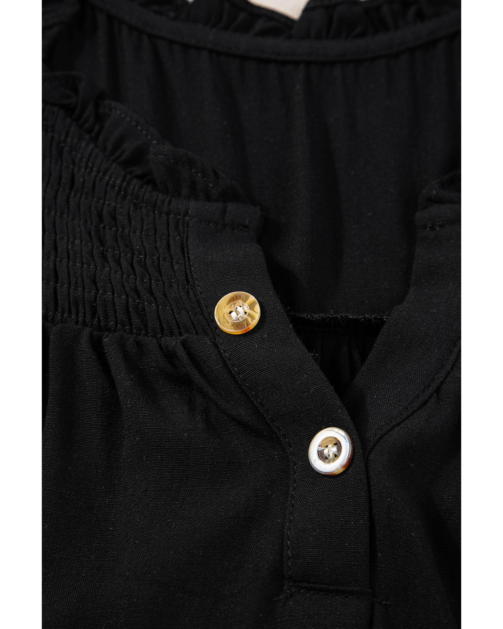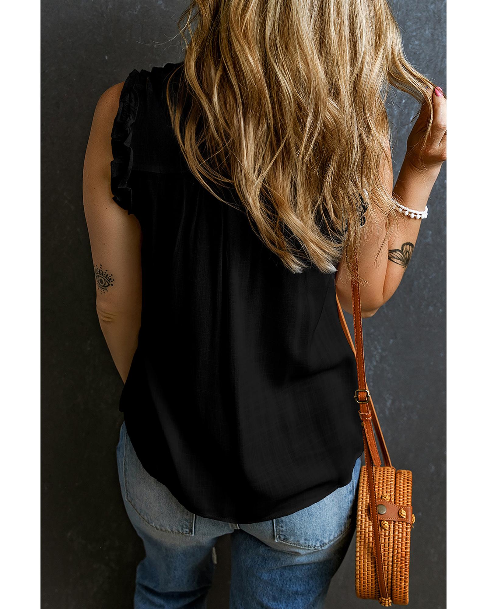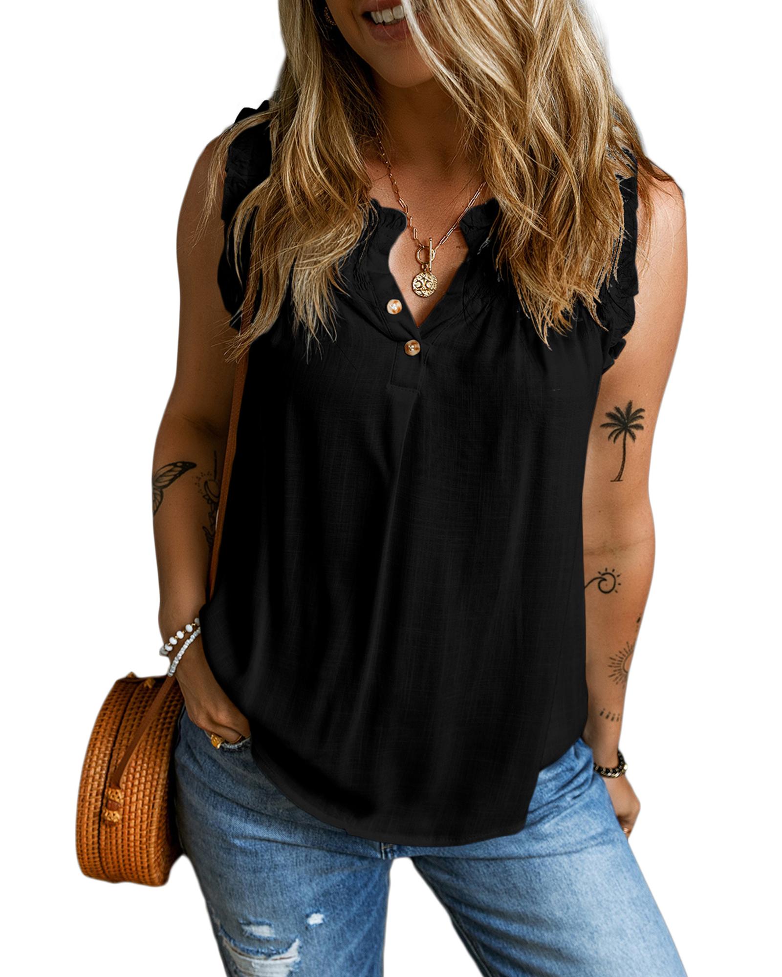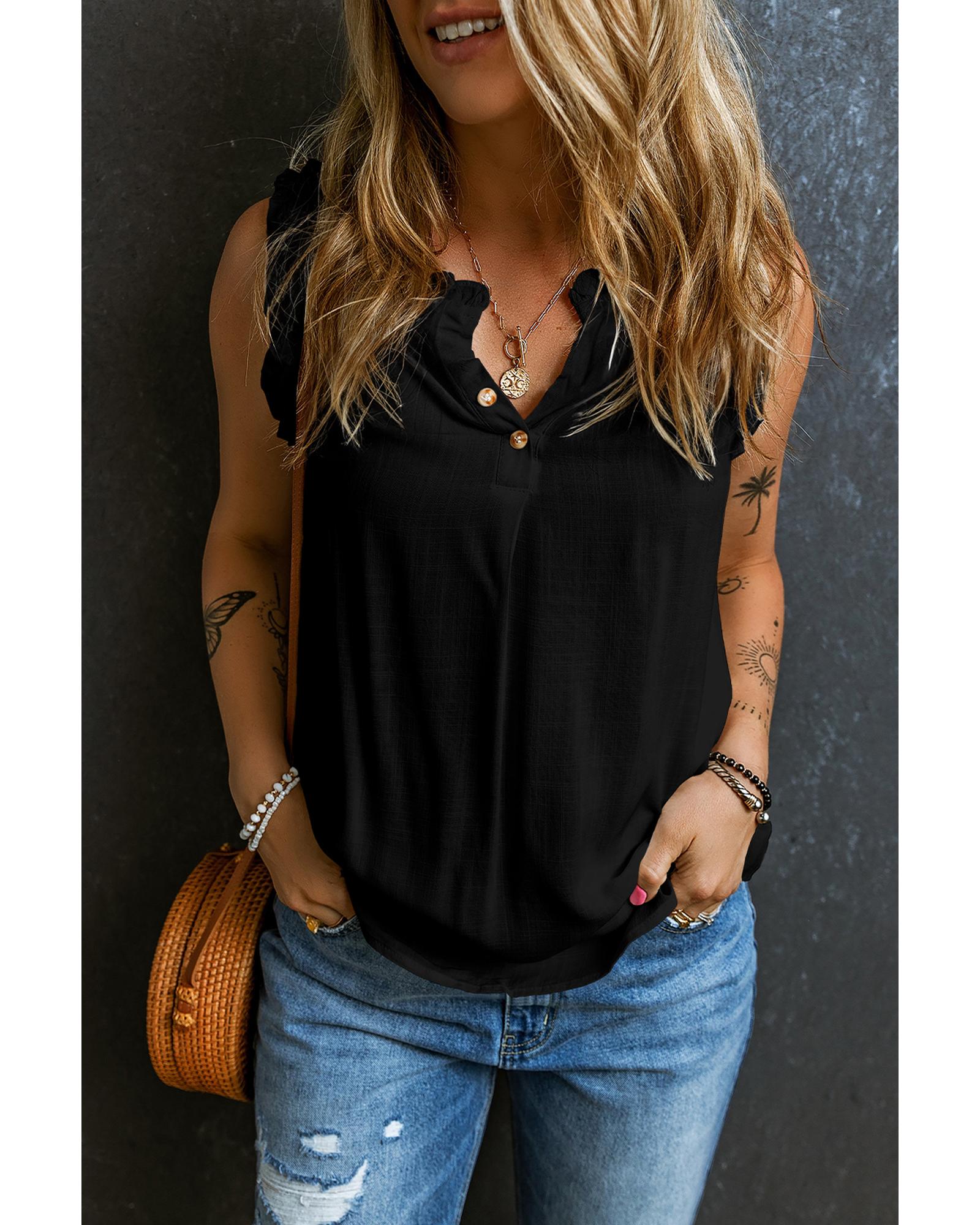 Black Button Split Neck Ruffled Trim Tank Top – XL