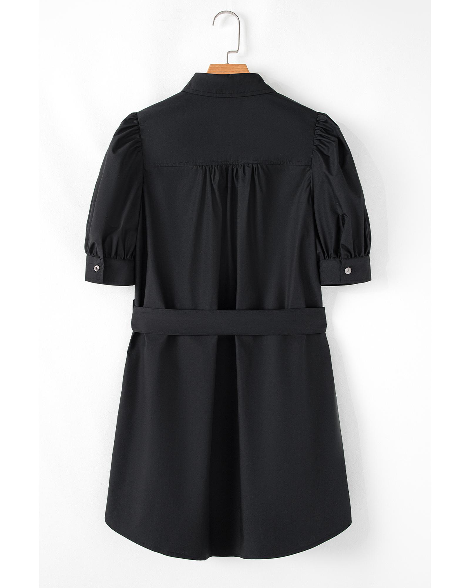 Black Button Up Tie Waist Puff Sleeve Mini Dress – L
