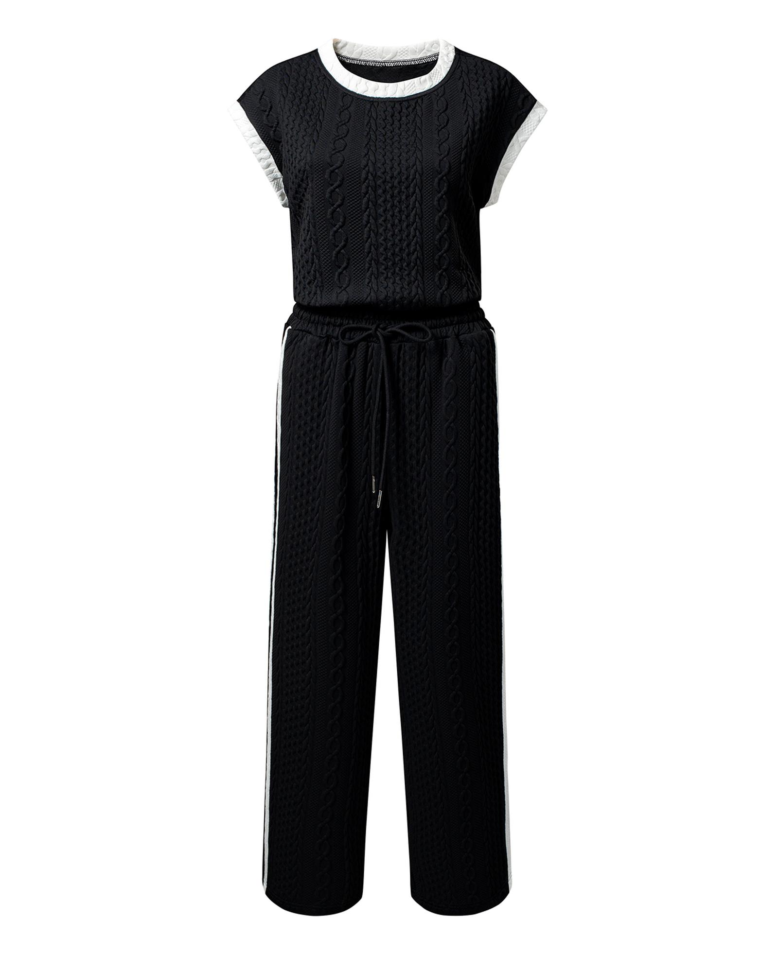 Black Cable Knit Contrast Trim Short Sleeve Top and Pants Set – M