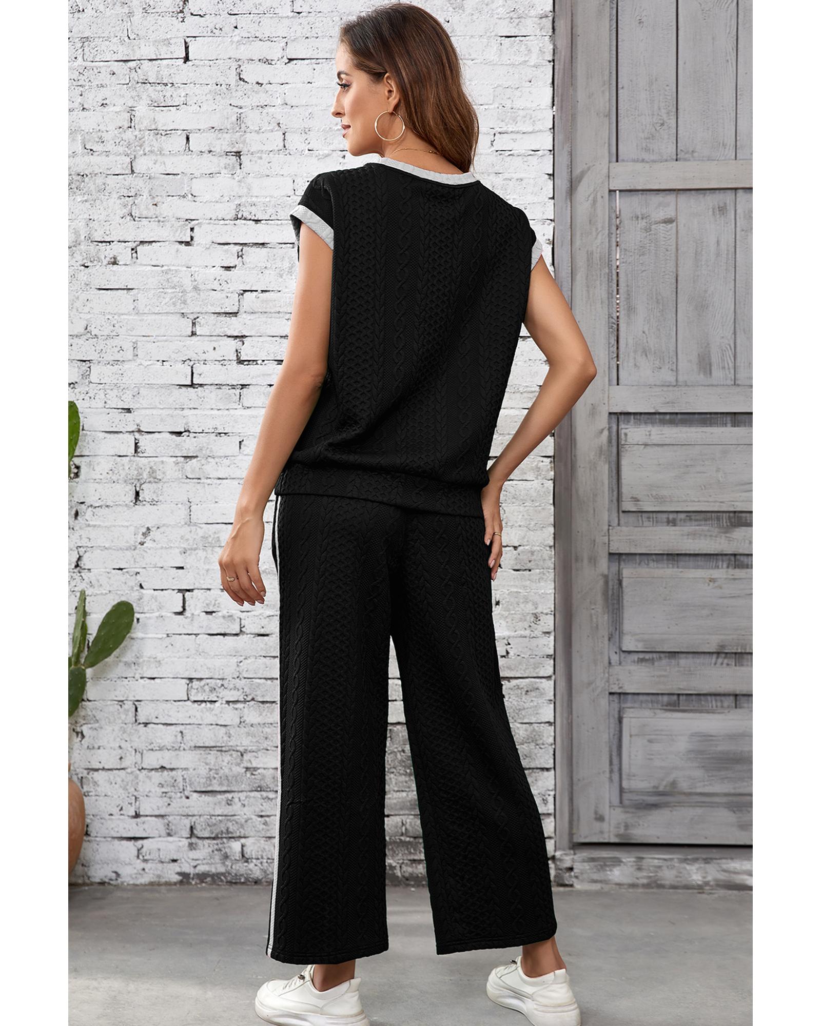 Black Cable Knit Contrast Trim Short Sleeve Top and Pants Set – S