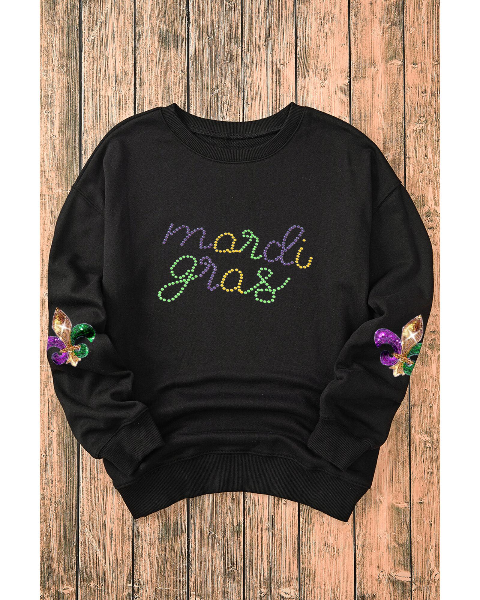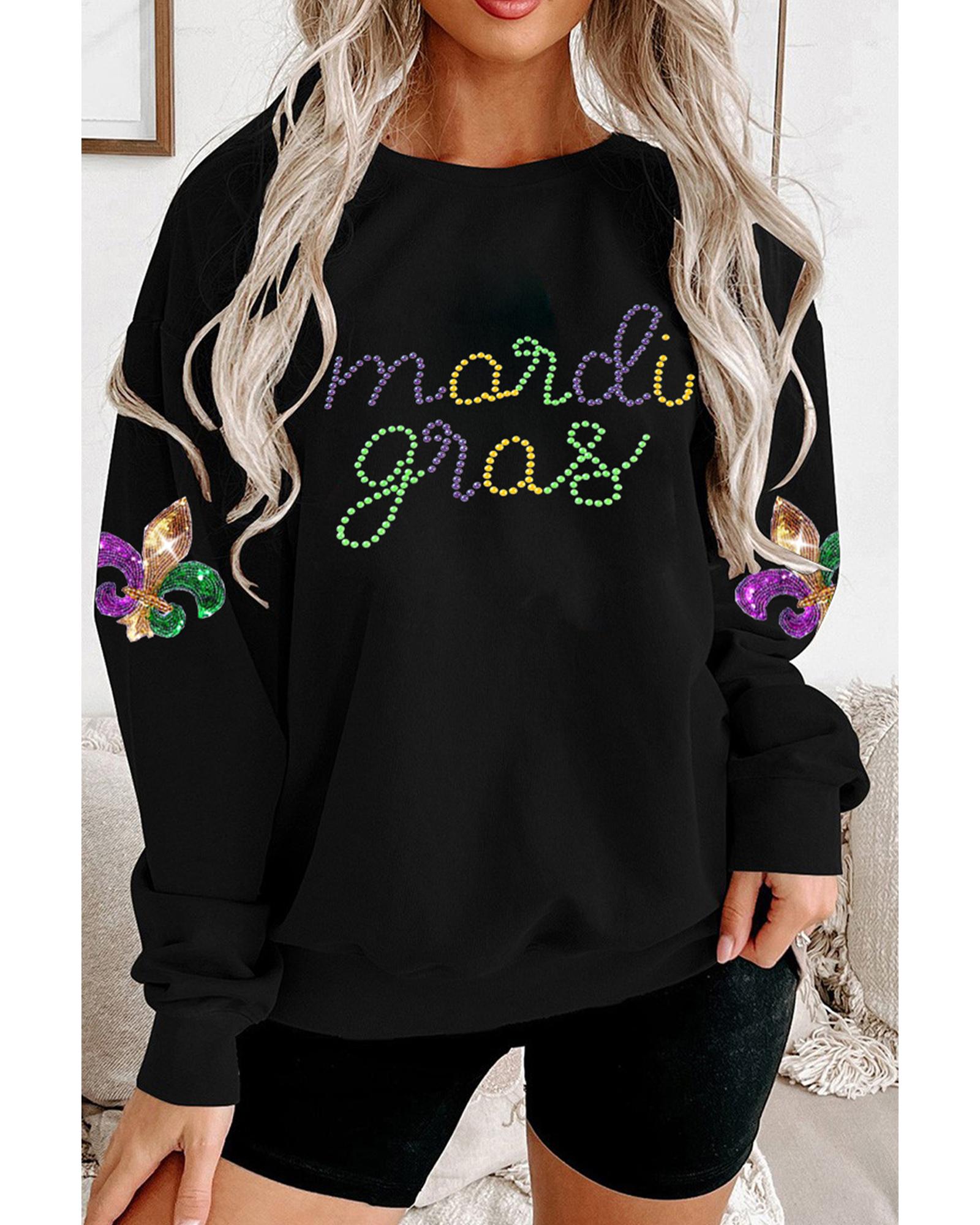 Black Ceramic Rhinestone mardi gras Letter Graphic Sweatshirt – S