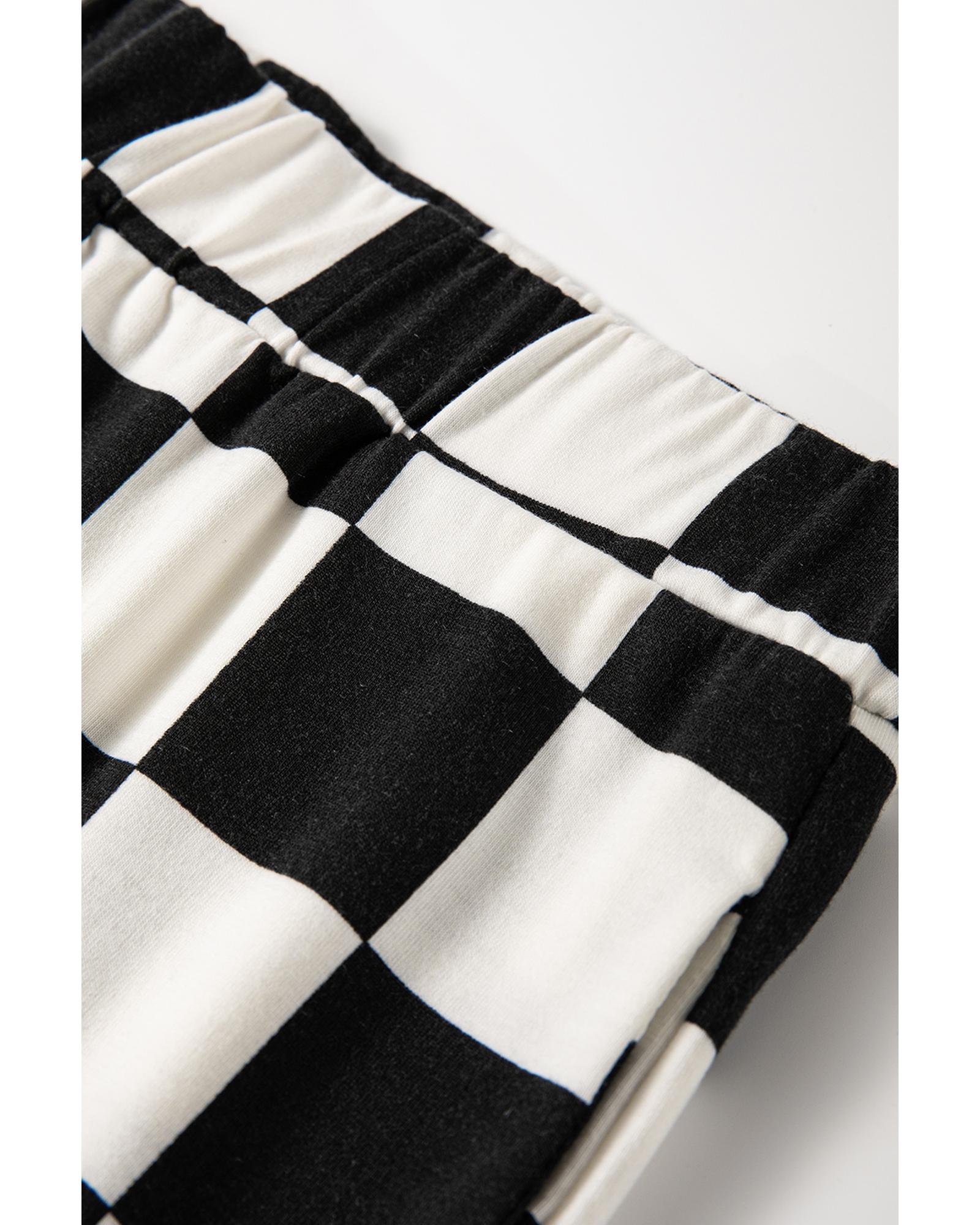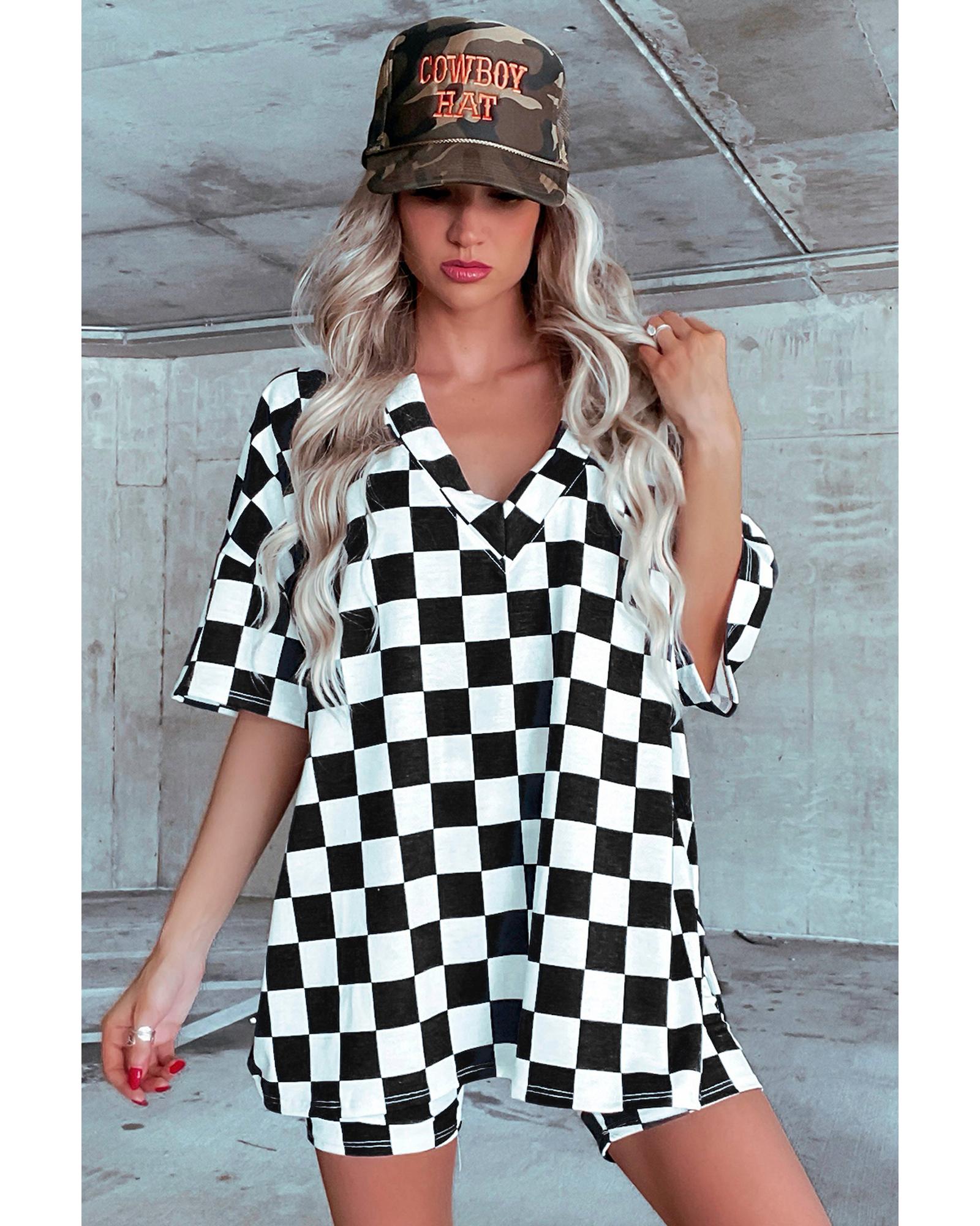 Black Checkerboard Print V Neck Loose Tee and Shorts Lounge Set – L