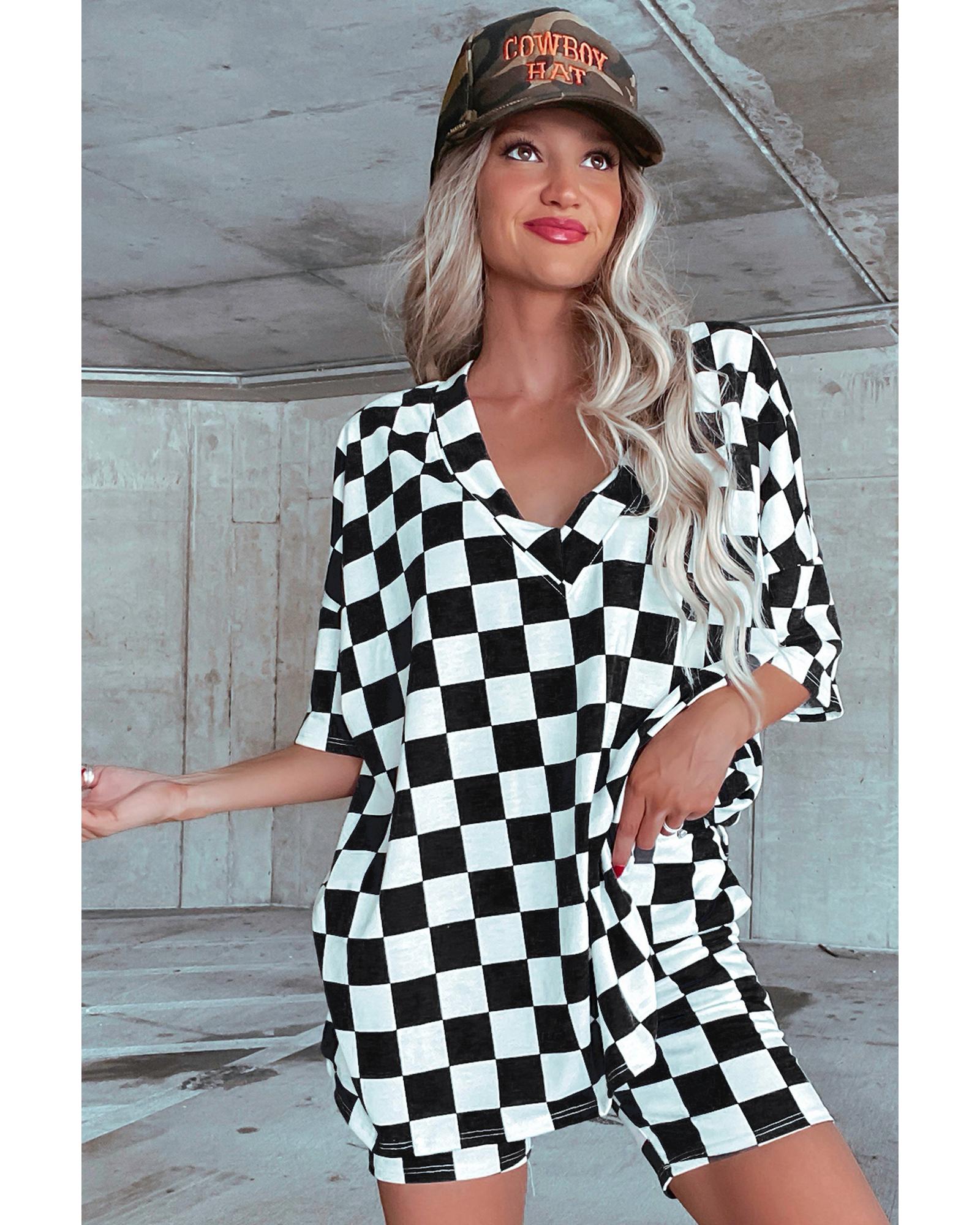 Black Checkerboard Print V Neck Loose Tee and Shorts Lounge Set – XL