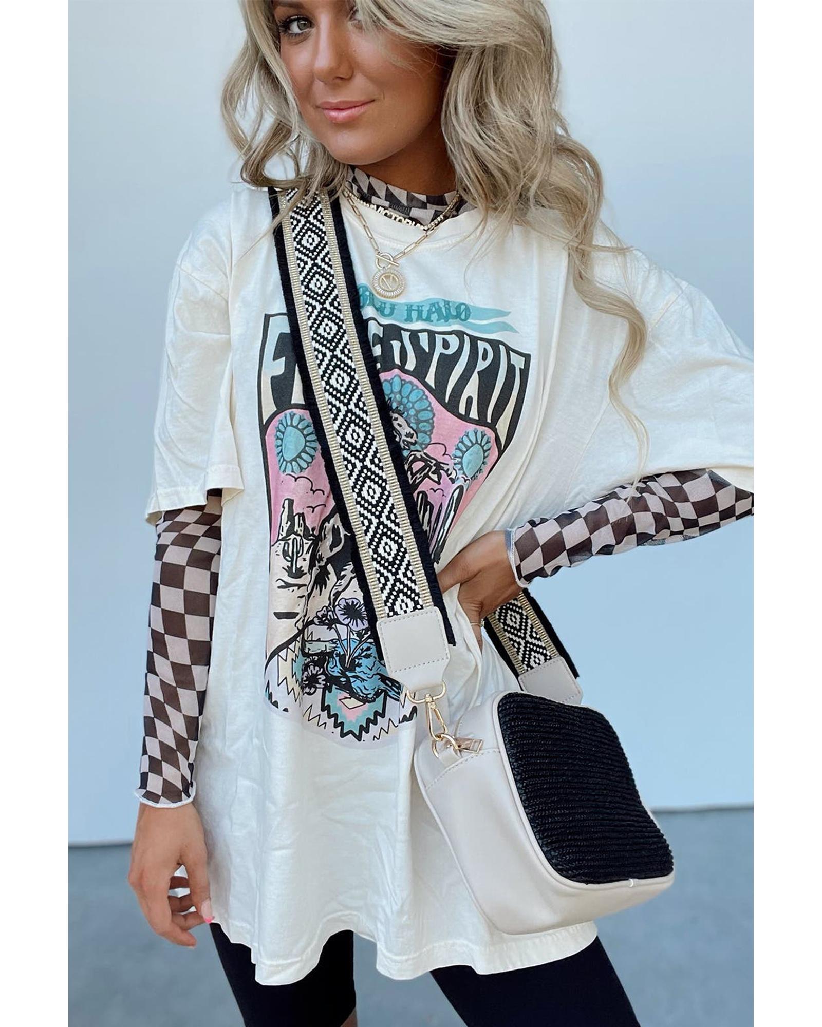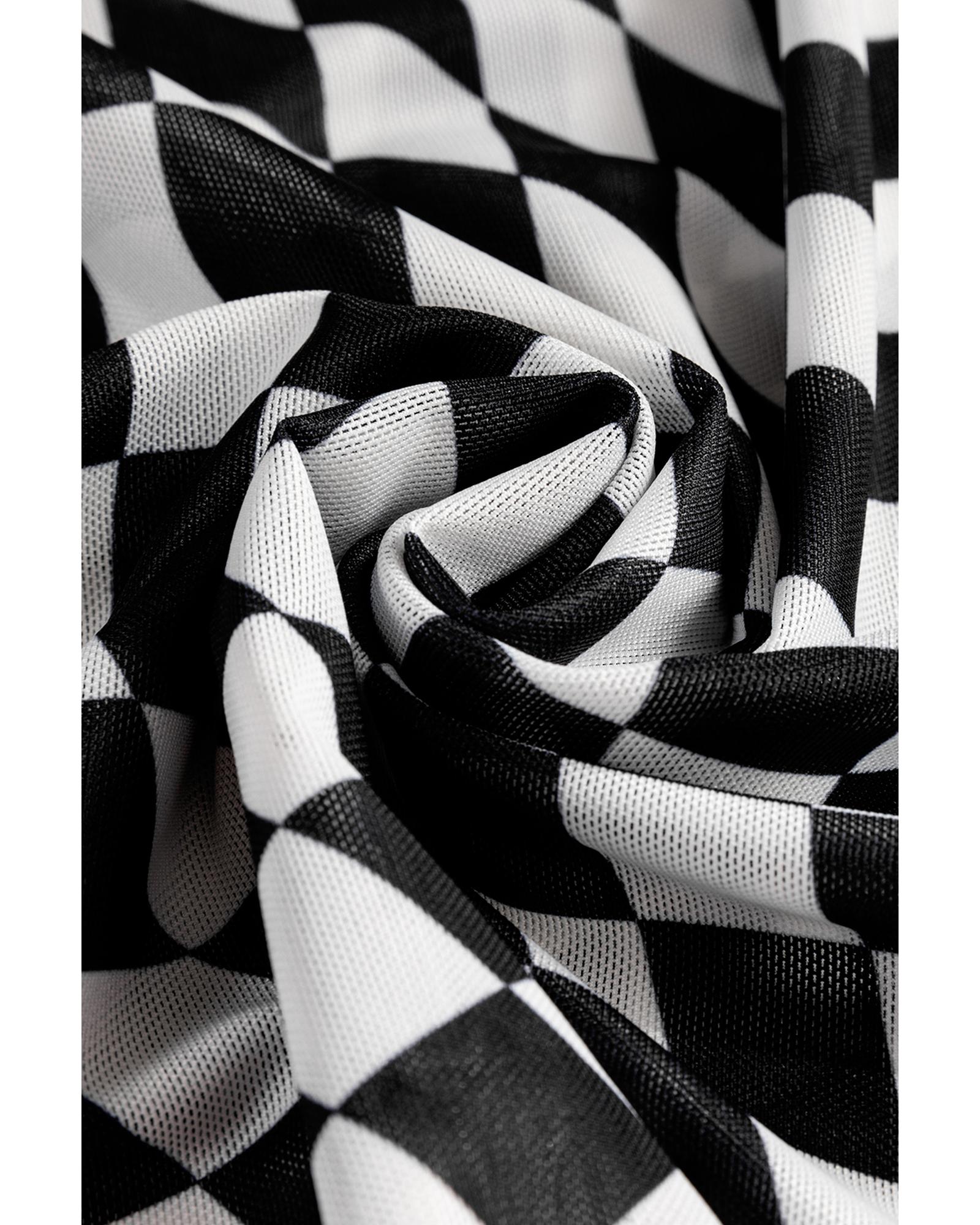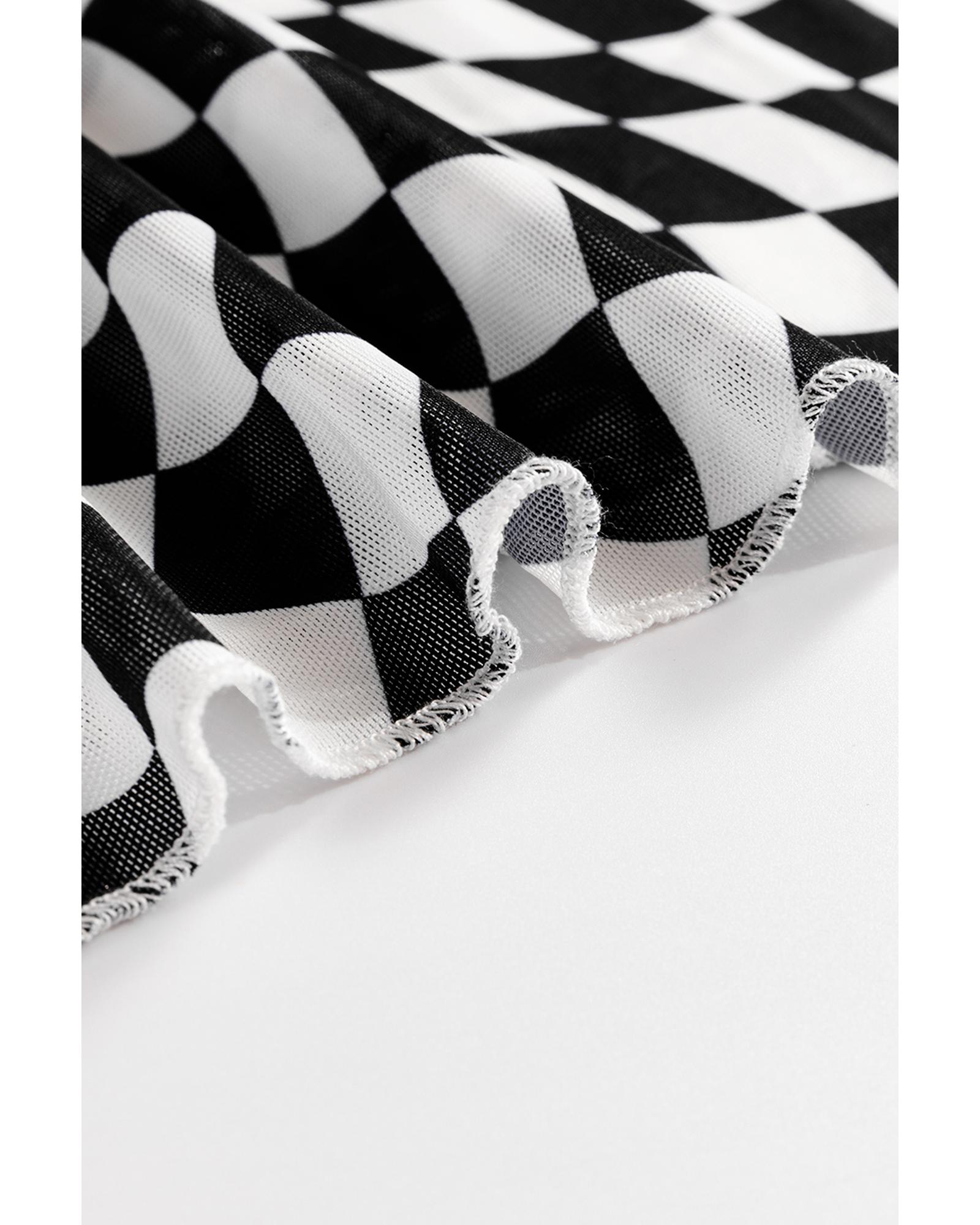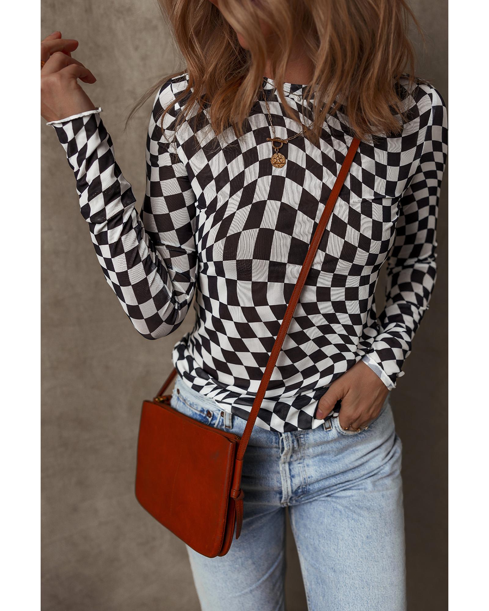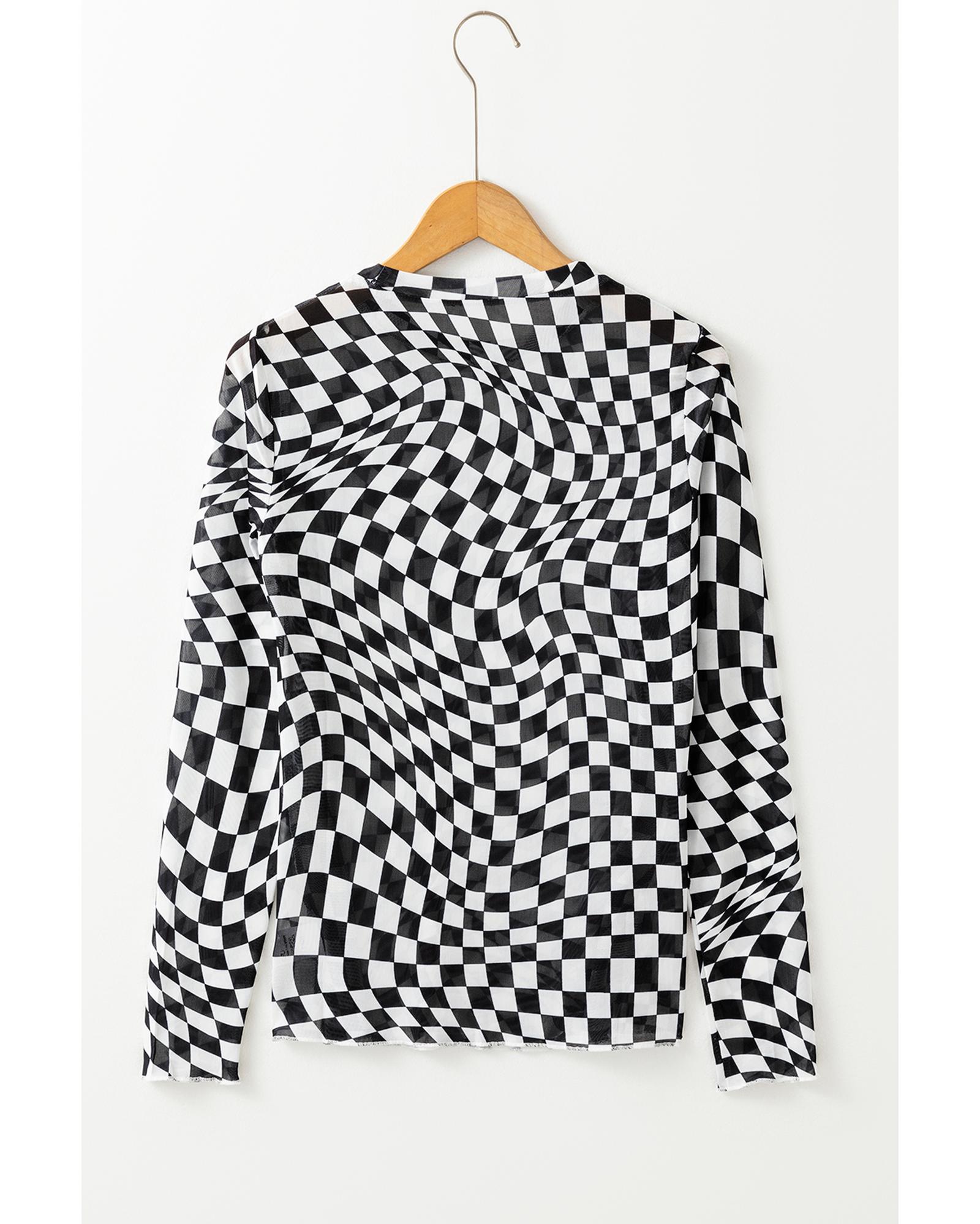 Black Checkered Pattern Mesh Mock Neck Long Sleeve Top – S