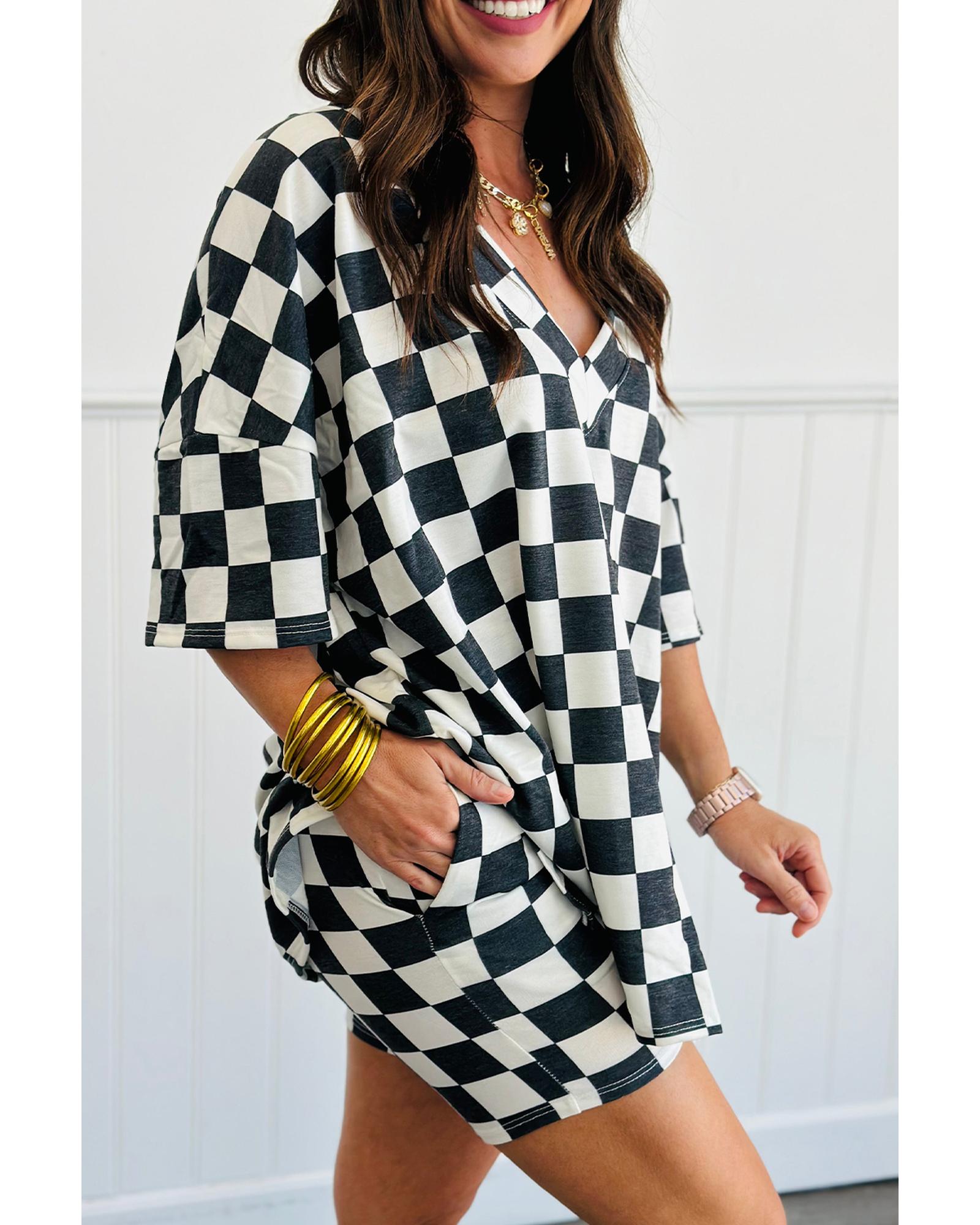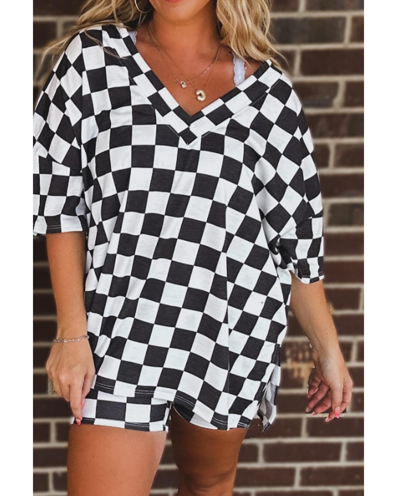Black Checkered Pattern Tee and Shorts Plus Size Two Piece Set - 3X