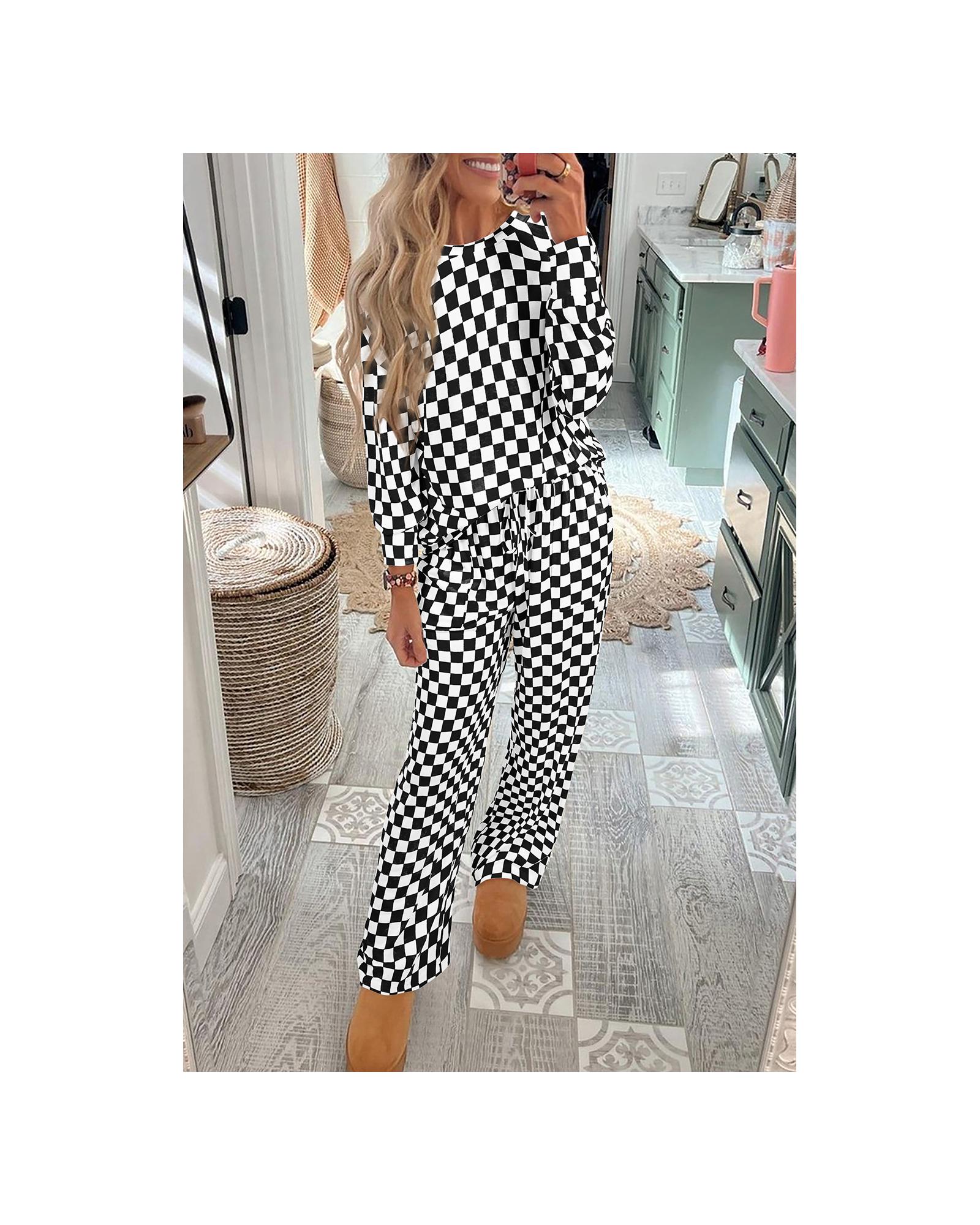 Black Checkered Print Long Sleeve Top and Pants Lounge Set – XL